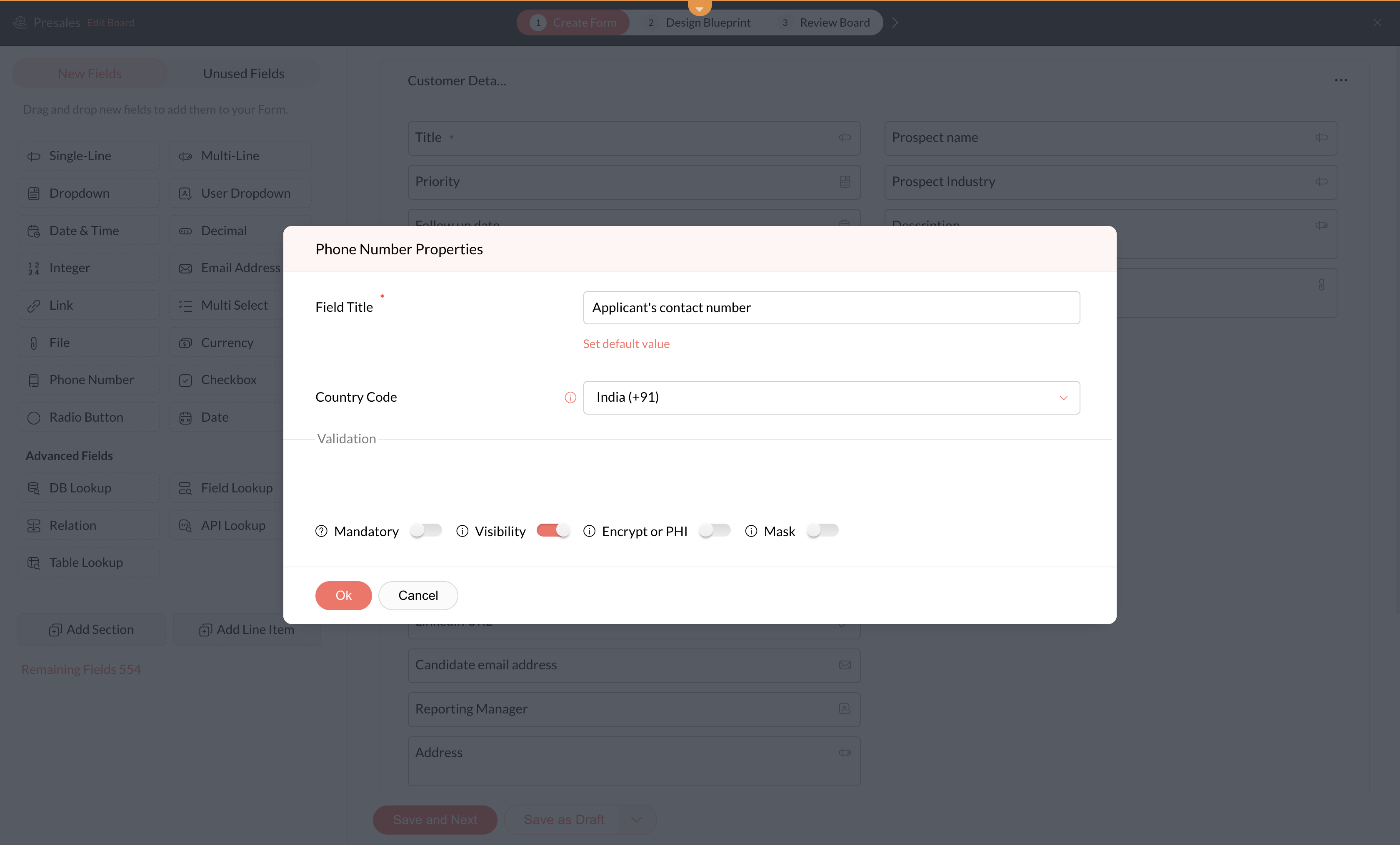 - Drag and drop the Phone Number field from the New Fields tray onto the right panel.