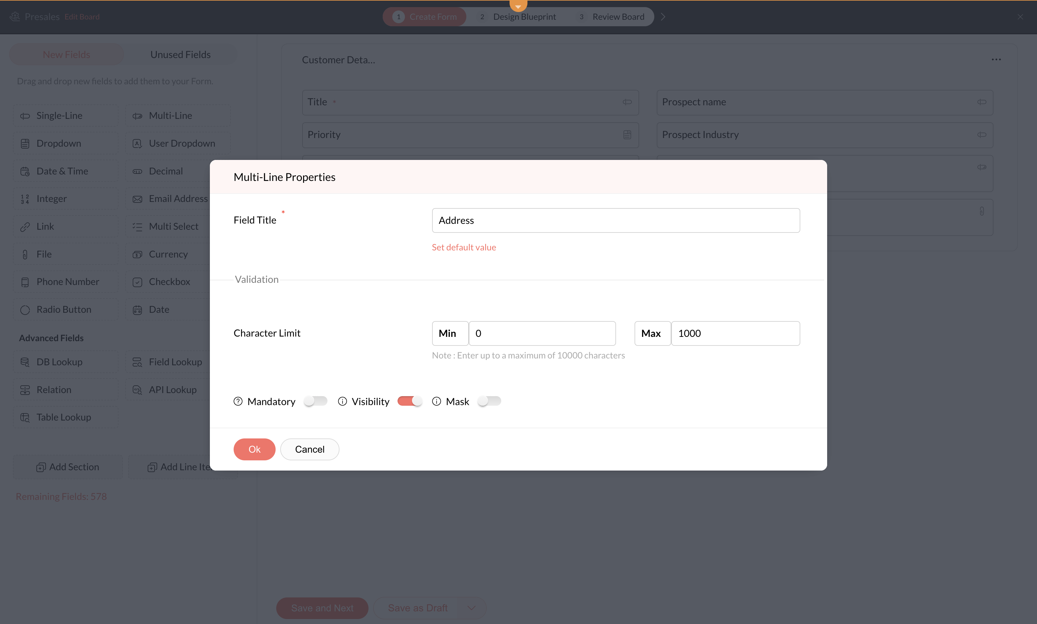- Drag and drop the Multi-Line field from the New Fields tray onto the right panel.