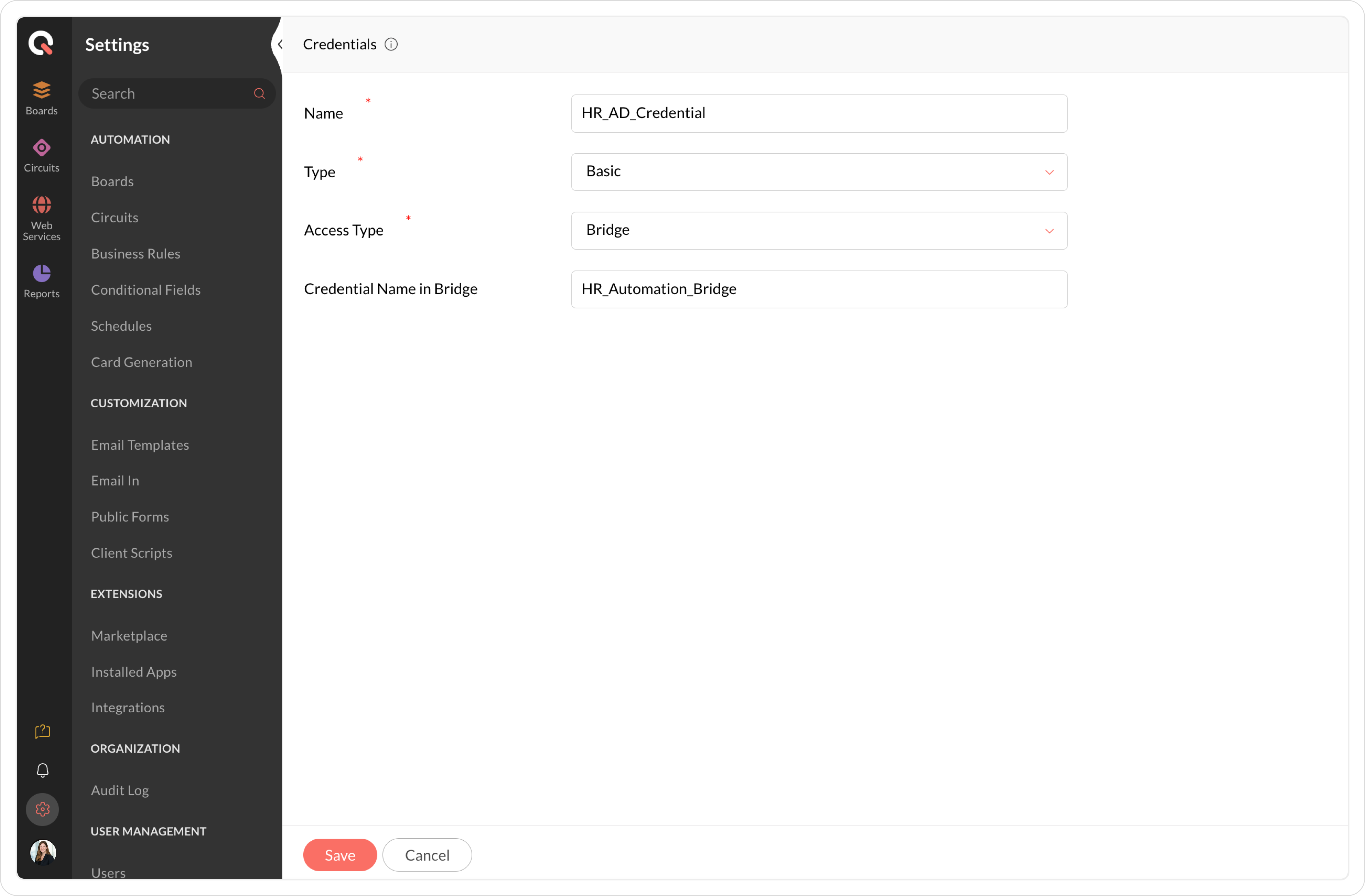 Users have the flexibility to create and store credentials within their Qntrl cloud account or on-premise system via the Bridge agent, based on organizational preferences.