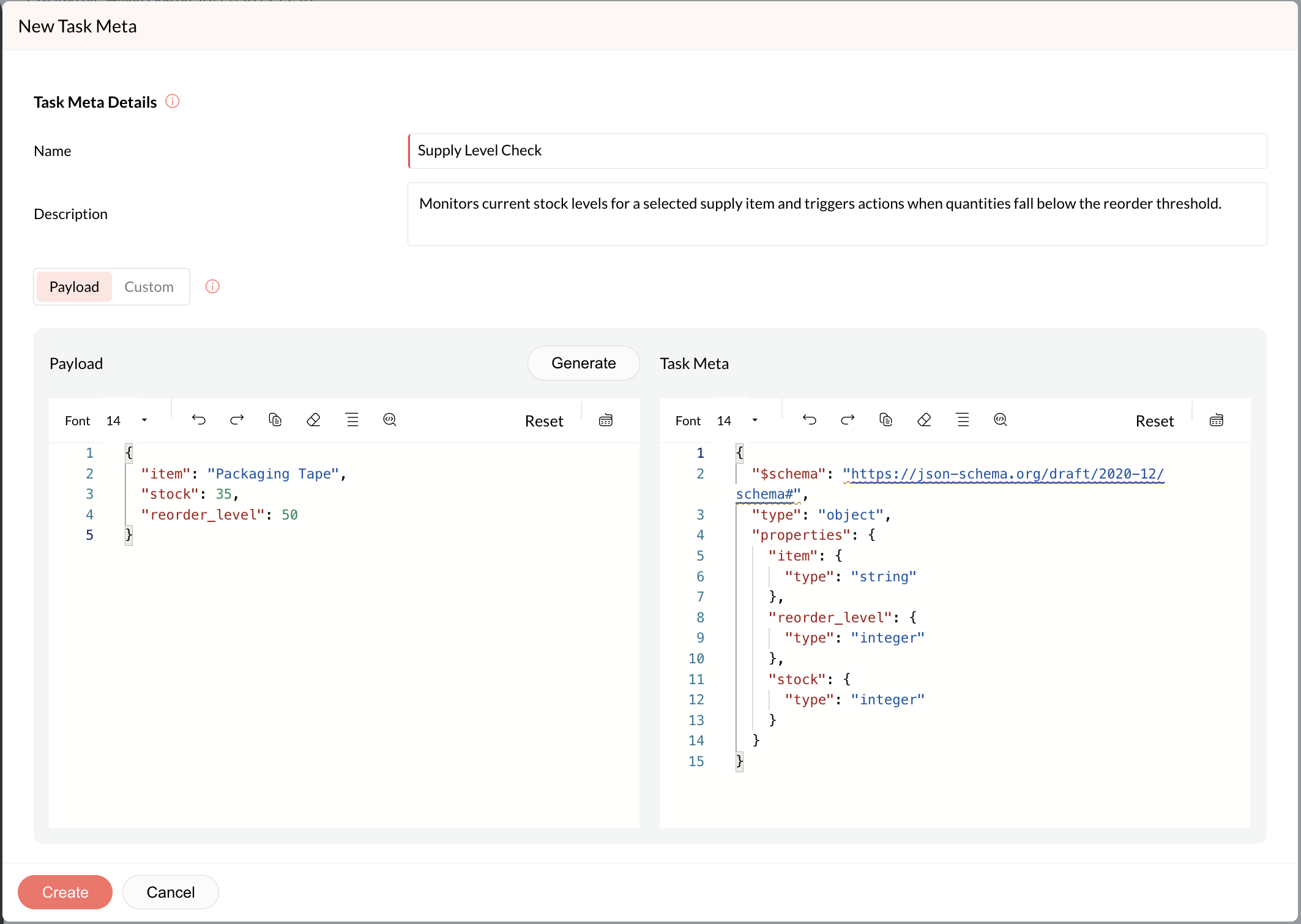 Task Meta: Available for JAR-type modules. Defines the payload JSON used to validate incoming payloads or generate form builders. Refer to the Task Meta section for more details.