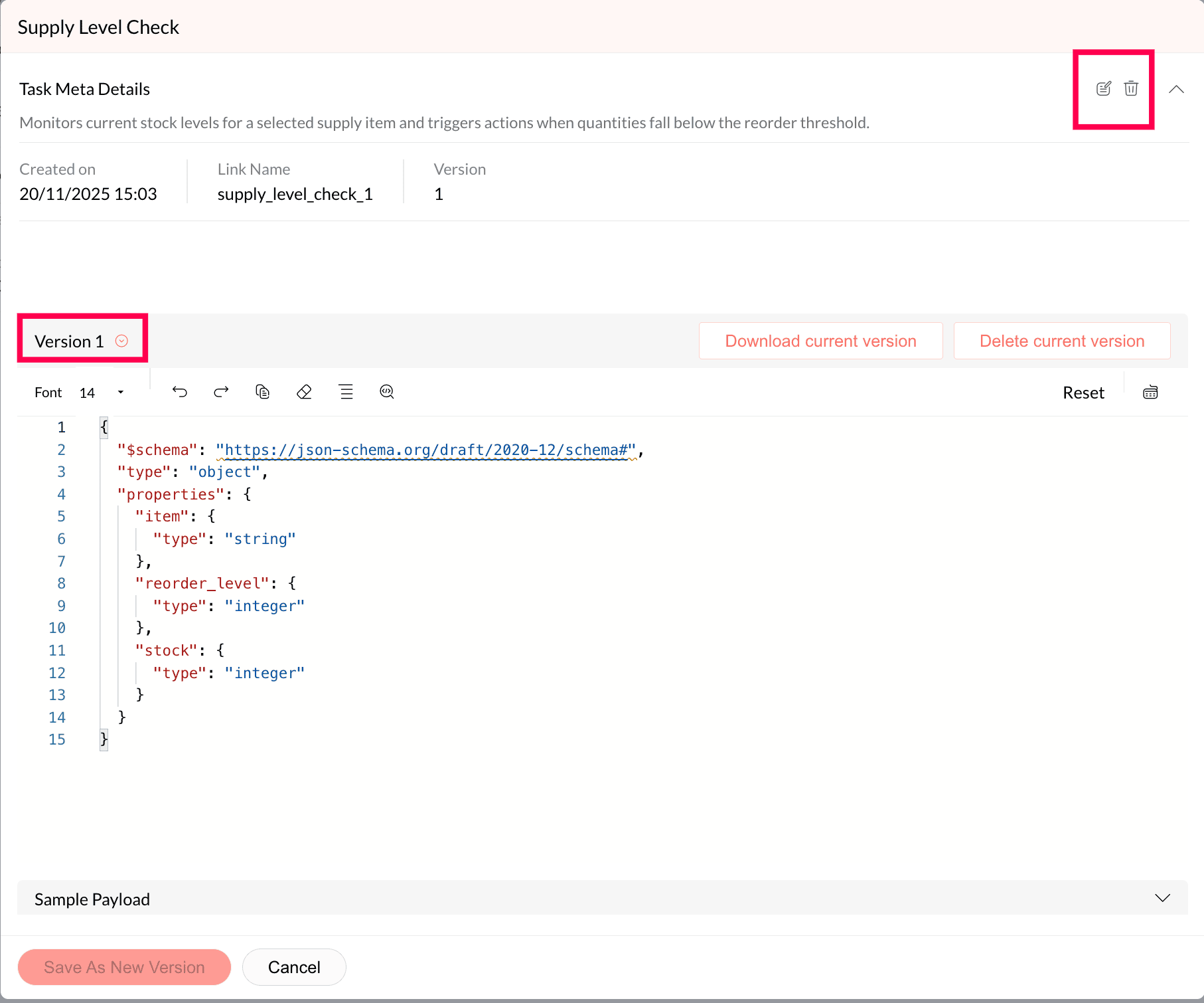 Version : Each Task Meta maintains version history. Every update creates a new version. Use the Version dropdown to switch between versions.