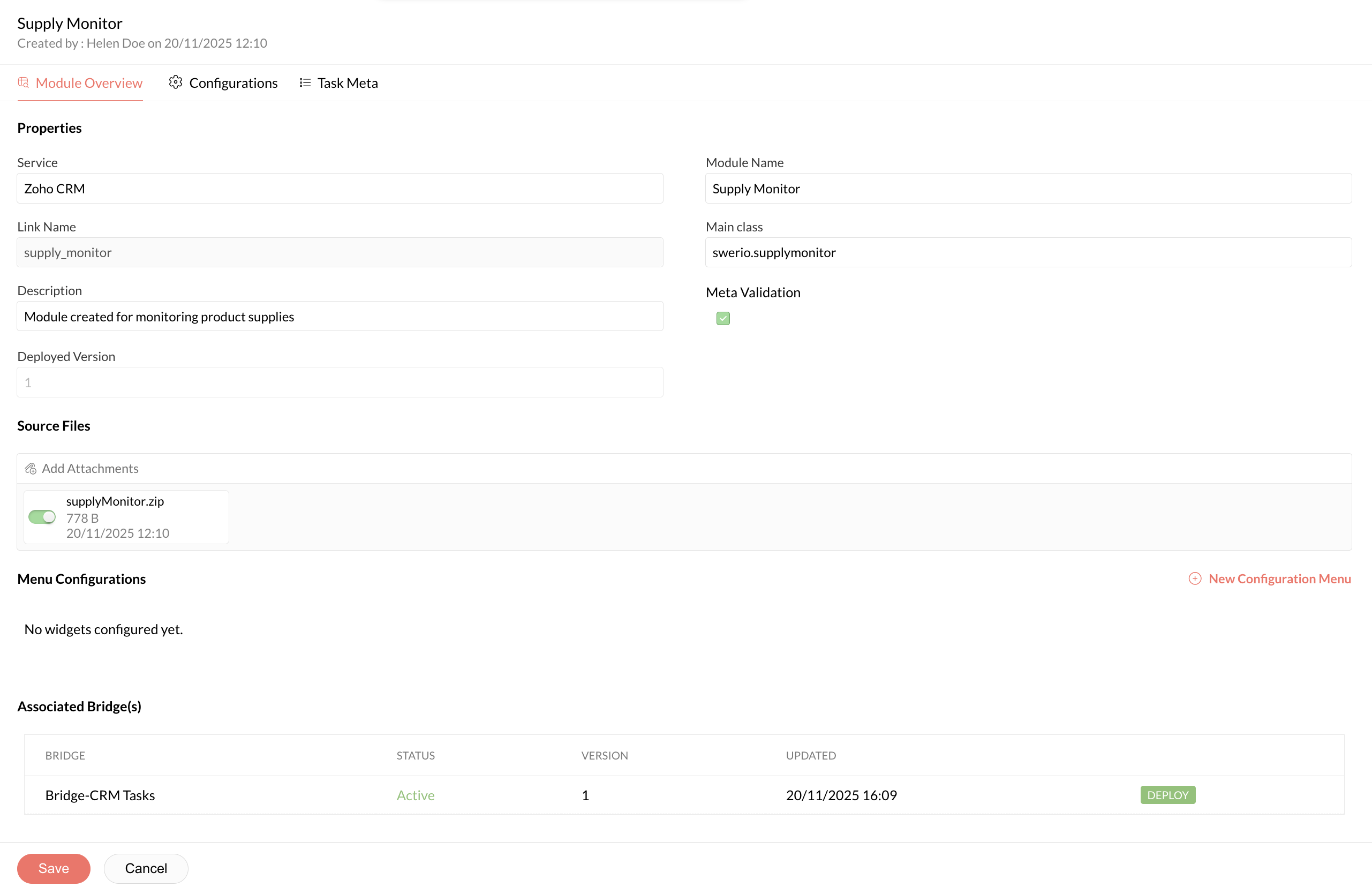 The Task Meta section appears in the Custom Module page only when the module type is set to JAR.Click the Module Overview section of the selected module. The details of the chosen custom module are displayed here, allowing you to configure and manage its properties.