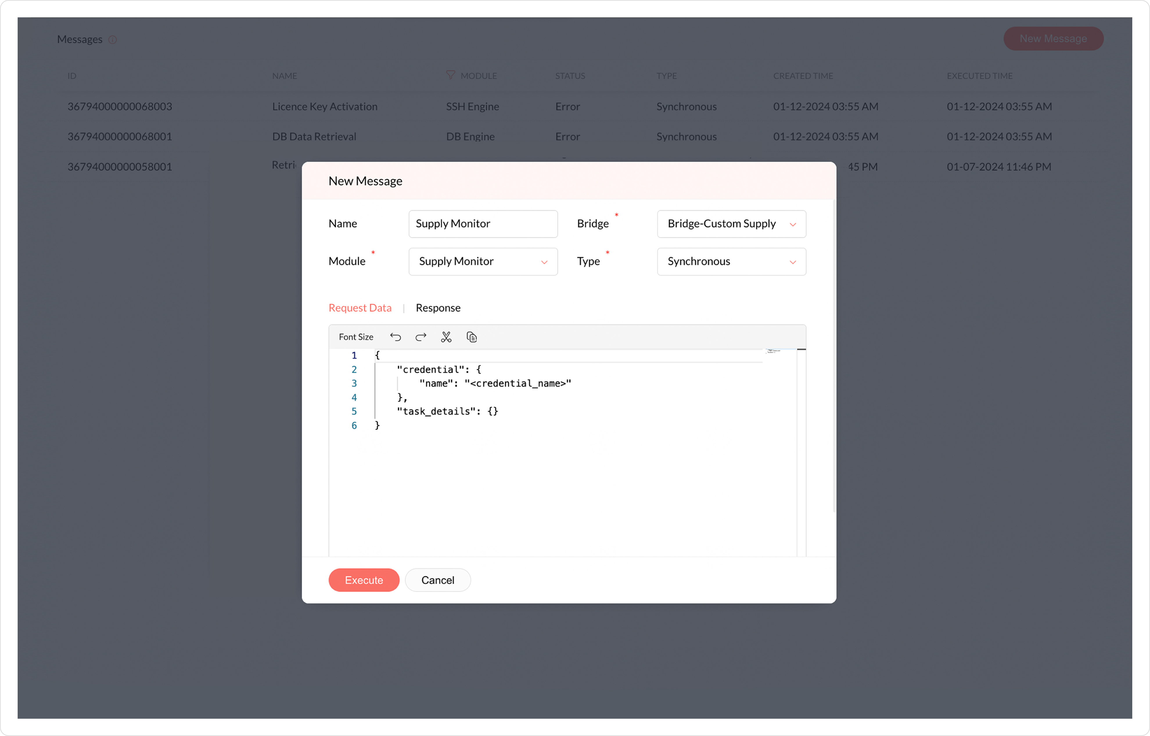 Request Data: The instructions to be executed by the bridge need to be given here in JSON format. Based on the custom module chosen, the request data format will vary.