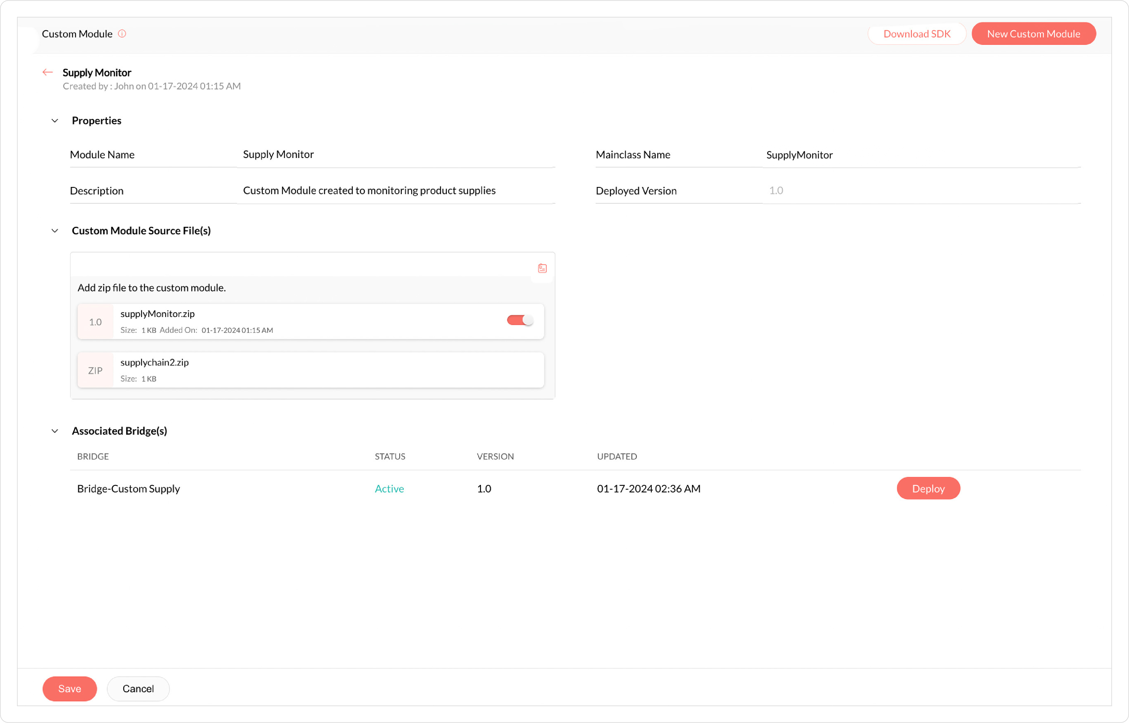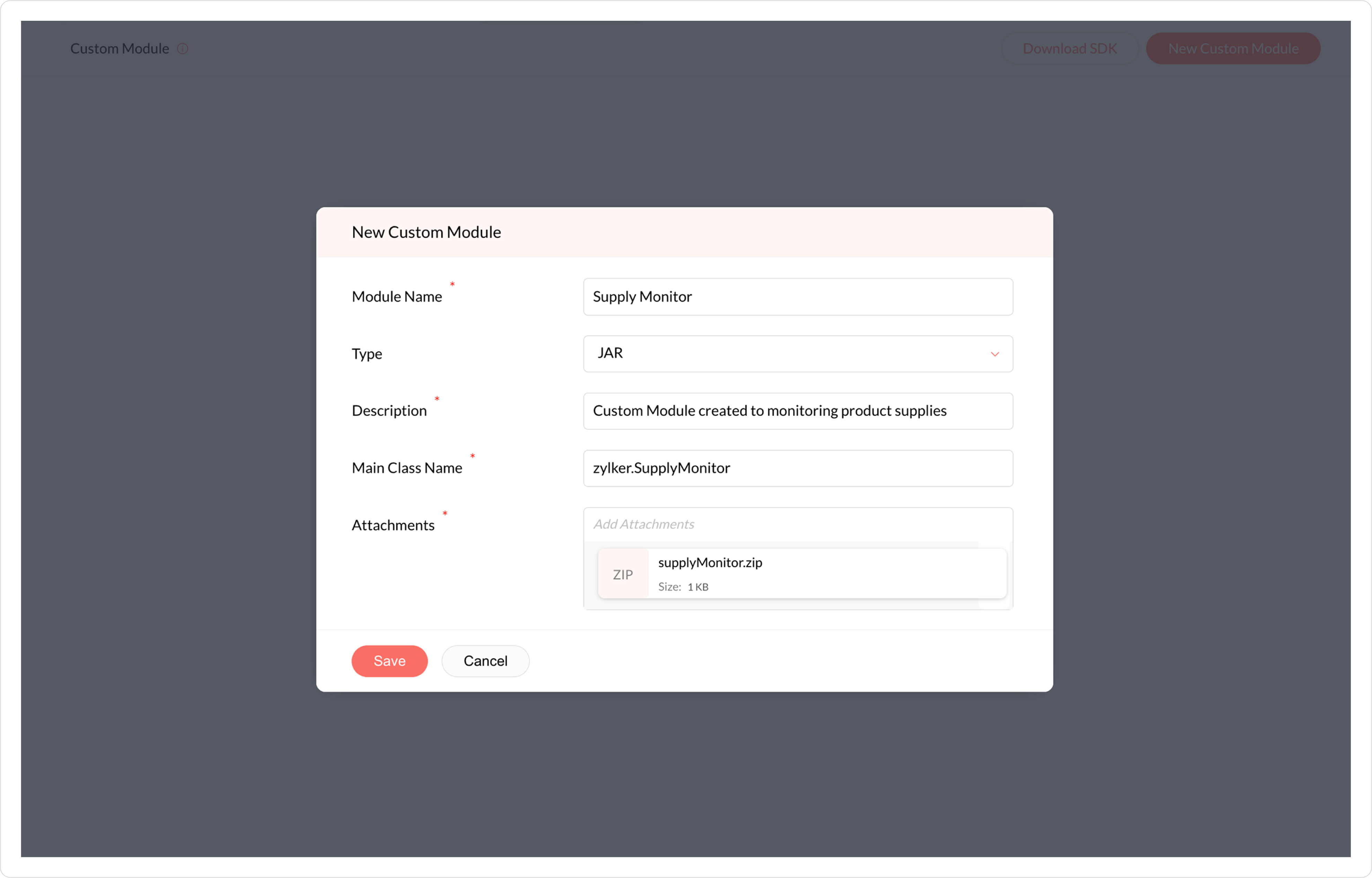 Once the custom module implementation is ready, compile the project and create it as a JAR file. Once created, compress the created Jar file into a zip file. This zip file is used while creating a custom module.