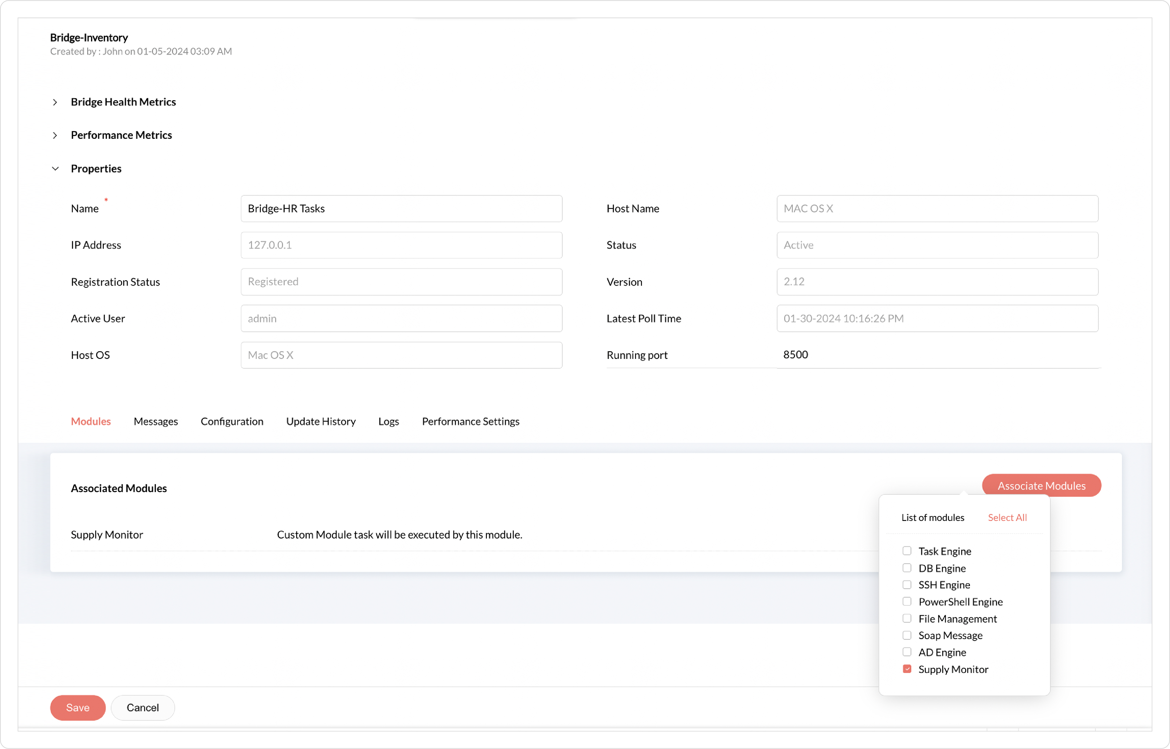 Support for REST API services in custom modules allows end users to develop their own REST API modules in their preferred format. Upon deployment, these REST API endpoints will be published on the Bridge server.