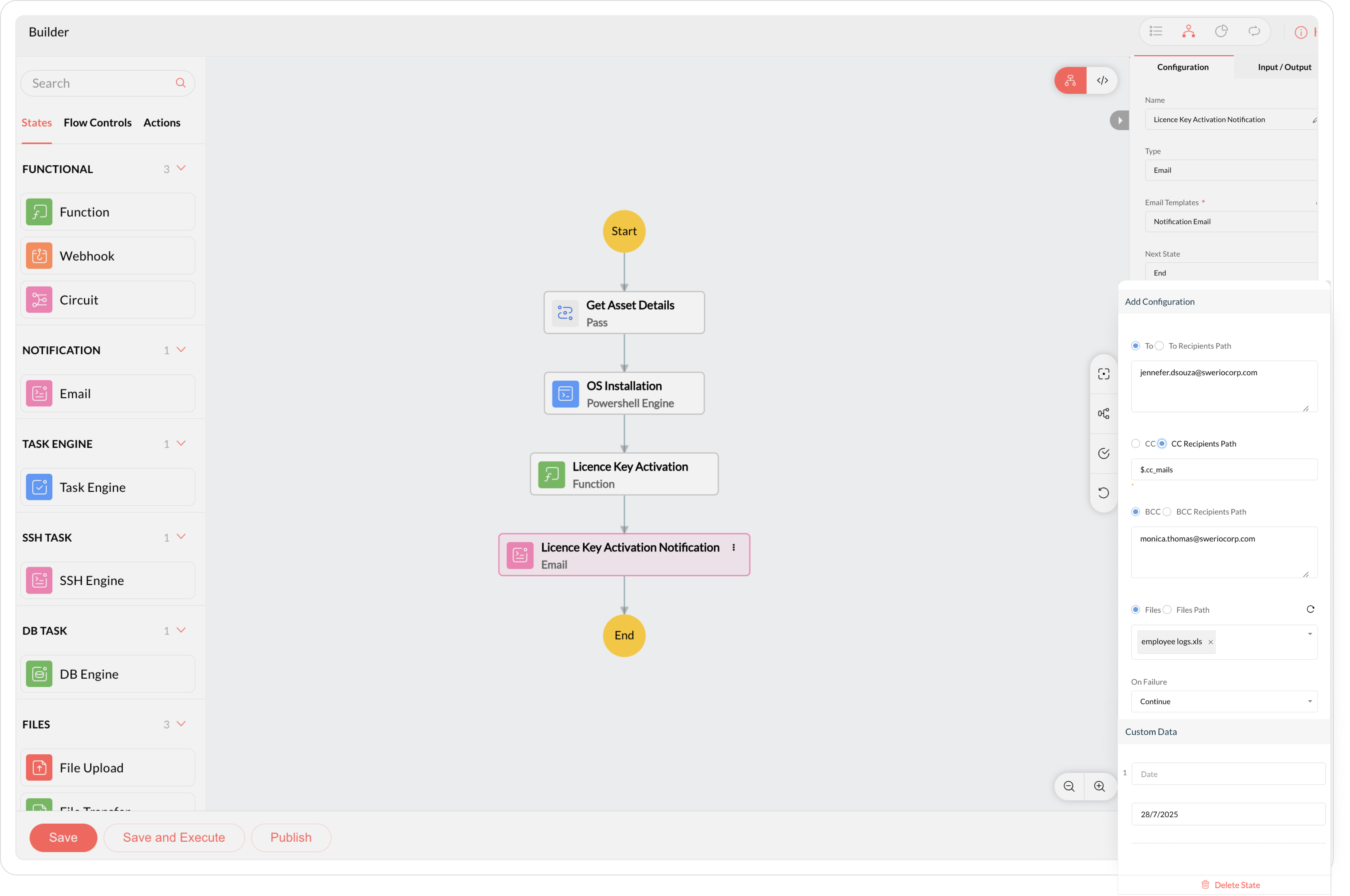 In an employee asset allocation circuit, after a license key is activated using a Function state, the Email state can automatically send a notification to the employee and IT team. This email can include details like the software name, license key, and activation date, helping keep everyone informed without manual effort.