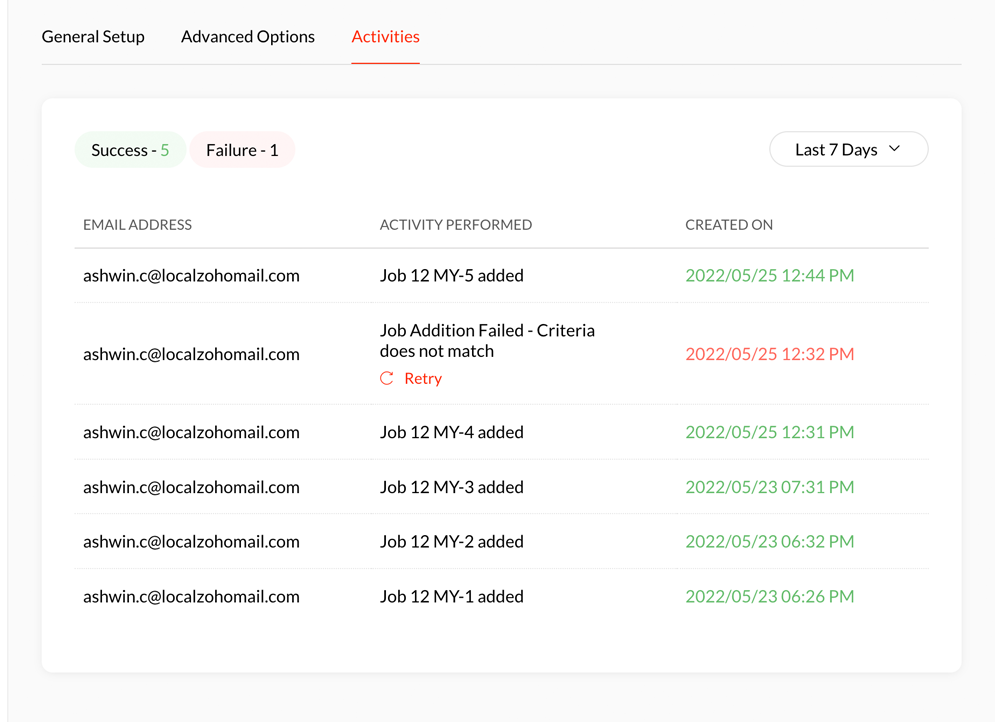 - Activities : This section serves as an audit log for Email In. You can view the status of cards created and comments posted via Email In for each board.