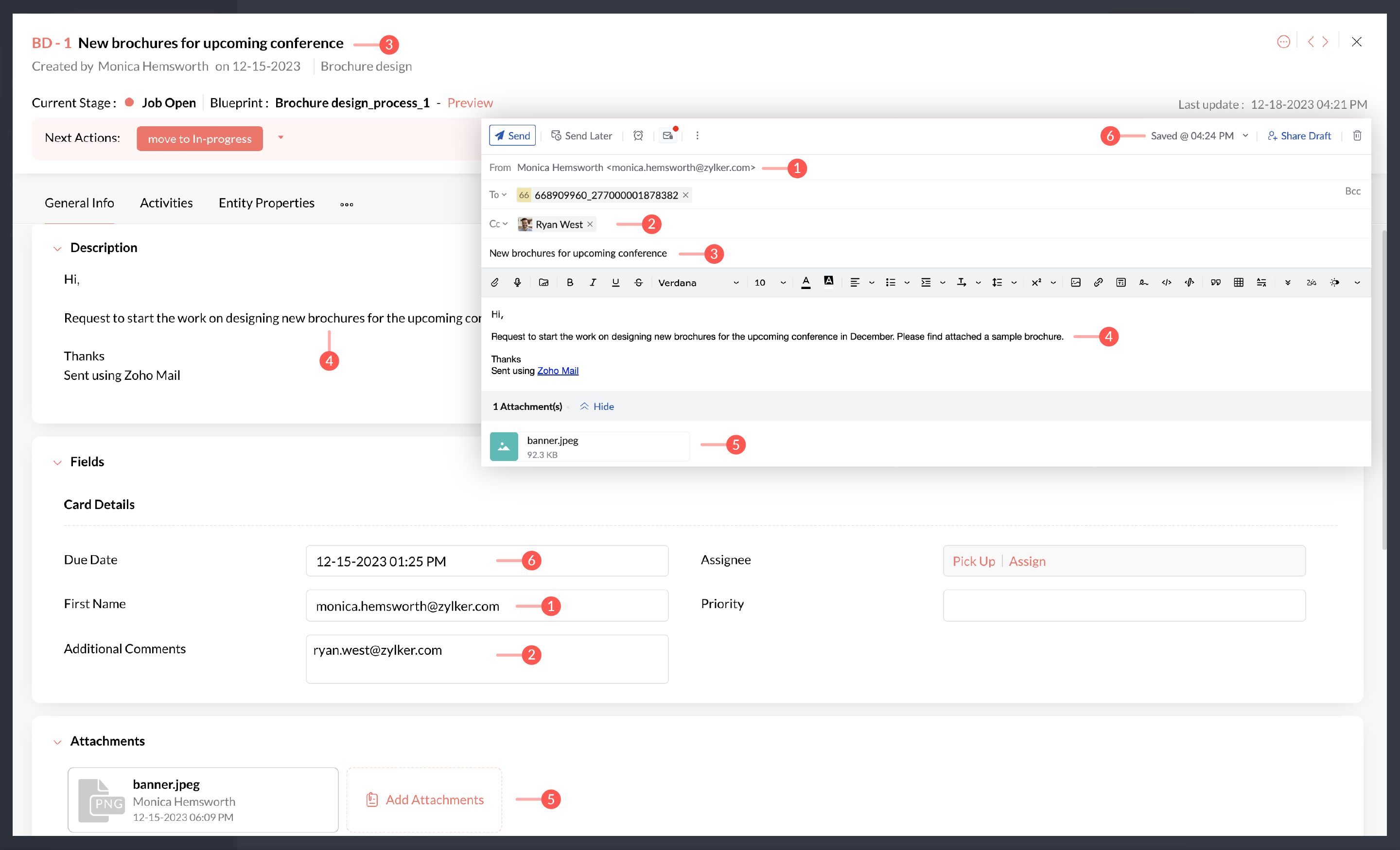 The email subject line will be considered the card title and the email content will be the description by default. Remaining email components can be mapped with different fields available in the card. The sender can also include attachments to the email to add them to the card.