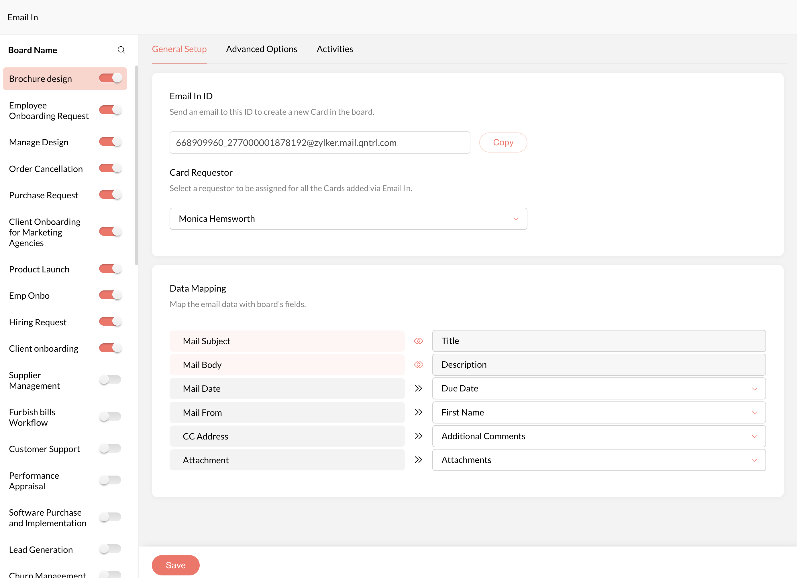 - Data Mapping: Map email components like date, from address, CC, and attachments with the board's fields here. The mail subject and body are mapped with the title and description fields by default.