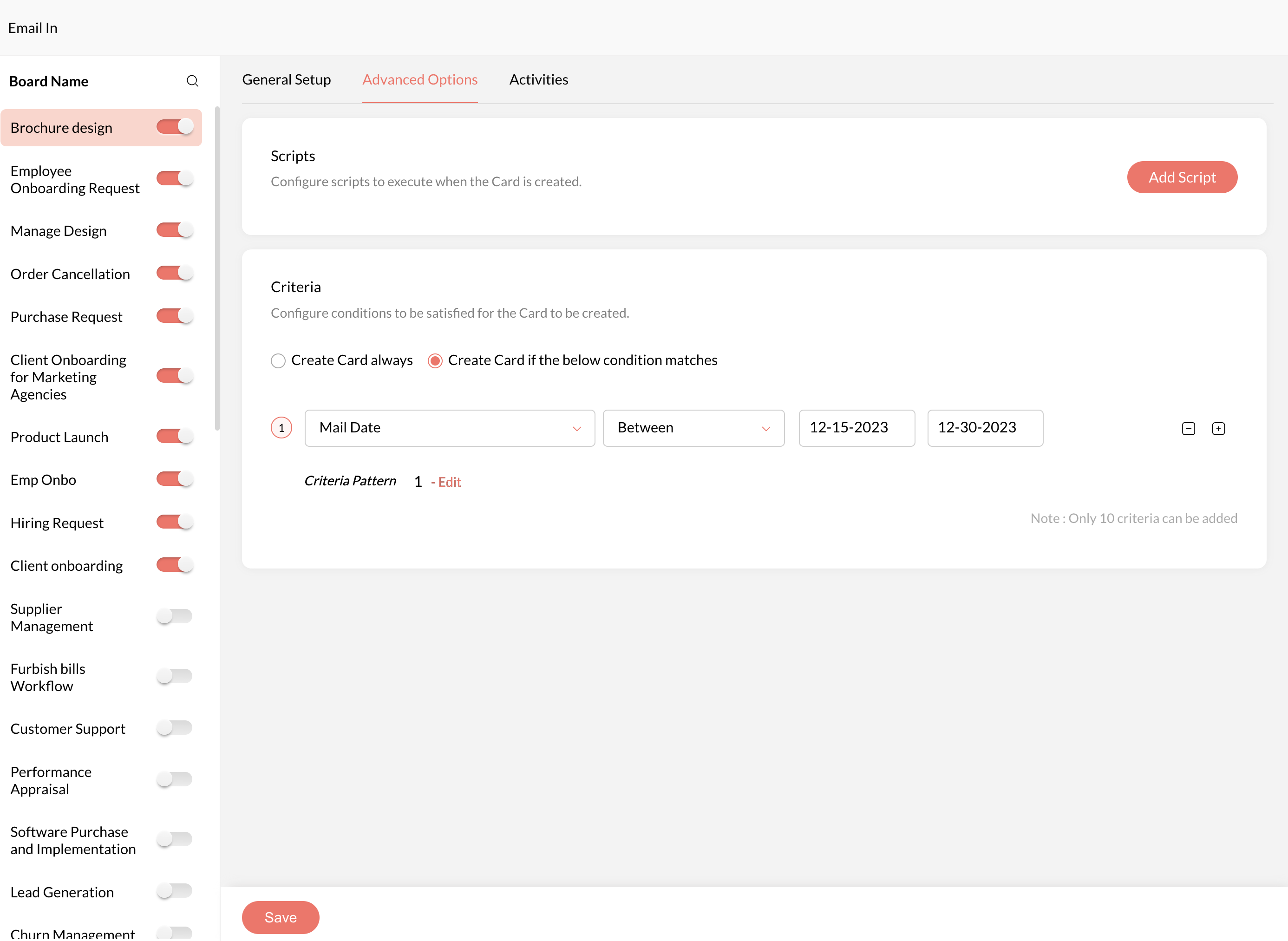 - Criteria: Set criteria for card creation. Once a criteria is set, card creation via Email In will take place only when the criteria is met.