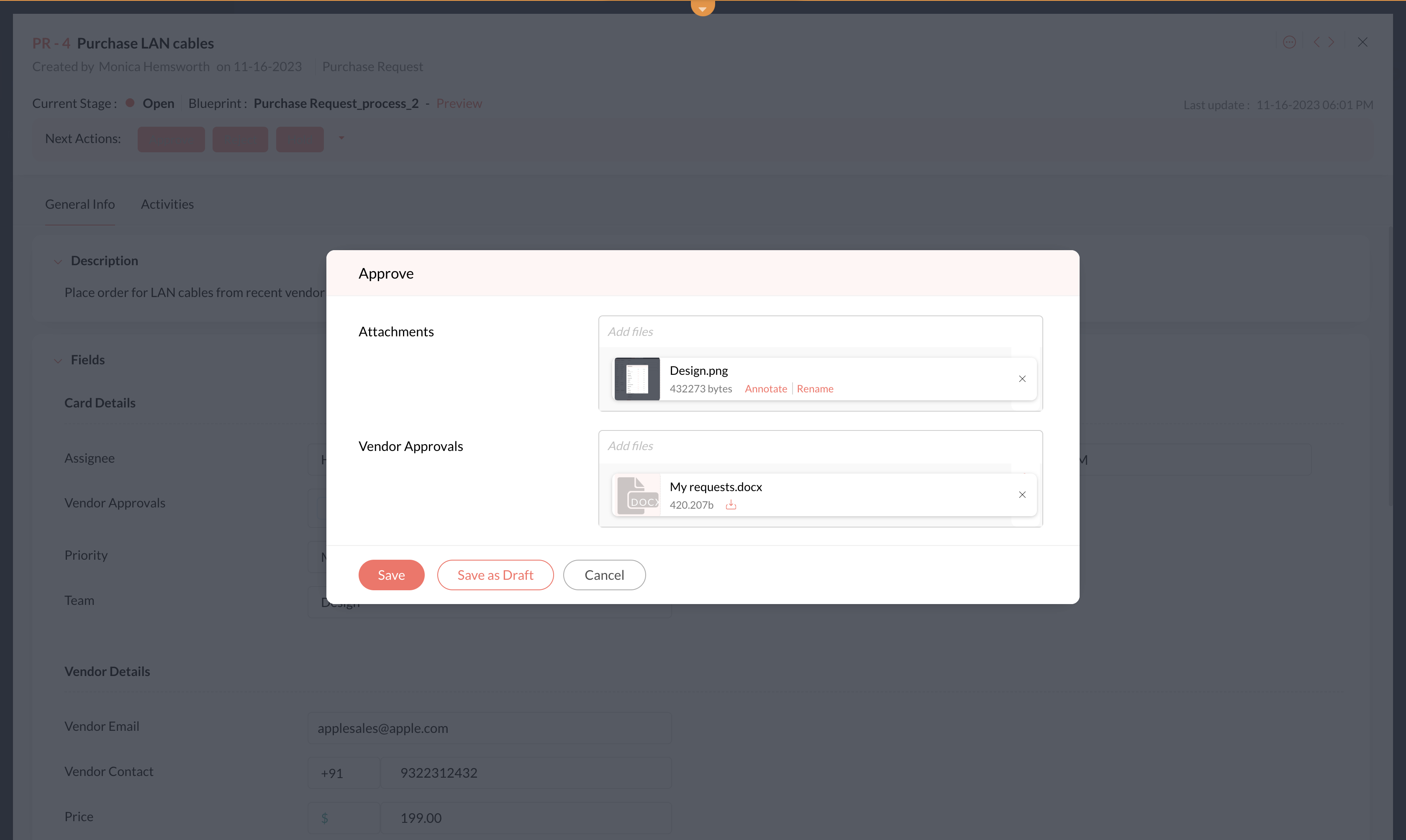 While performing the transition, you might sometimes be prompted to fill up field details. In such cases, you can enter the details and either click Save or Save as Draft.