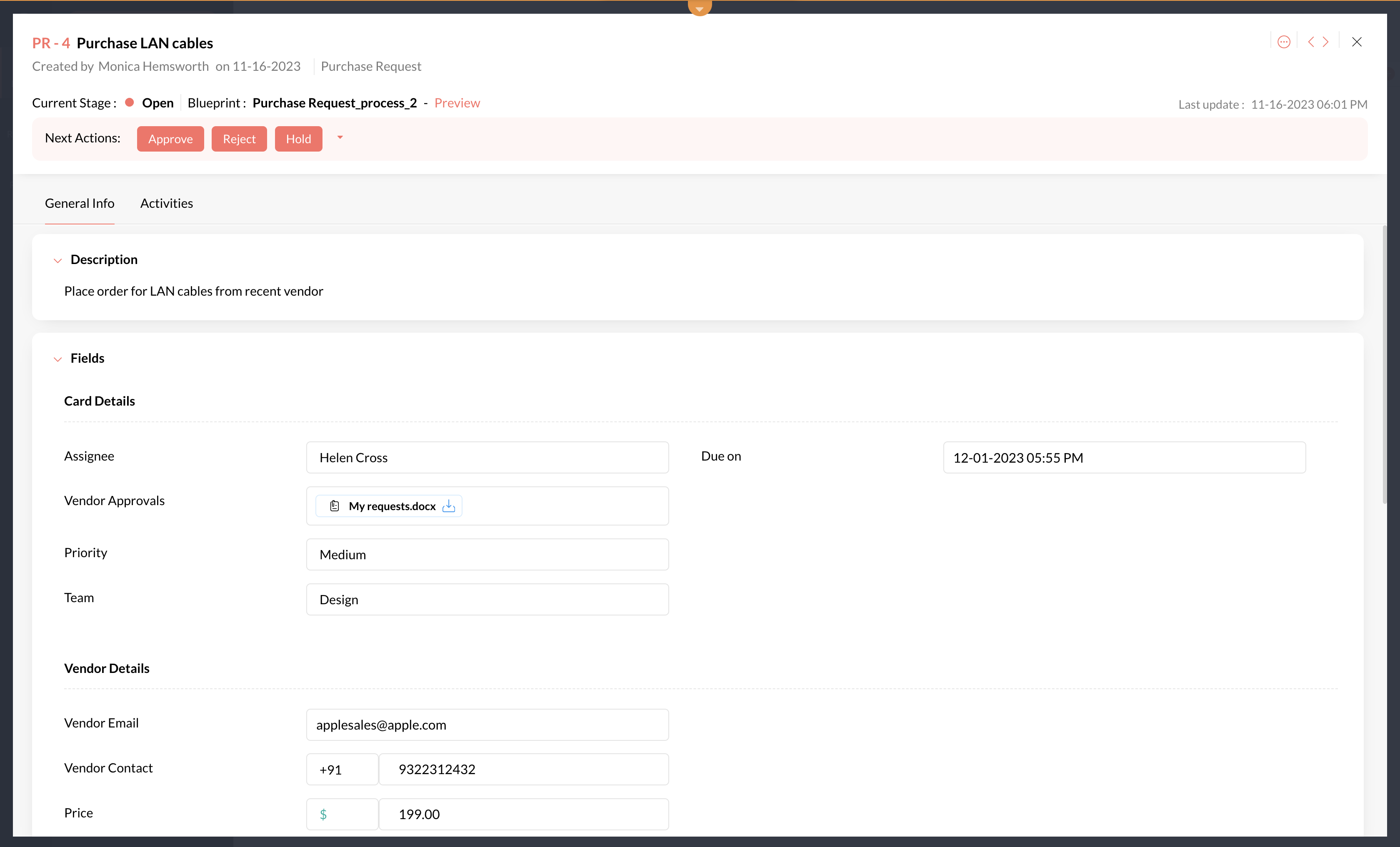 Board users with permissions to perform the card will be able to view the blueprint’s transitions as buttons in the card page. Non-board users will receive an email to allow them perform the transitions via email.
