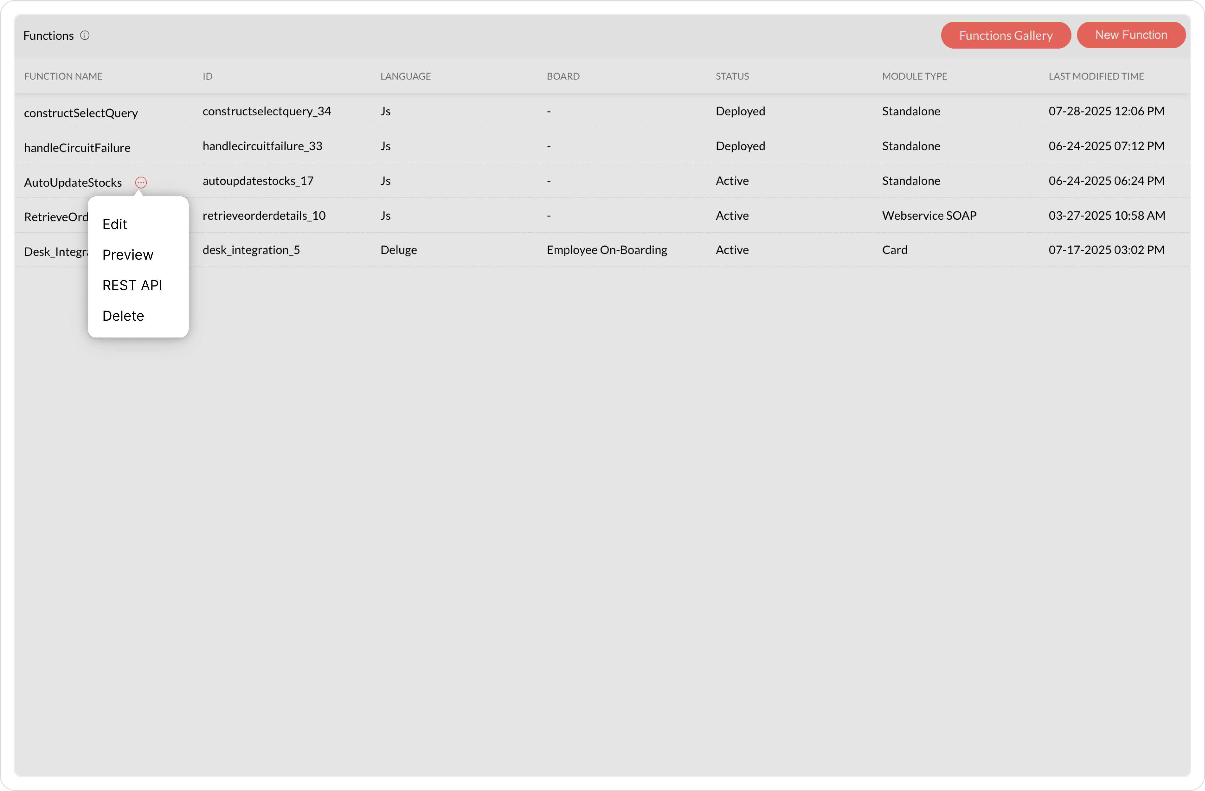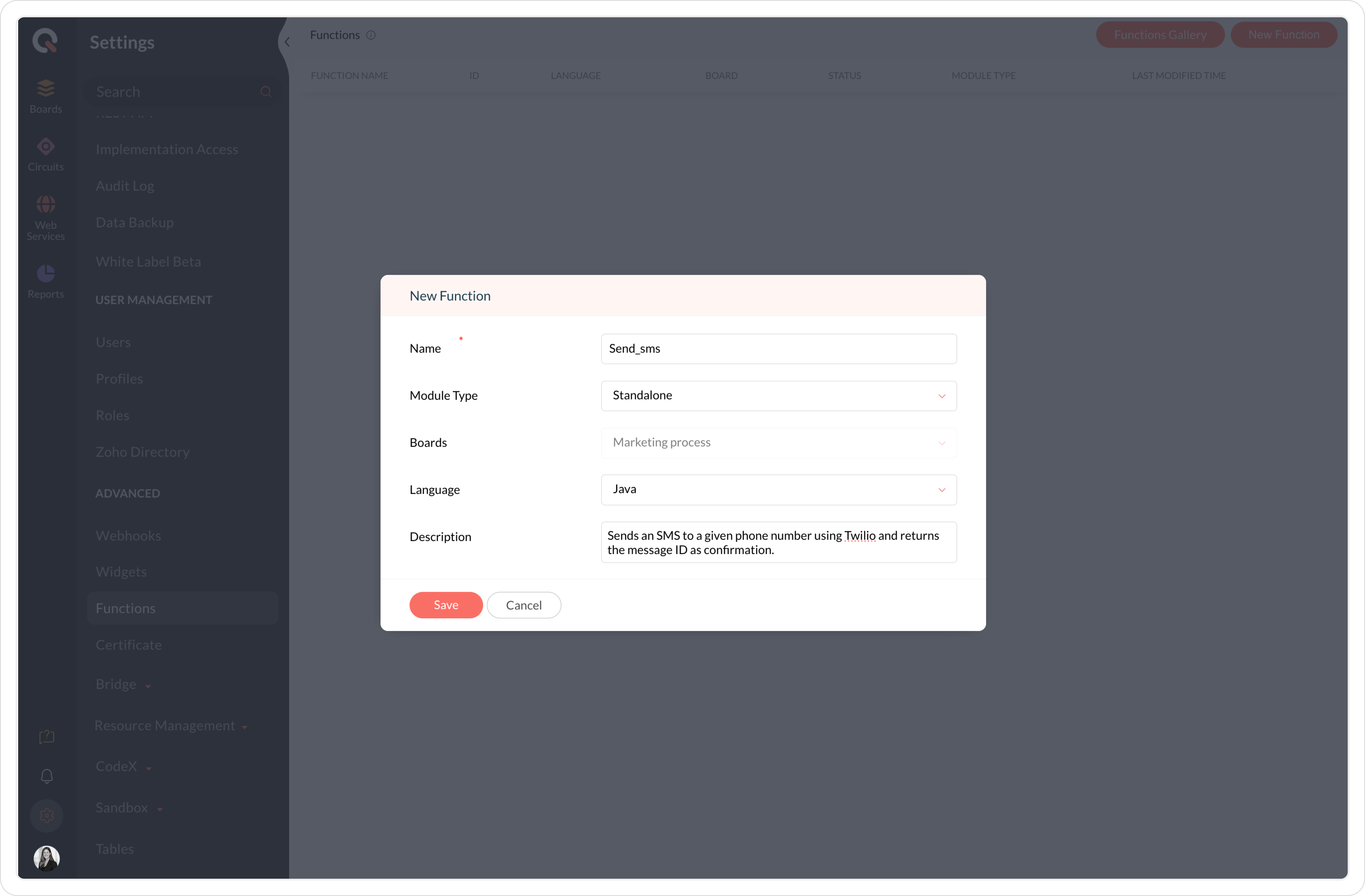 Functions allow users to program a set of operations and execute them when invoked from an application. Users can automate processes or integrate with Zoho and other third- party applications using functions.