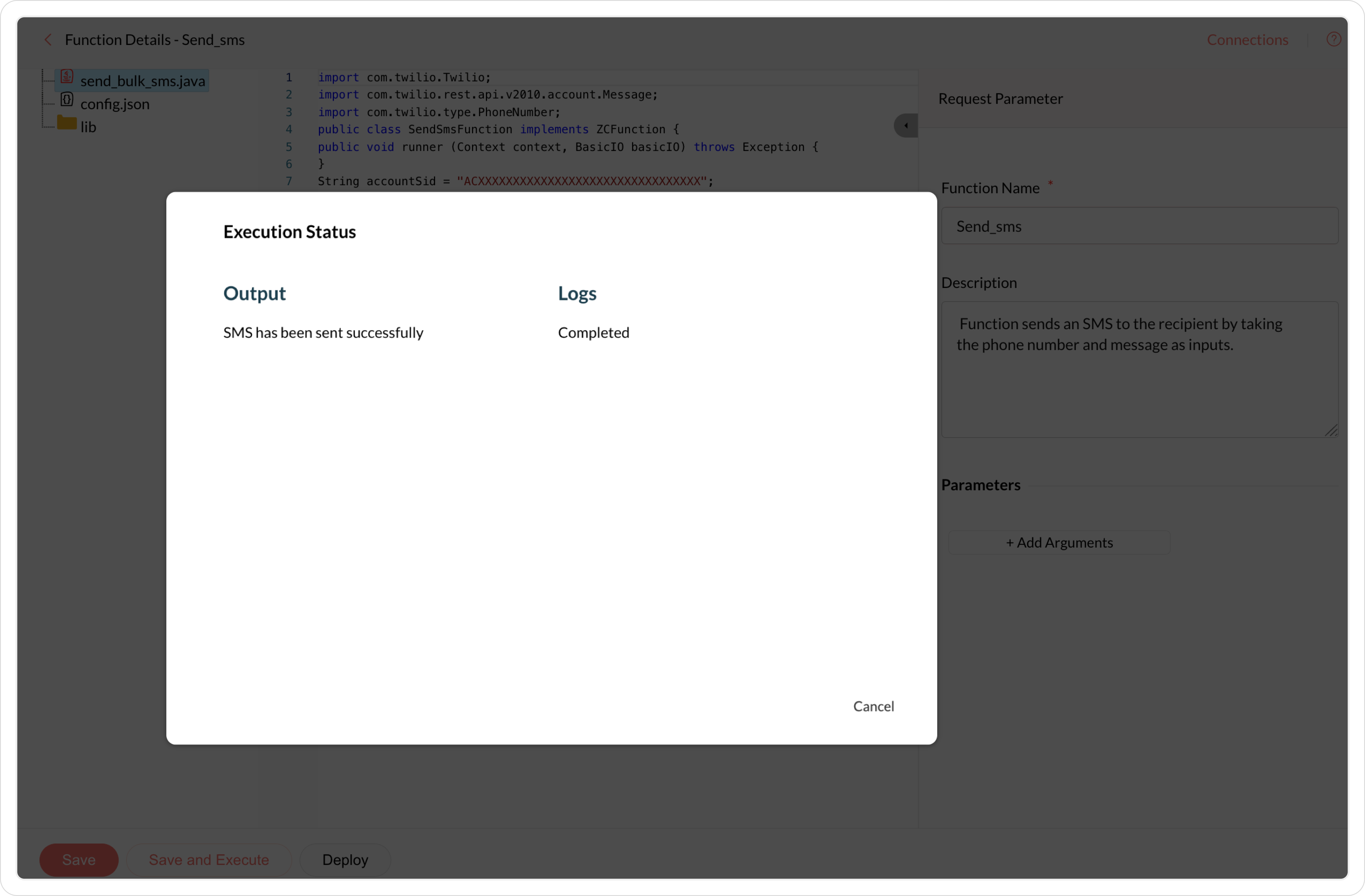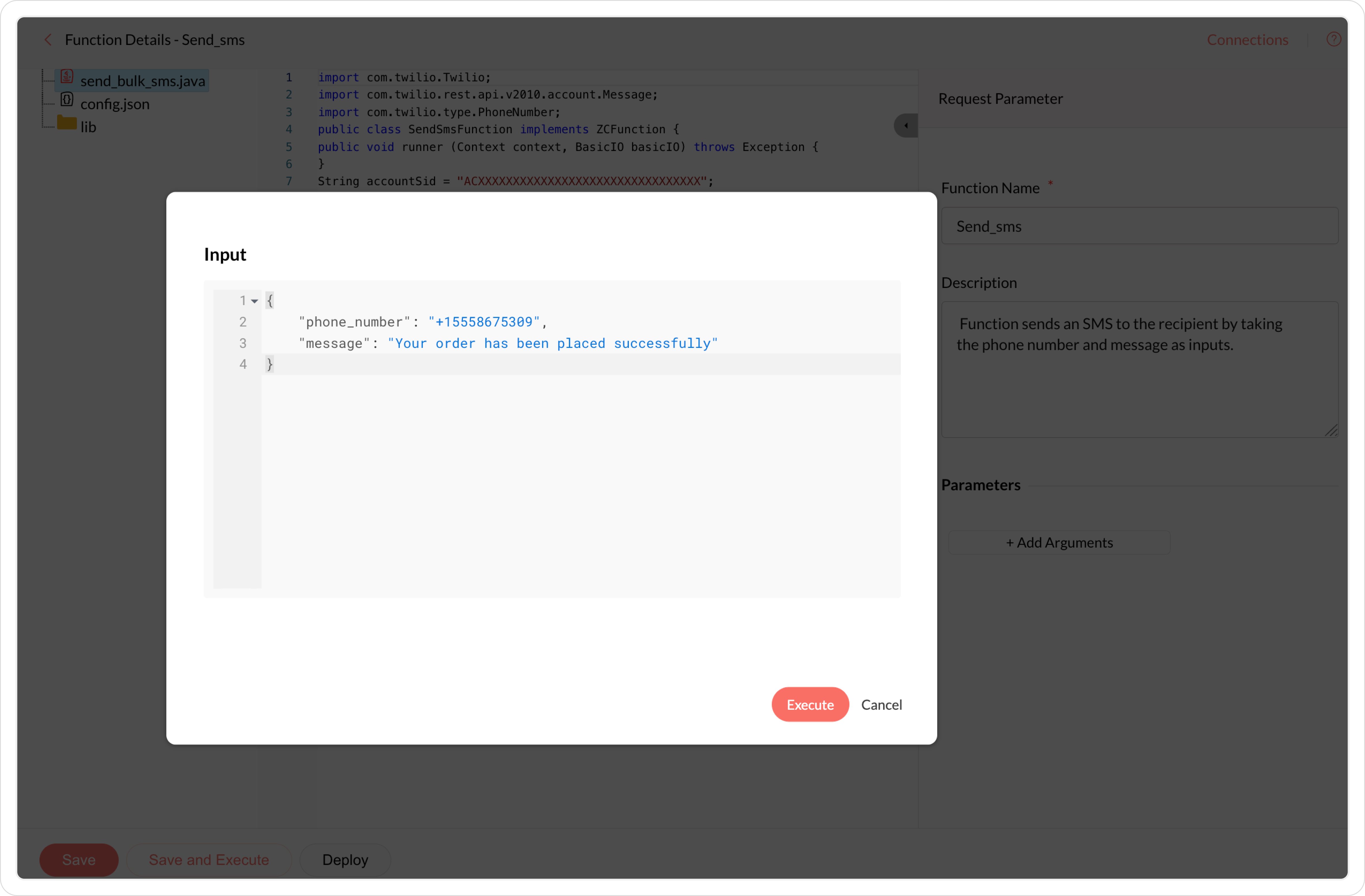 Whenever a function is executed, there will be some values passed with the function. These values are called arguments. Specify the arguments based on which your function runs in the dialog and click Execute.