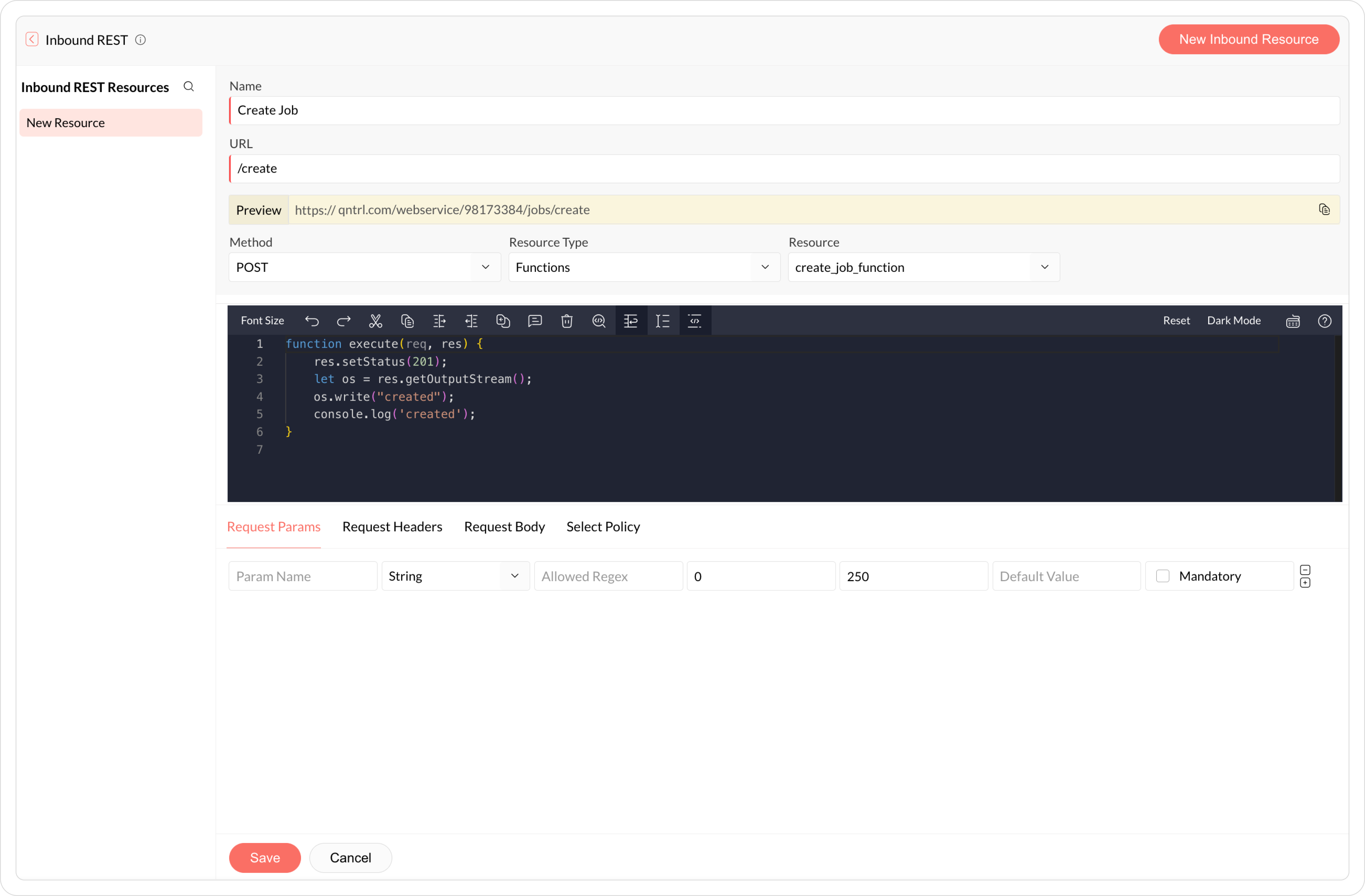 URL: Define the endpoint path (e.g., /create). This will be appended to the module’s base URI.