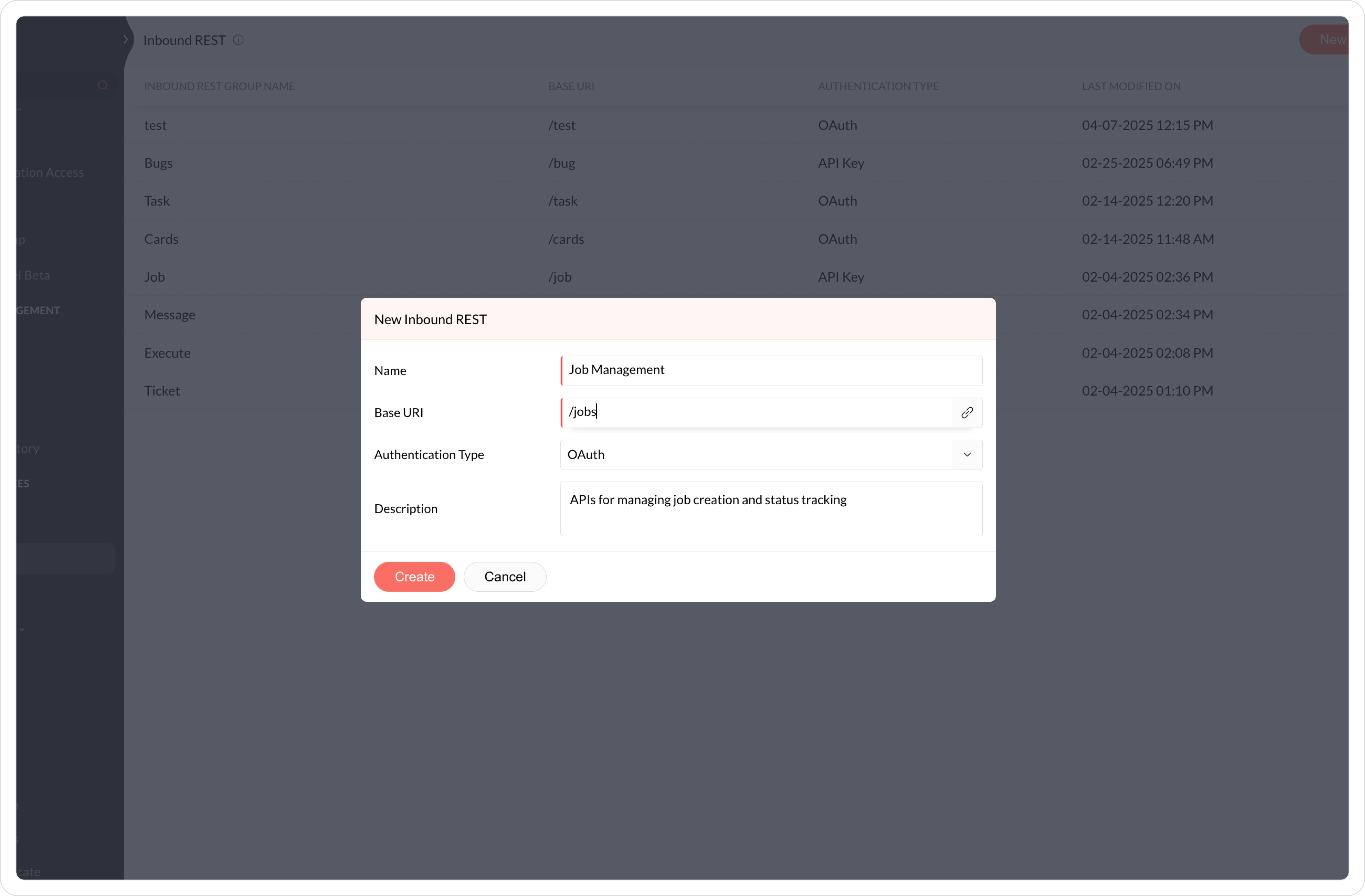 Each inbound REST API is grouped under a module, allowing you to organize related endpoints, such as those for jobs, layouts, or custom processes.