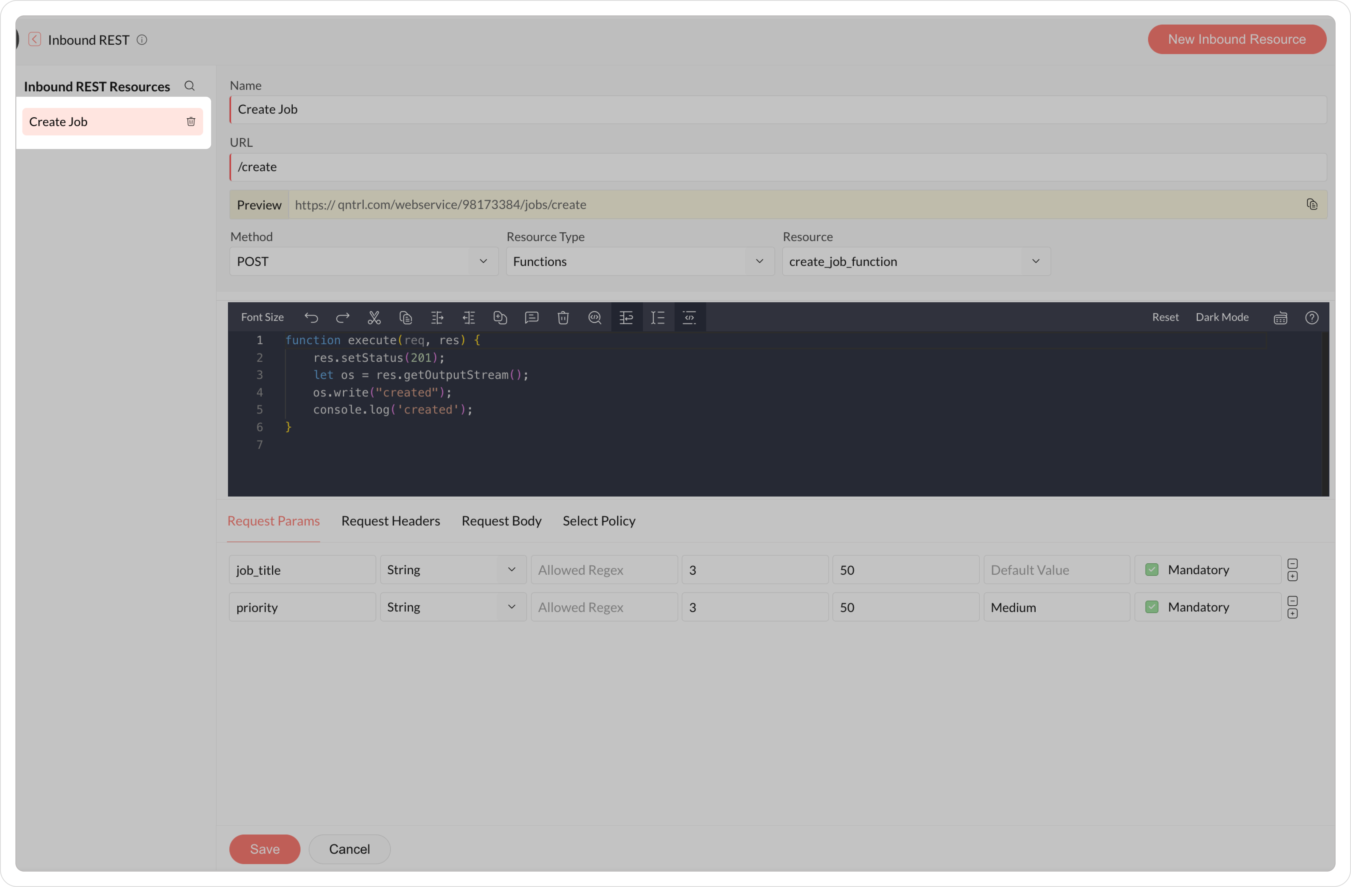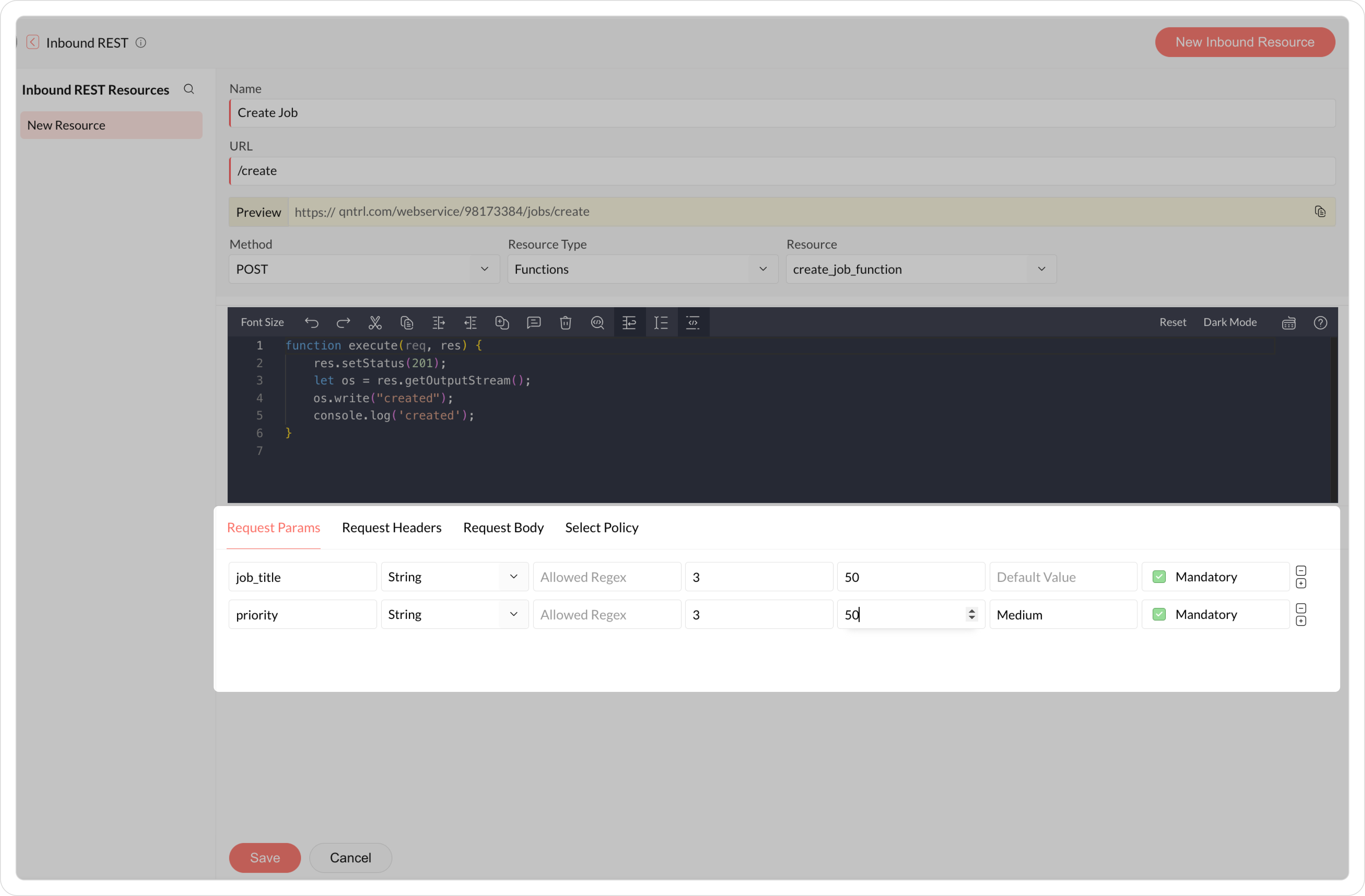 If any validation fails for request params, headers, or body, Qntrl will reject the request.