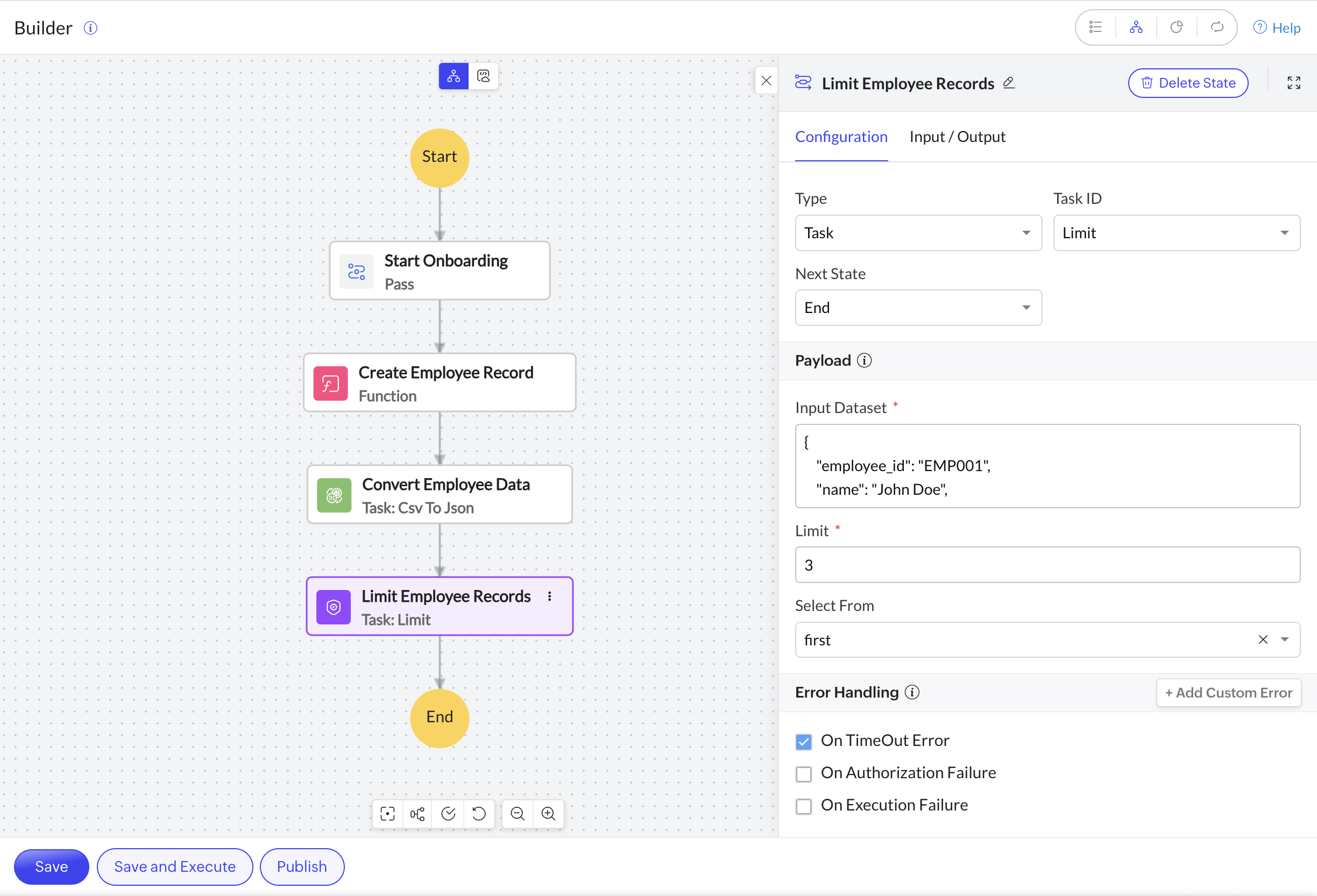To configure Input Path, Output Path, Result Path, and Result Selector, click Input/Output next to the Configuration tab. For more details, refer to Input & Output Processing.