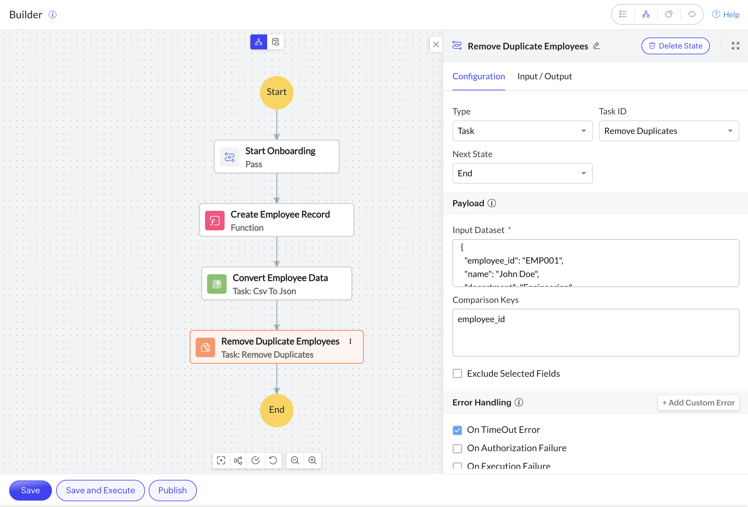 Exclude enabled: Removes duplicates based on all keys except the specified ones.