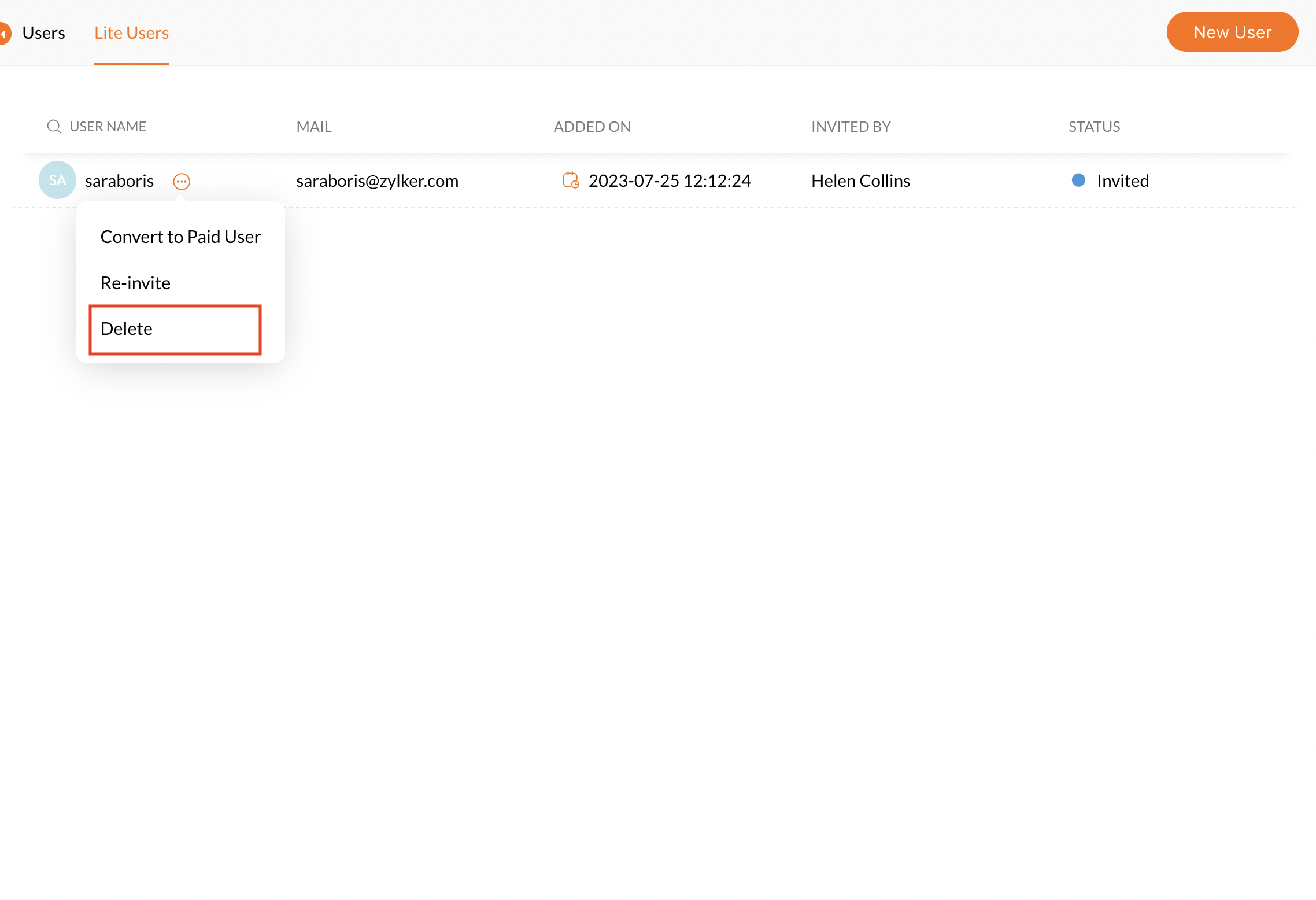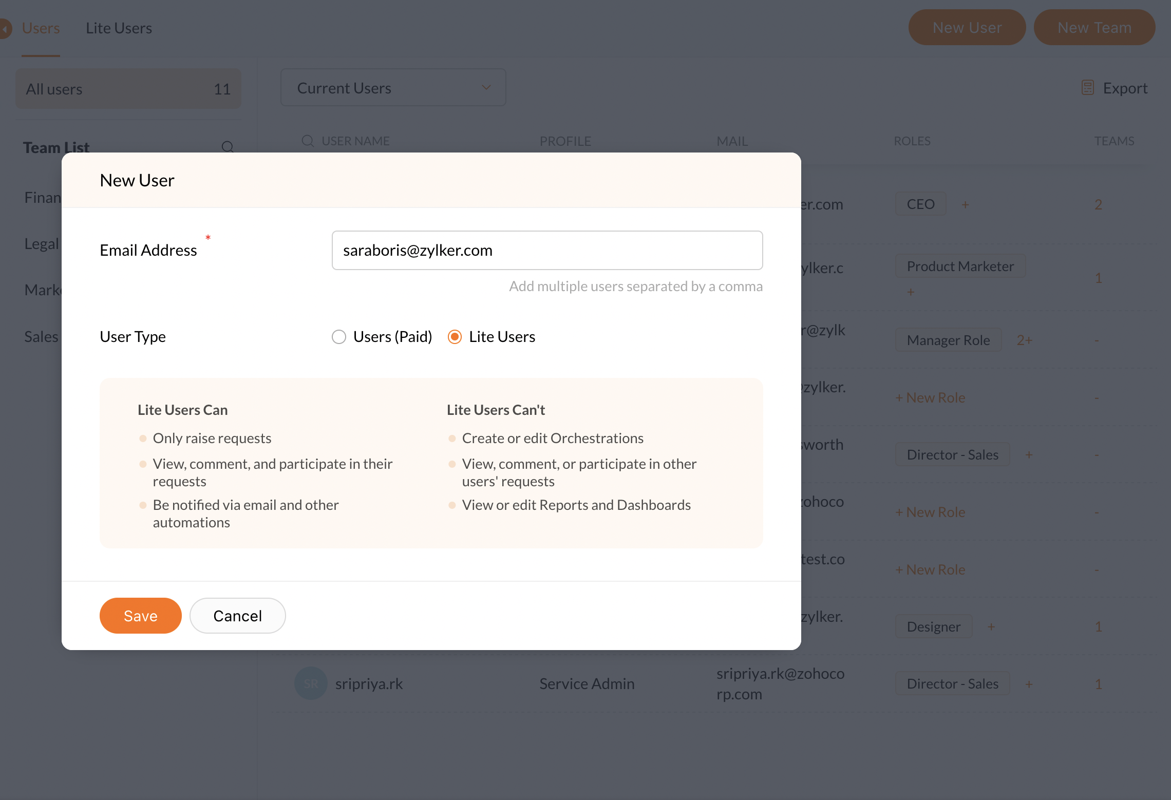 Let's consider Zylker, an organization with several teams responsible for managing their business operations. There can be 'n' number of employees in the organization. However, only a particular set of employees actually work in the software, while the rest only provide inputs to the employees who work in the software. In such cases, those who only give the inputs can be added as Lite users in the organization.