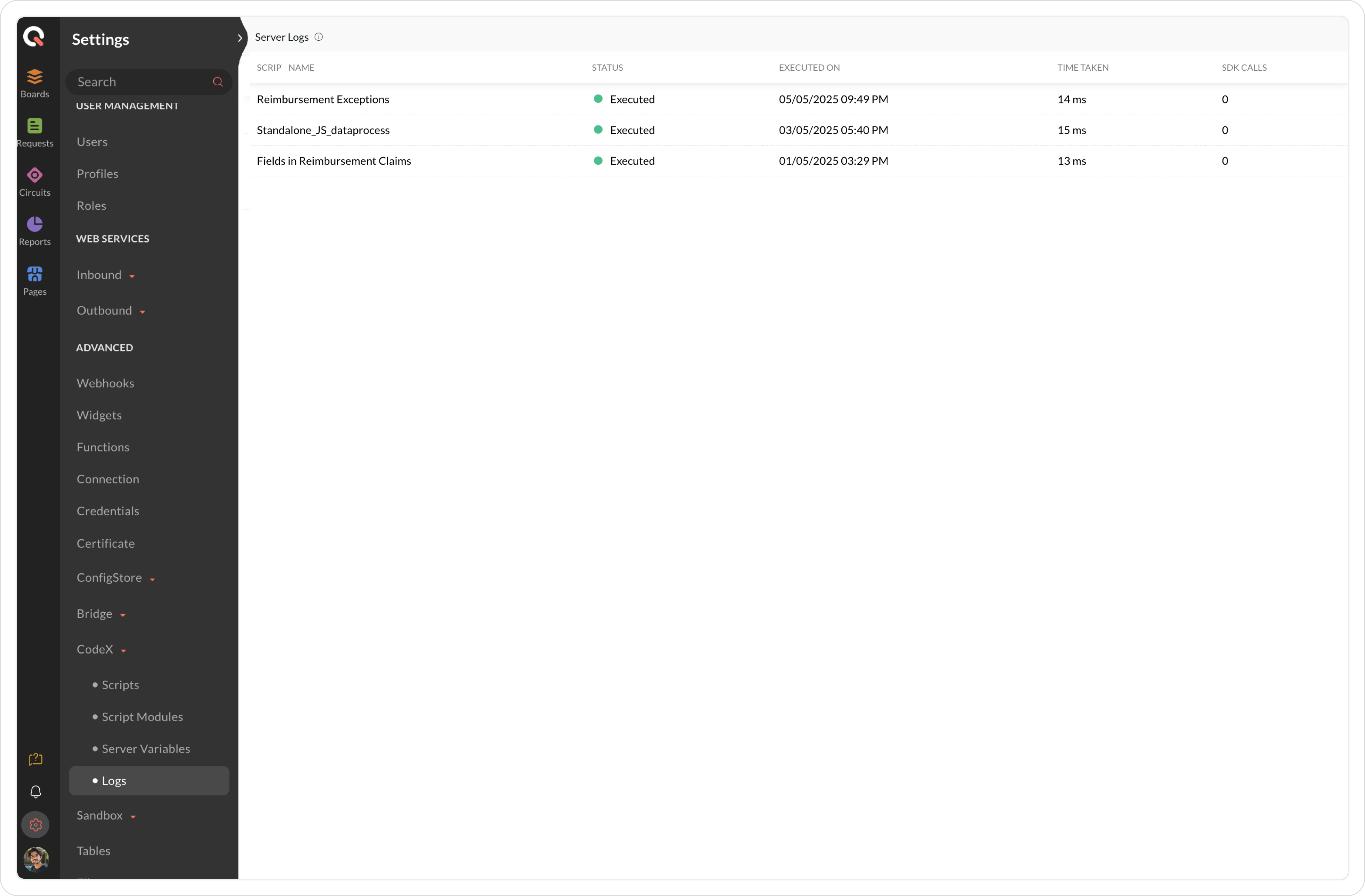 Logs in Qntrl provide visibility into triggered scripts, offering details about script status, execution duration, processing time, and the count of SDK calls.