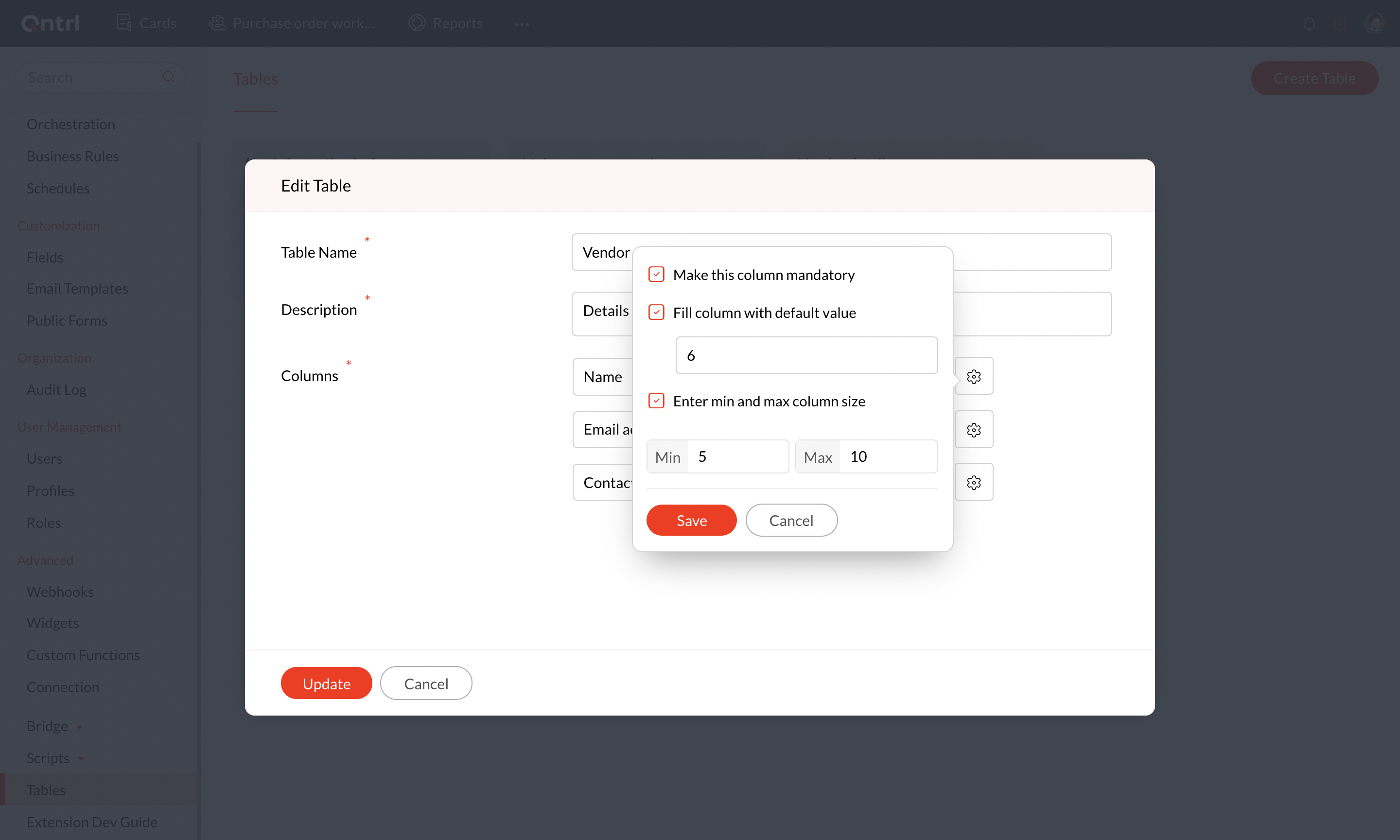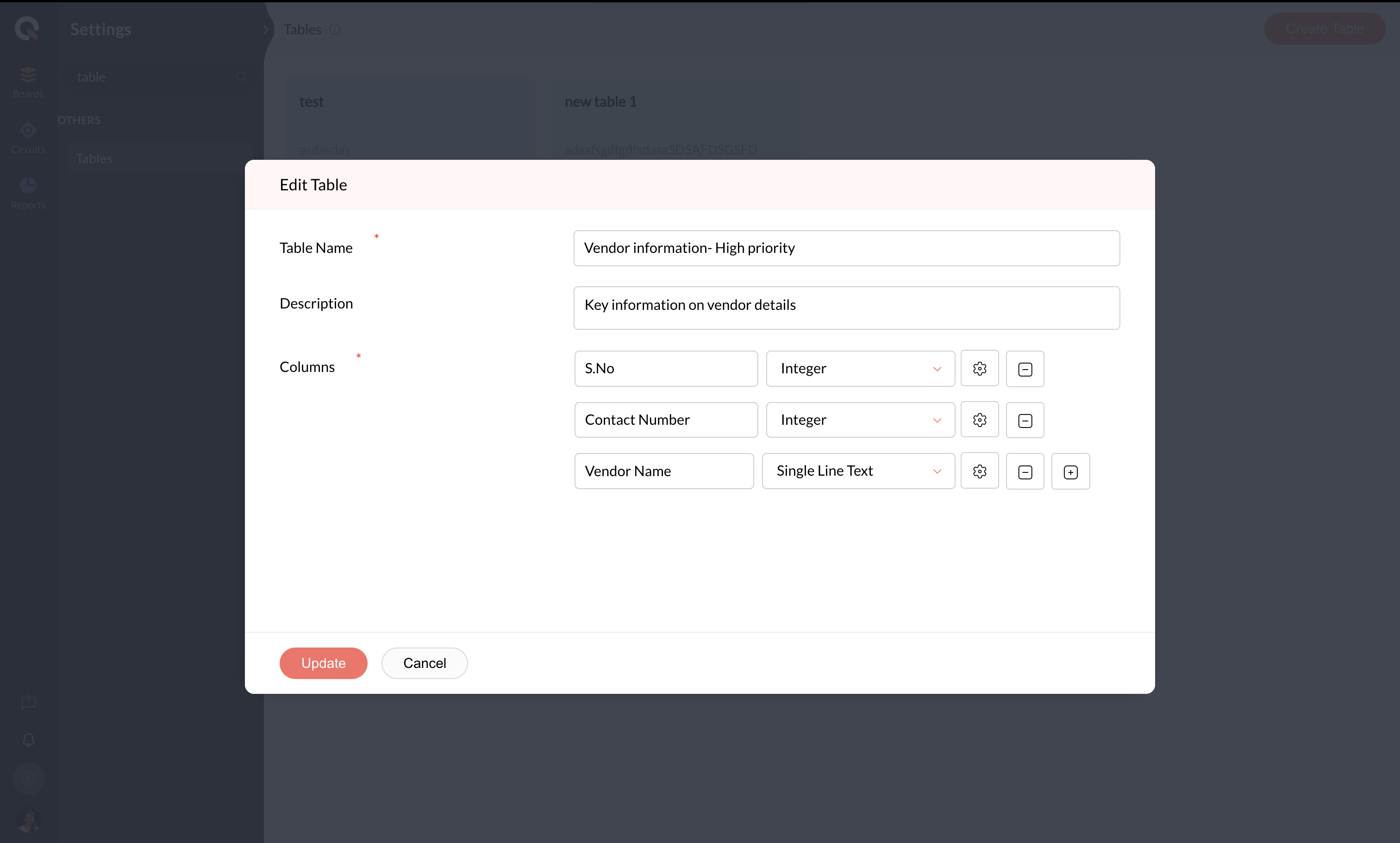 Tables help you store reference data in a tabular format within Qntrl . You can store data vital to support your business processes here. Also, the data in tables can be listed in cards using Table Lookup .