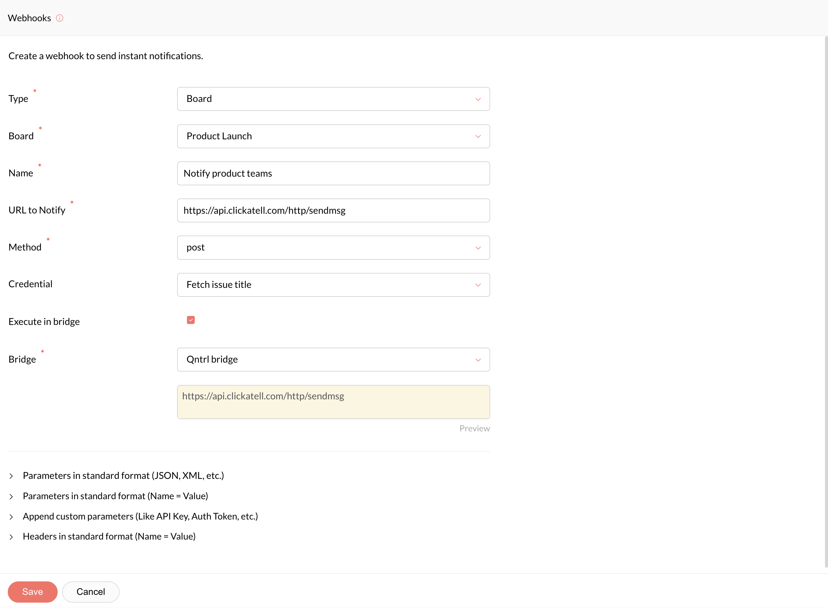 Preview the complete webhook URL to be sent to the third-party application. This field cannot be edited. |