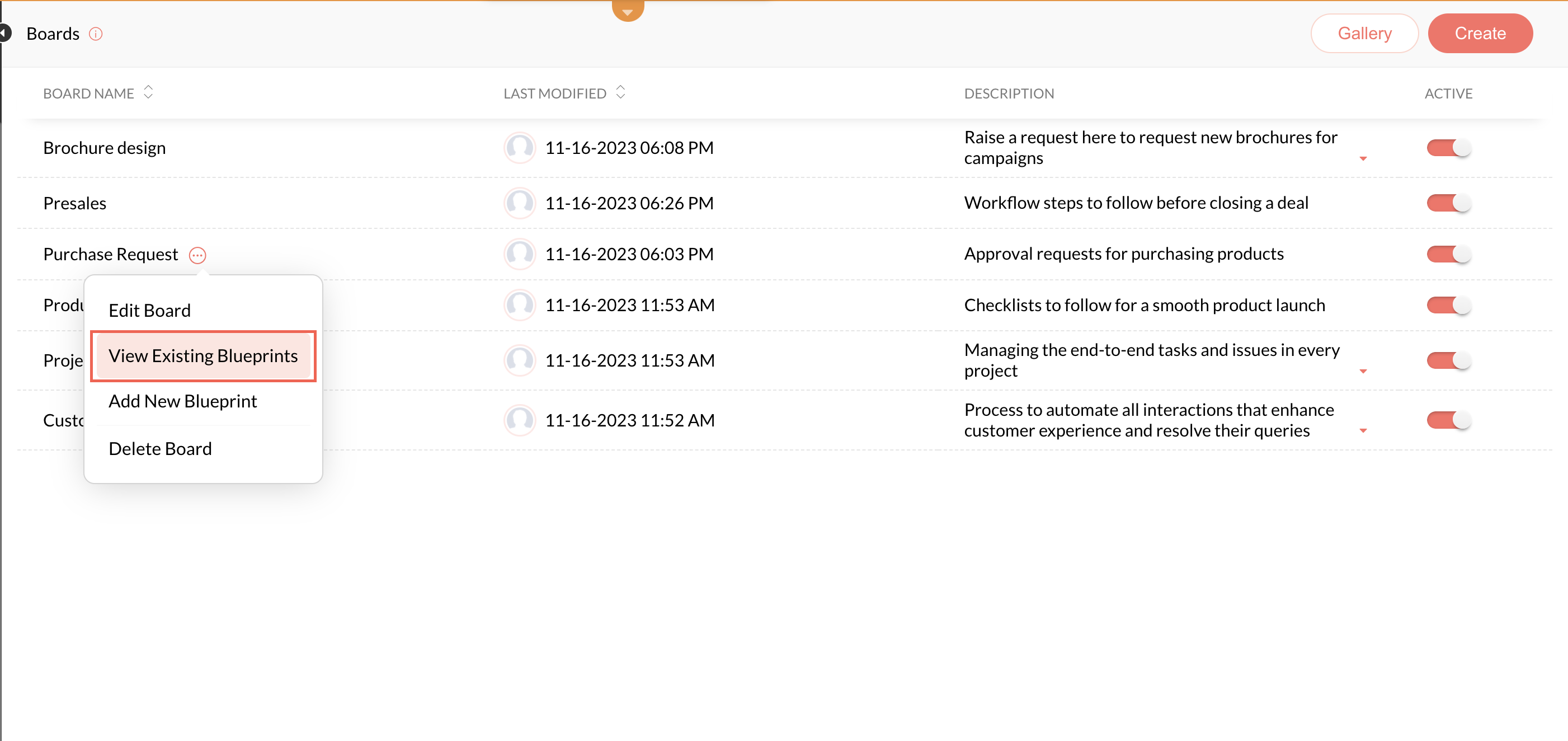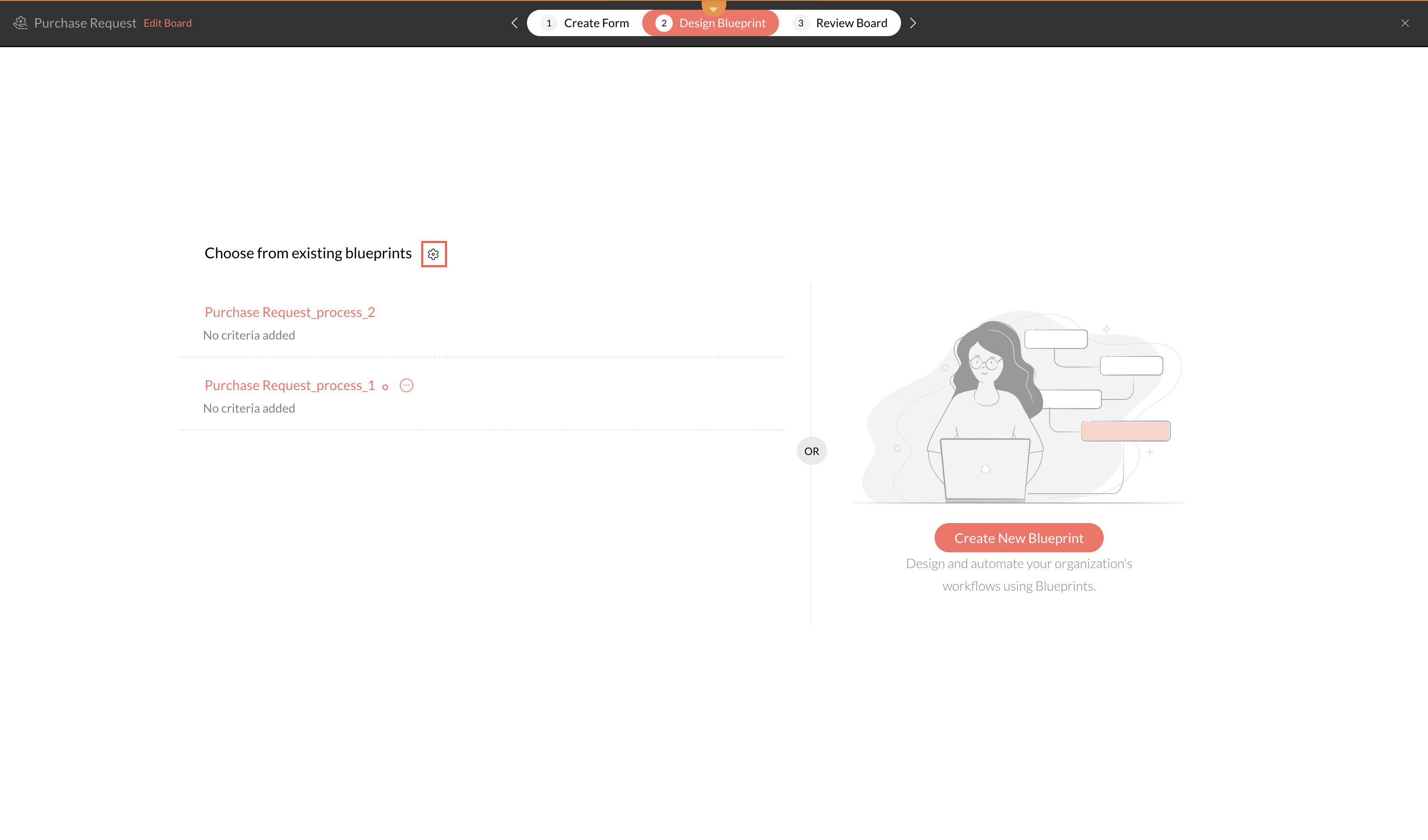 You can view the blueprints associated with a board . You can also create a new blueprint here by clicking the Create New Blueprint button. To edit a blueprint, click on the corresponding blueprint.