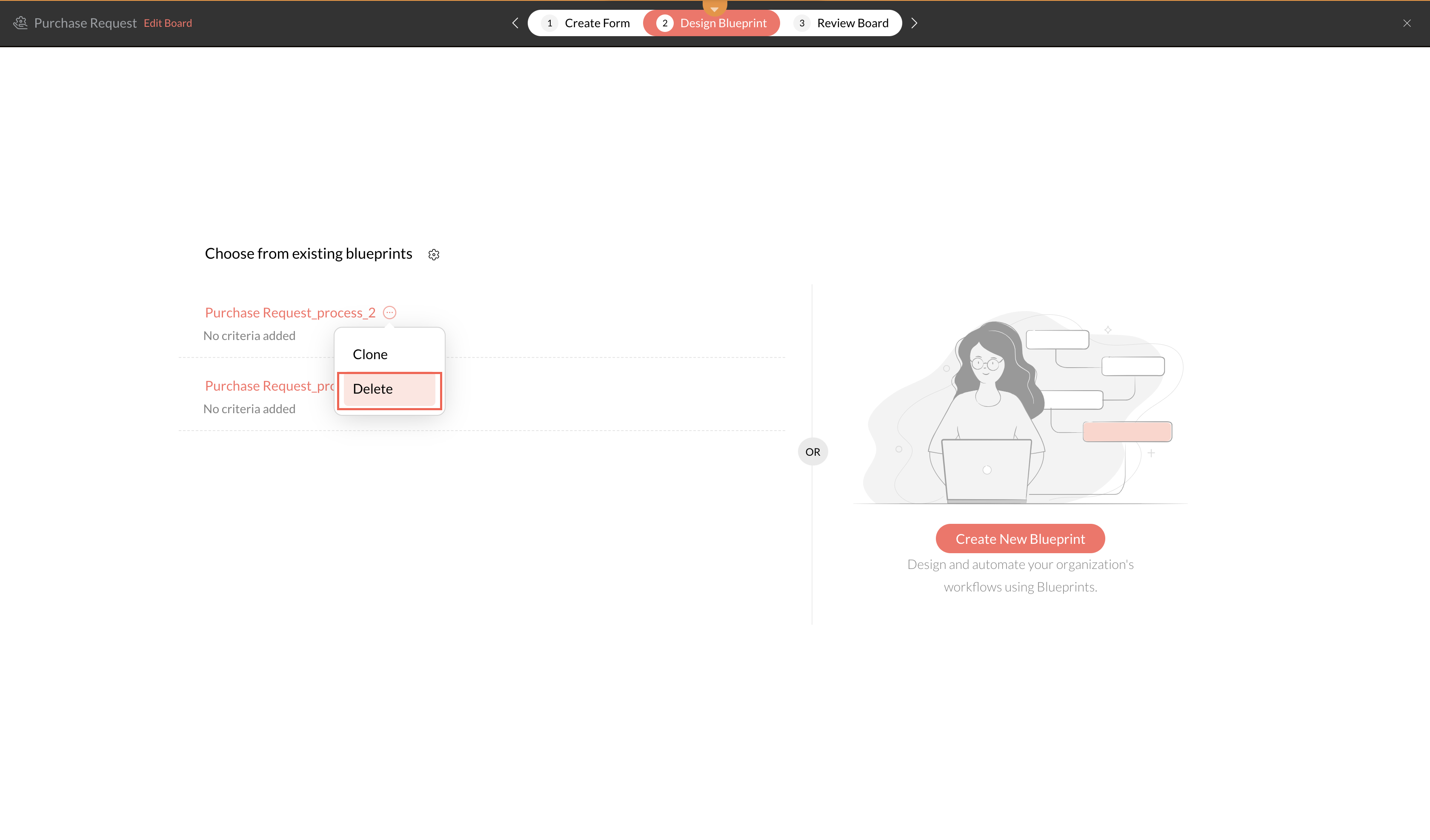 Blueprints that are no longer required can be deleted. Once a blueprint is deleted, the cards associated with the blueprint will also be deleted.