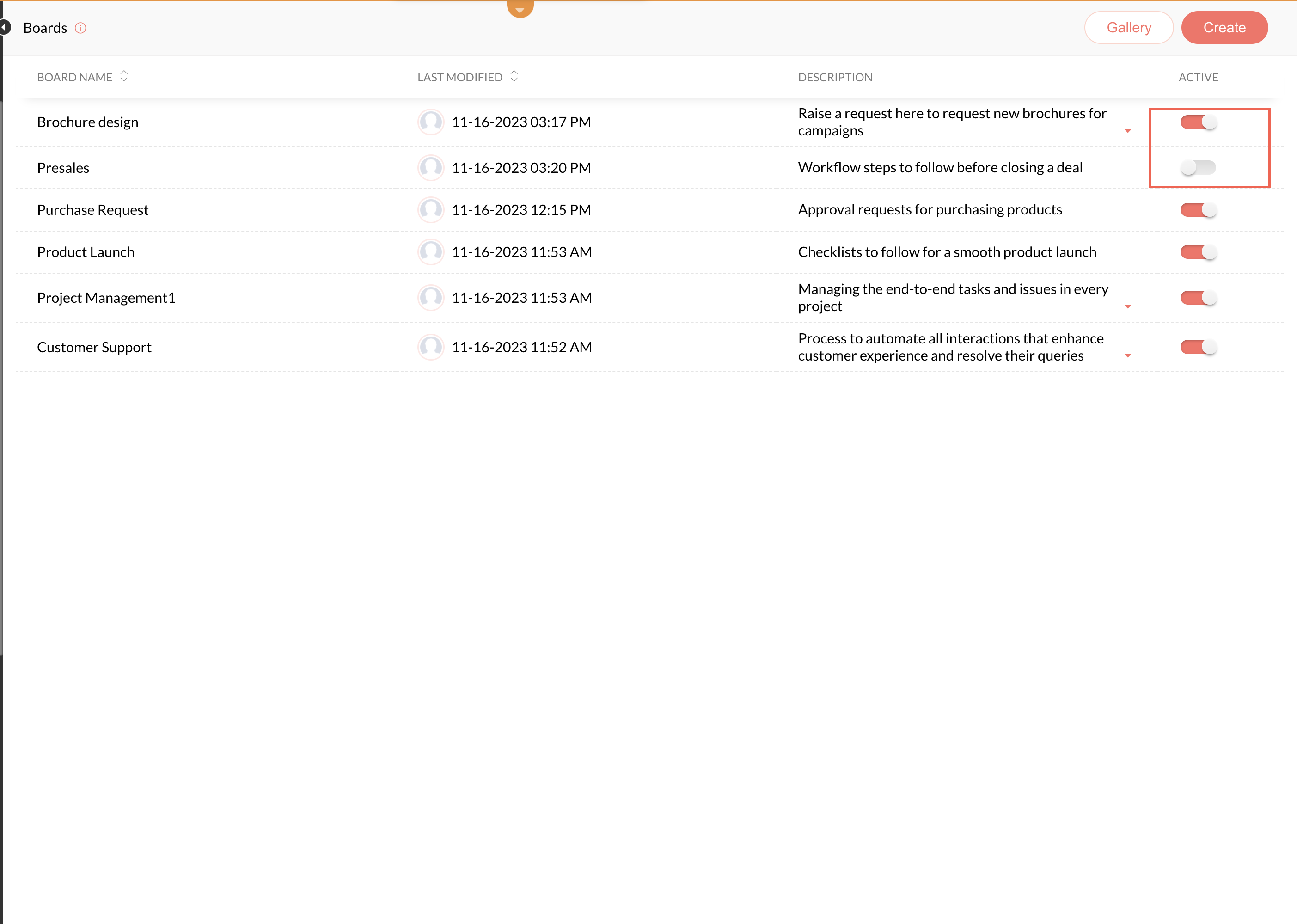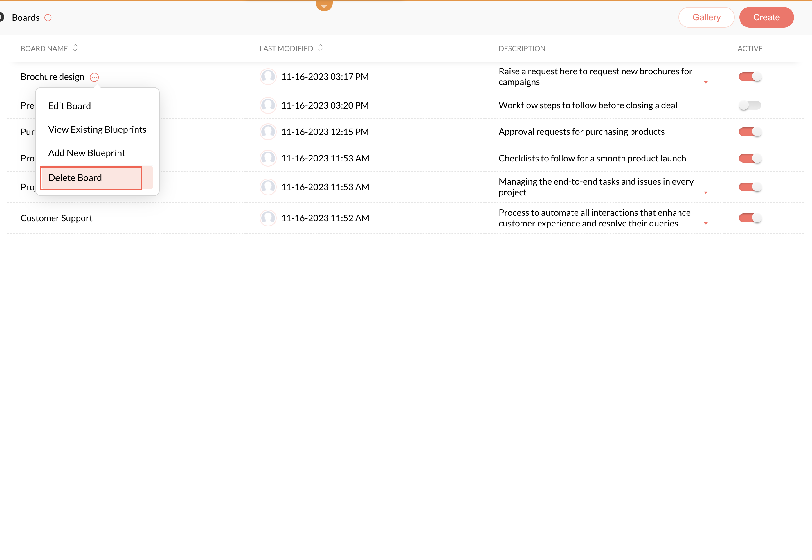 You can quickly edit and update the board using the quick settings. Navigate to the Boards module. Hover over the respective board under My Boards . Click the more options icon . Below are the edit functionalities supported through quick access ...