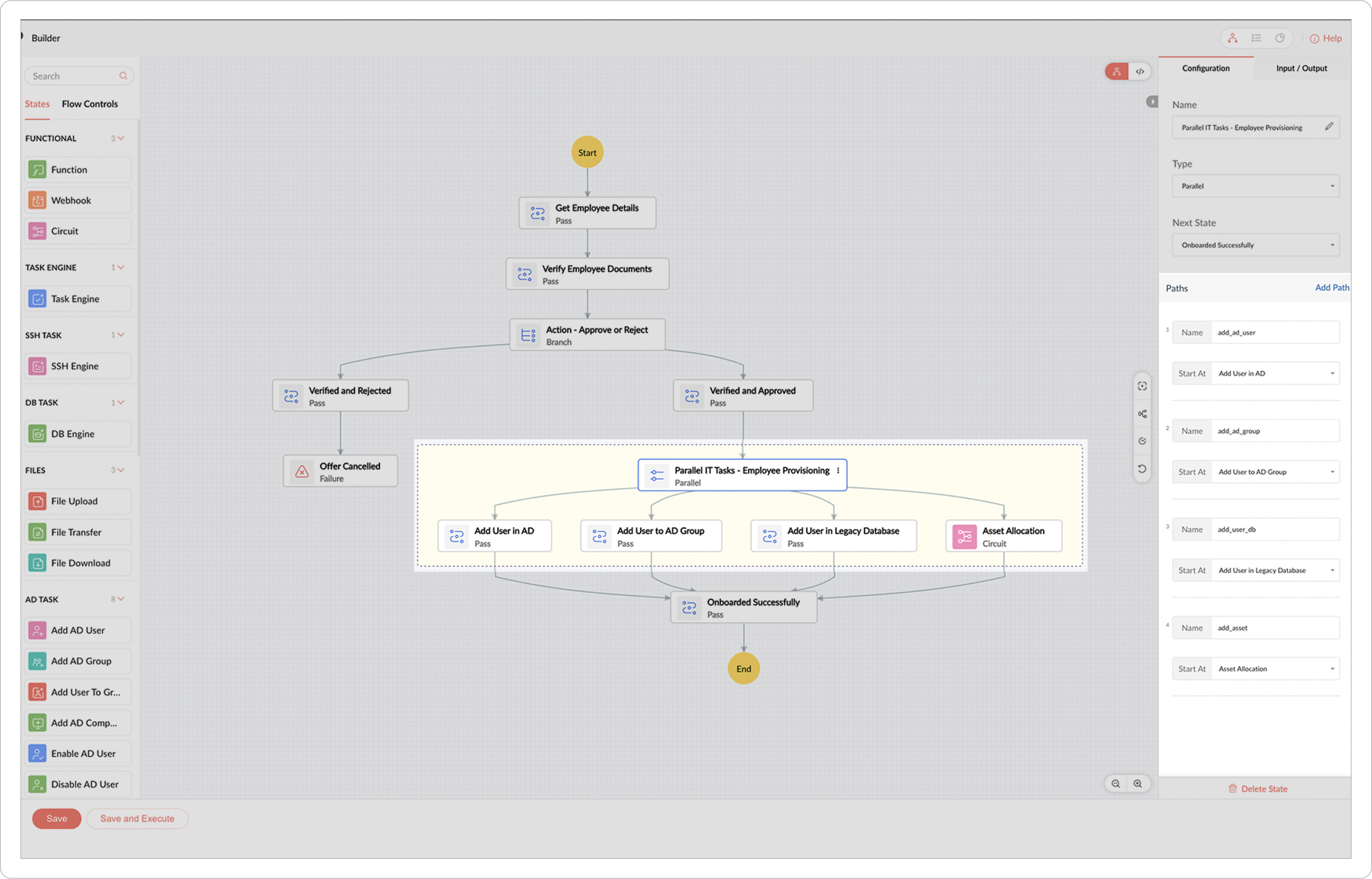 Example Use Case: In the employee onboarding scenario, once the employee documents have been verified, we can add a state to provision the verified employees within the organization. Provisioning involves executing multiple tasks in parallel, such as adding user details in Active Directory, adding the user to the team's channel, making an entry in the legacy database, and allocating resources. This parallel execution of tasks can be accomplished using the Parallel state, allowing all four tasks to be performed simultaneously.