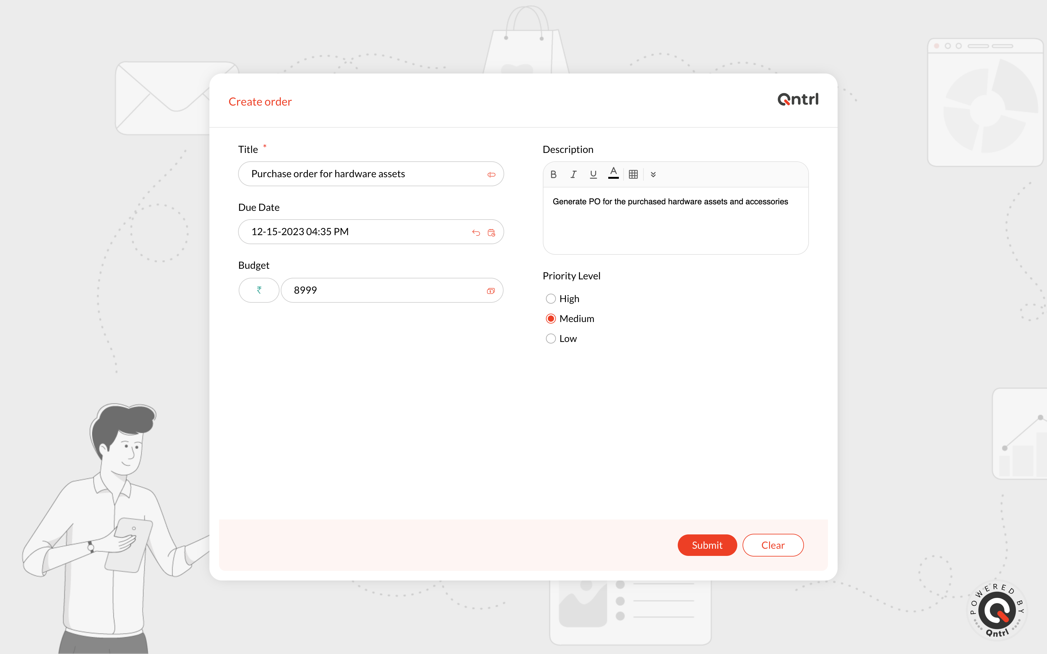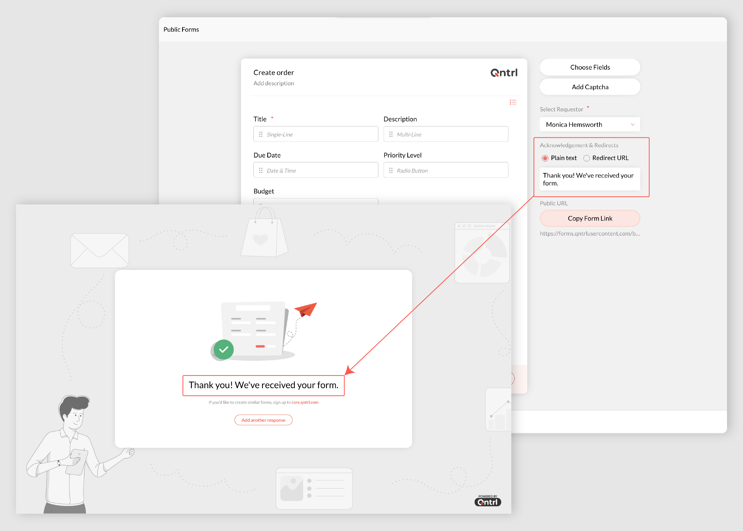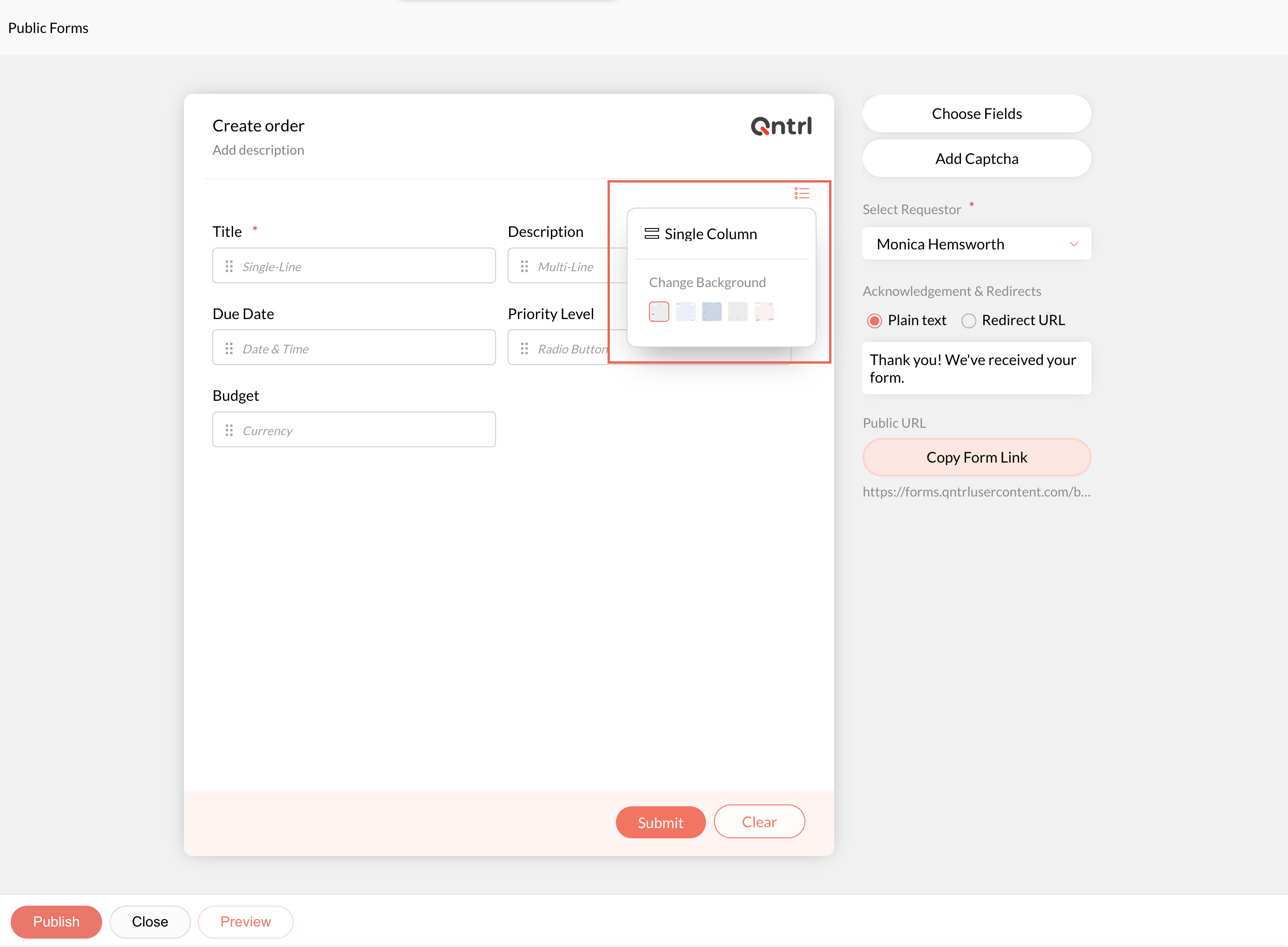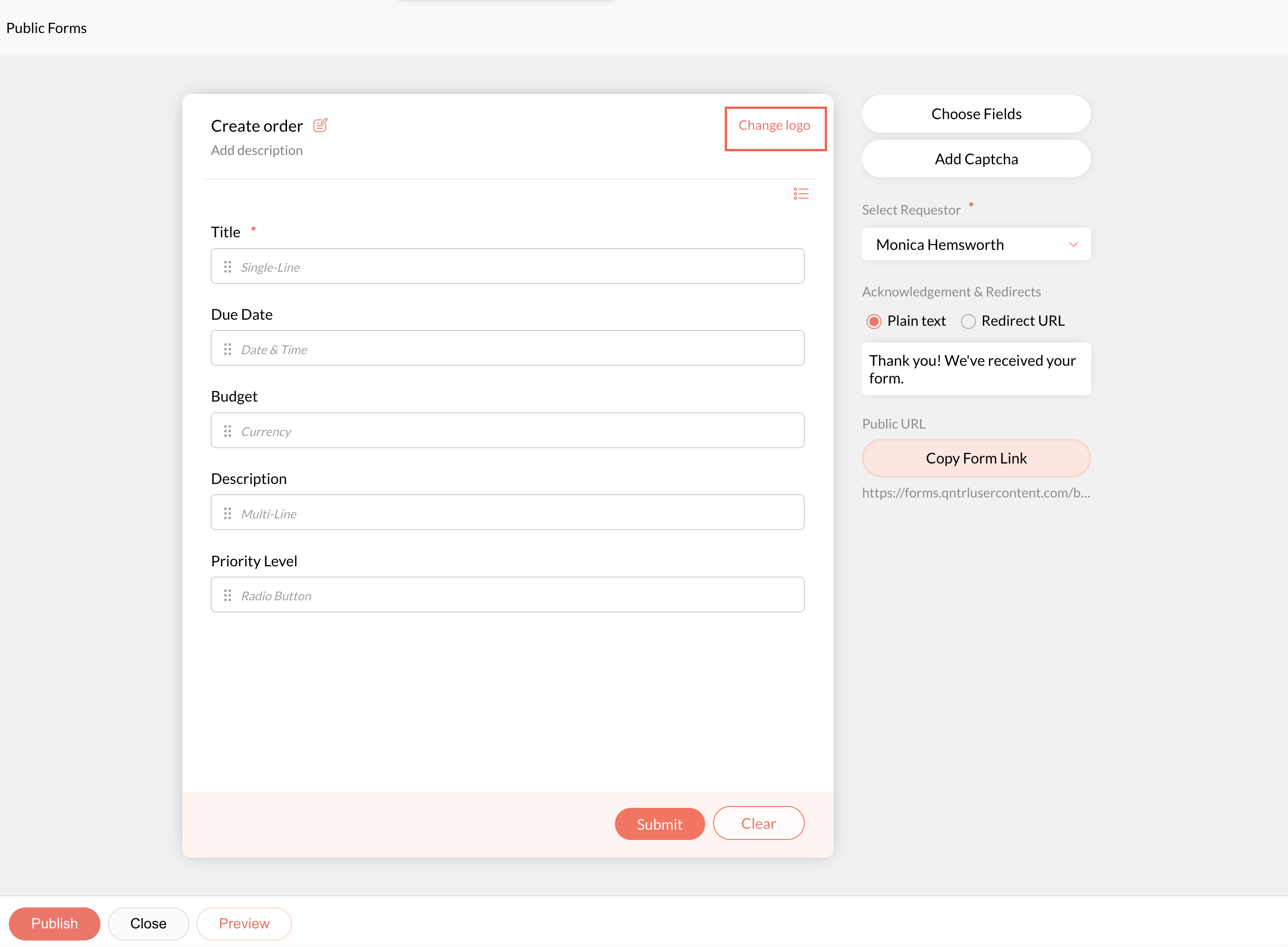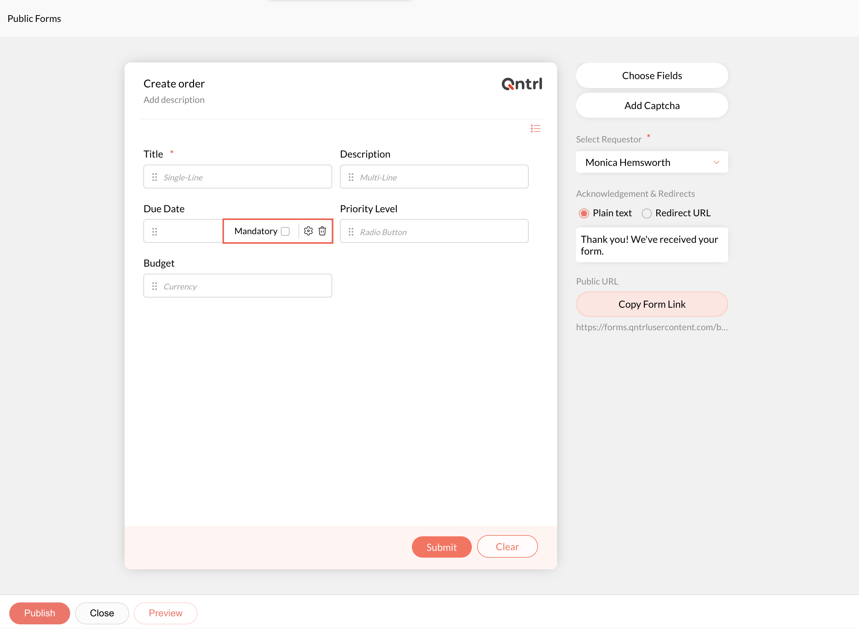 Each public form has a unique public URL which can be shared with anyone who can fill out and submit responses to the form. The form responses will be collected as cards in your board which can later be processed from Qntrl.