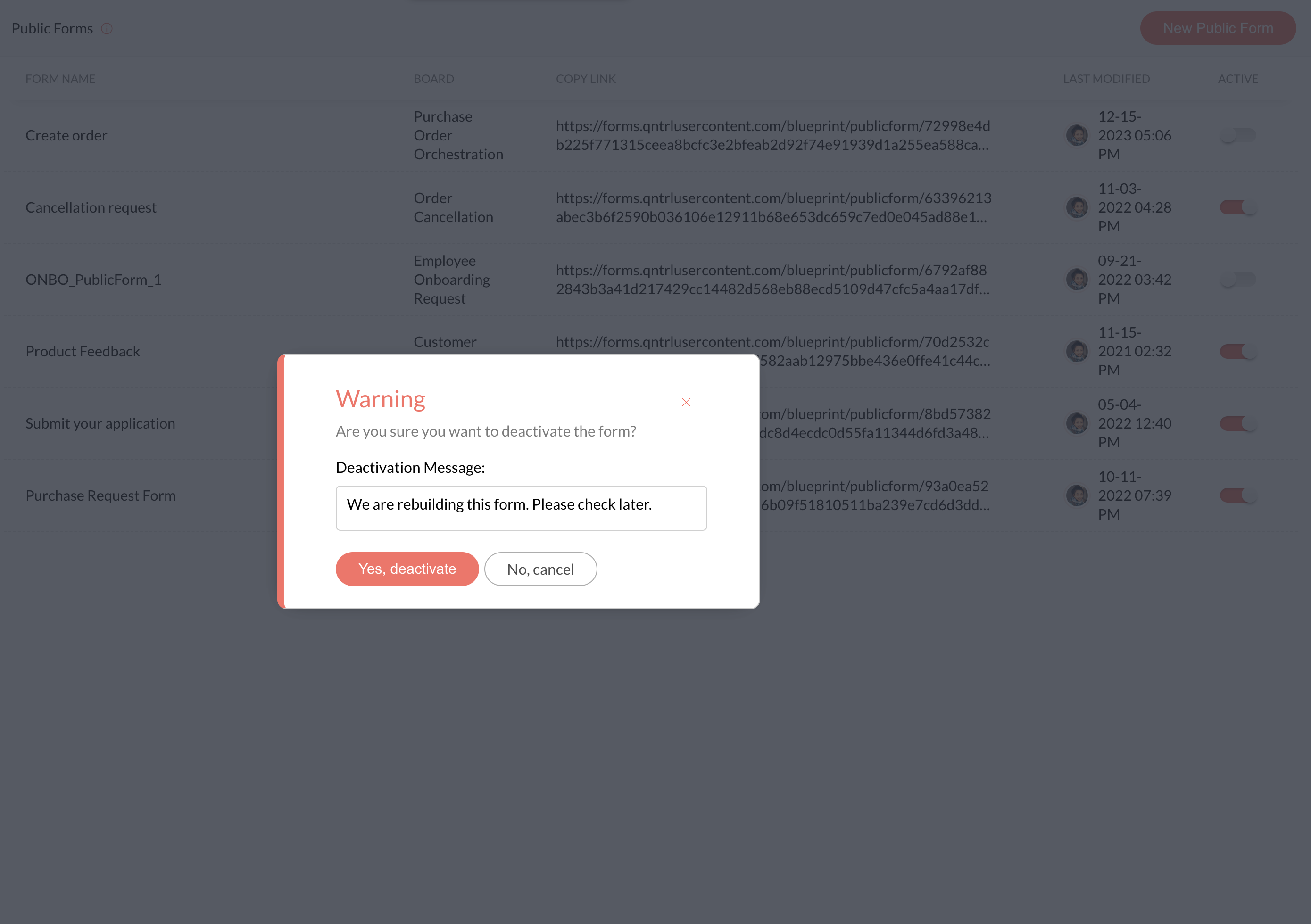 When a public form is deactivated, it will no longer be available for recipients to fill data. However, cards created using this public form will remain active.