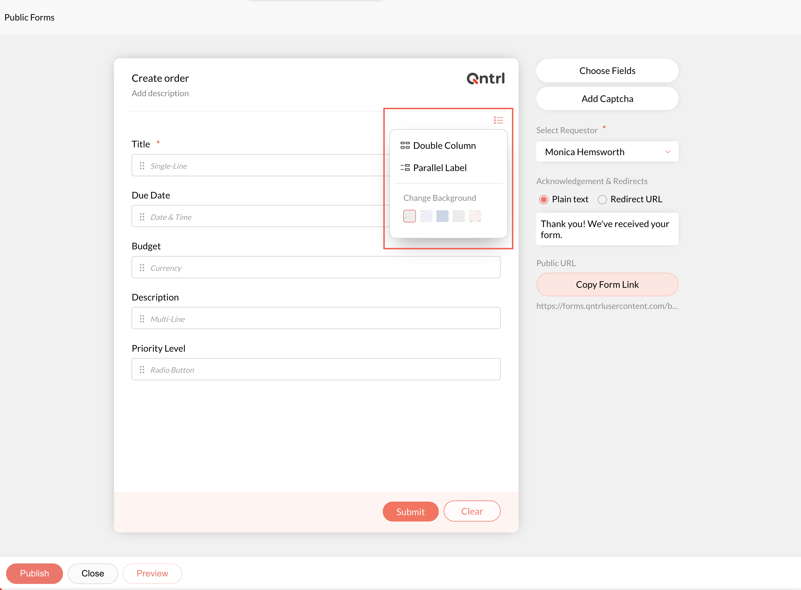 - Double Column - The fields of the public form will be displayed in two different columns.
