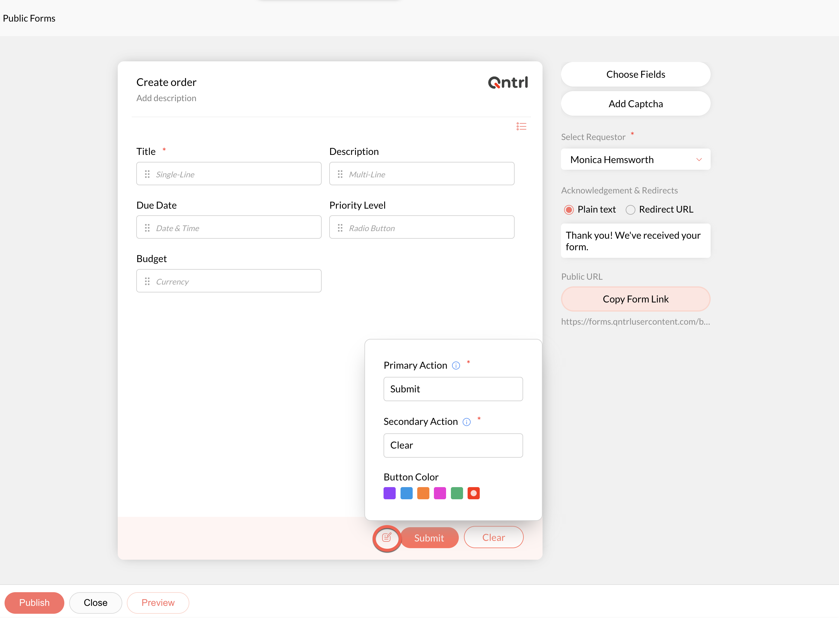 - To improve security in your public form, you can add a standard Captcha by clicking the Add Captcha button on the right.The captcha is automatically generated by Qntrl.