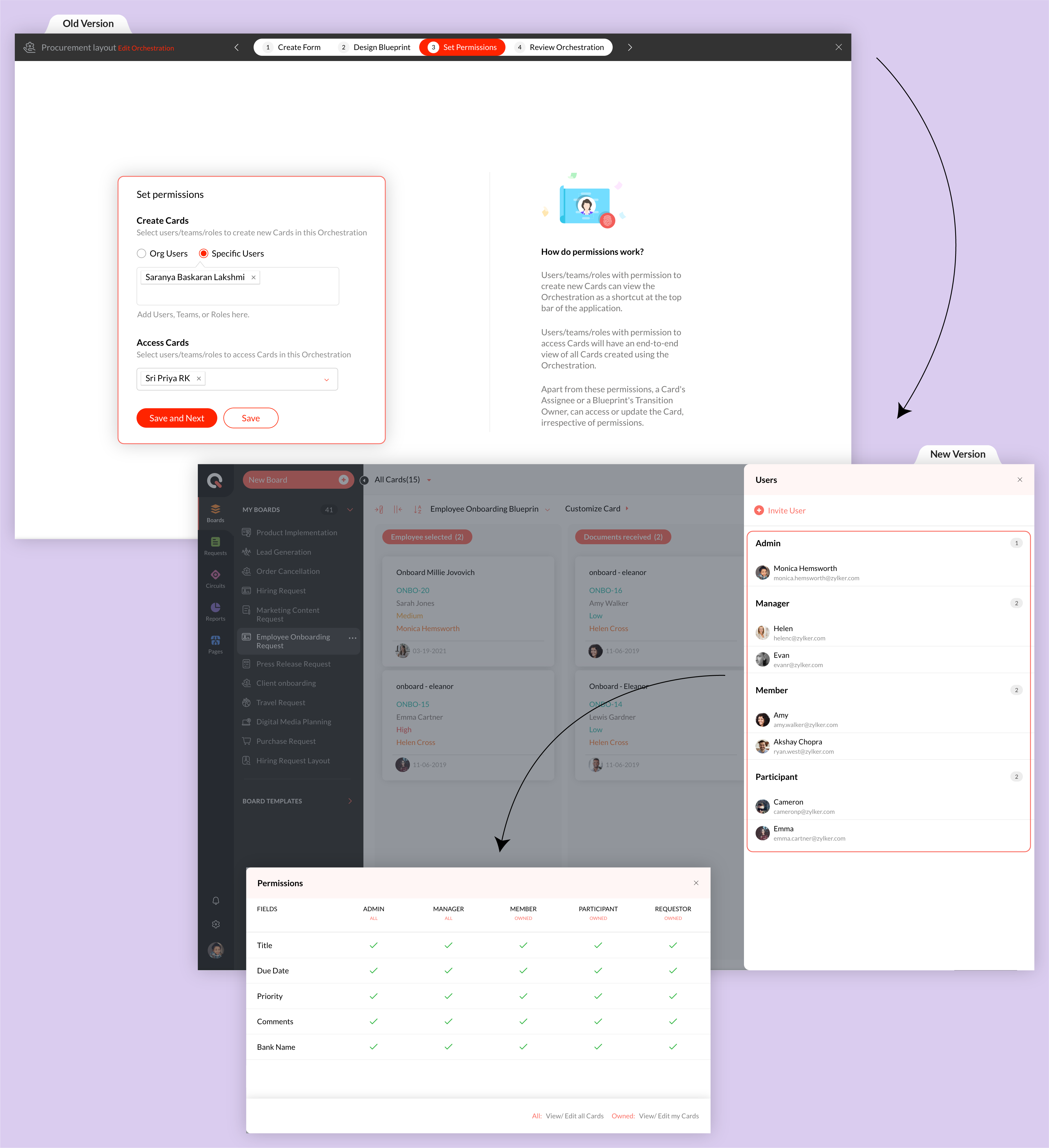 User permissions to access boards or cards can now be configured within each board independently. The configurations also reflect instantly in the board, eliminating the need to republish them. Each board has a separate option to manage users, requesters, and permissions. The user who creates a Board is the admin, and the other users added to the board can be customized with appropriate profiles and permissions.