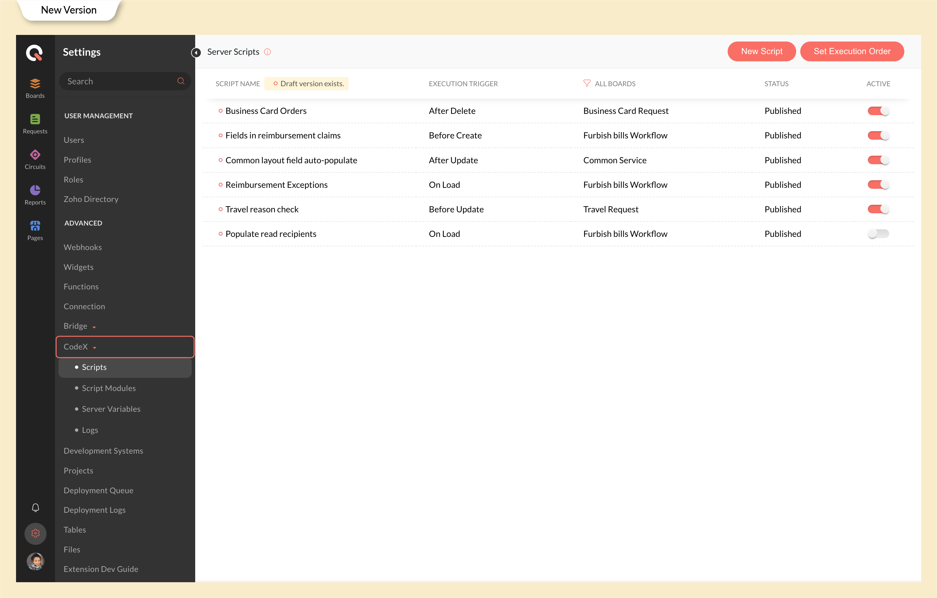 Server scripts are now called CodeX. You can code company-specific business logic to manage your database, perform time-consuming processes quickly, and automate activities in your business workflows using CodeX.