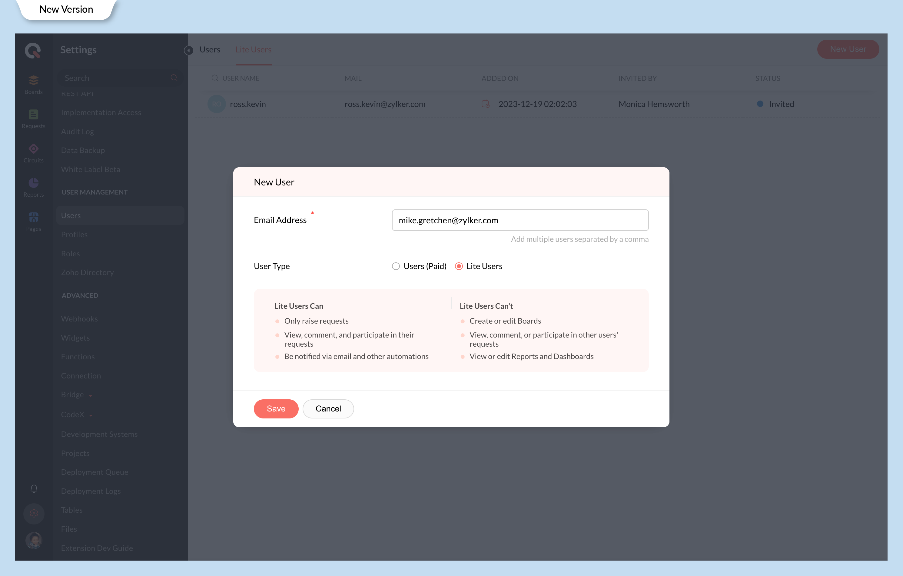 Our new Lite User model allows user additions where they can just create, view, and track their requests. Lite users do not require purchase of user license. However, if you’d like to convert them to conventional users, you’d have to purchase one.