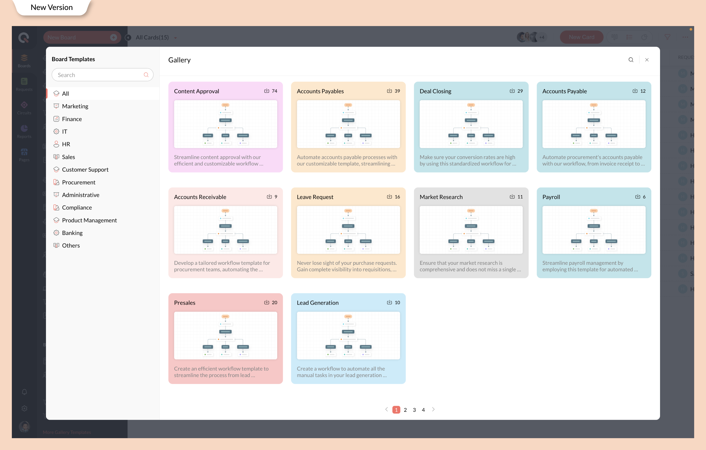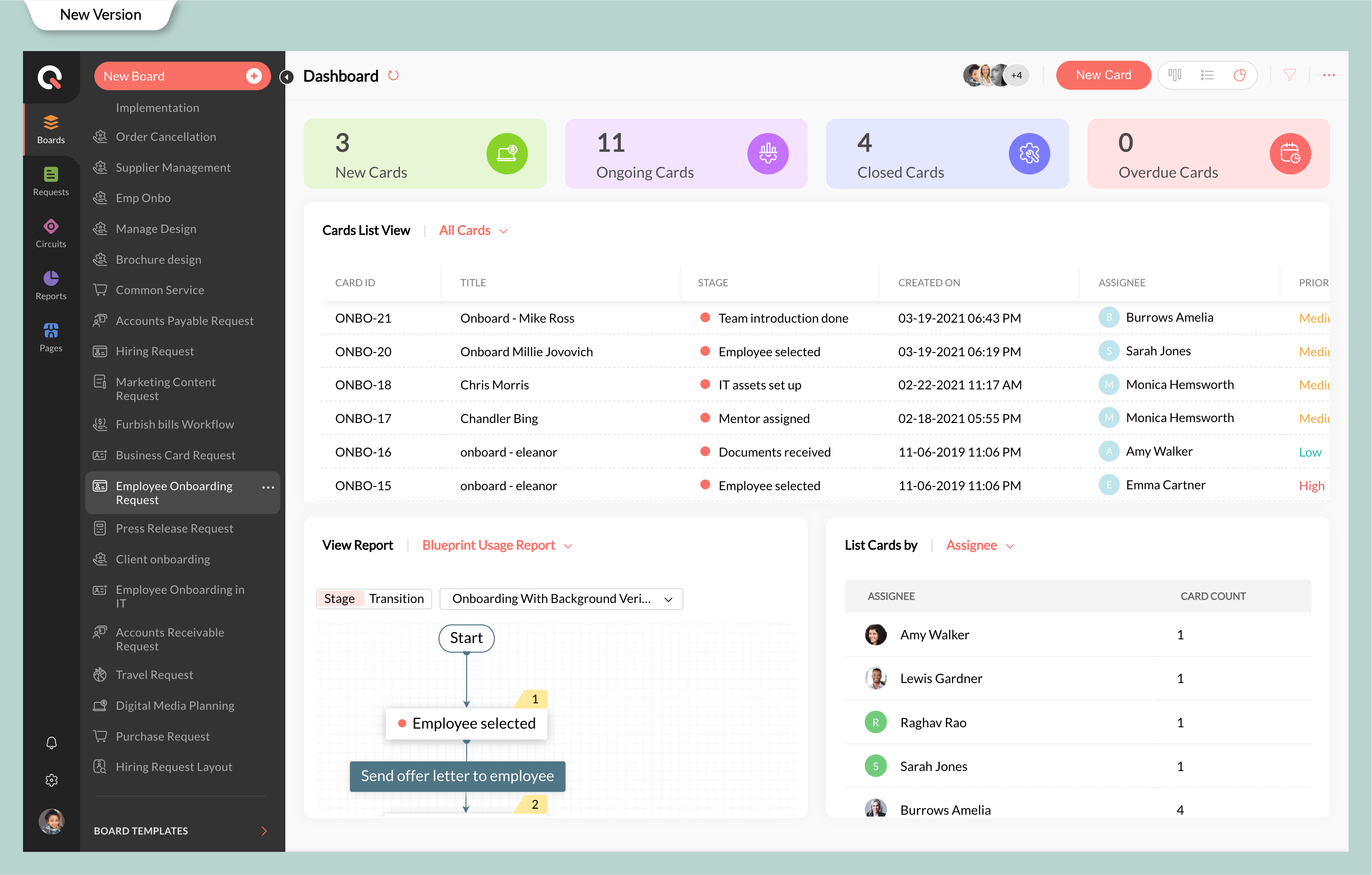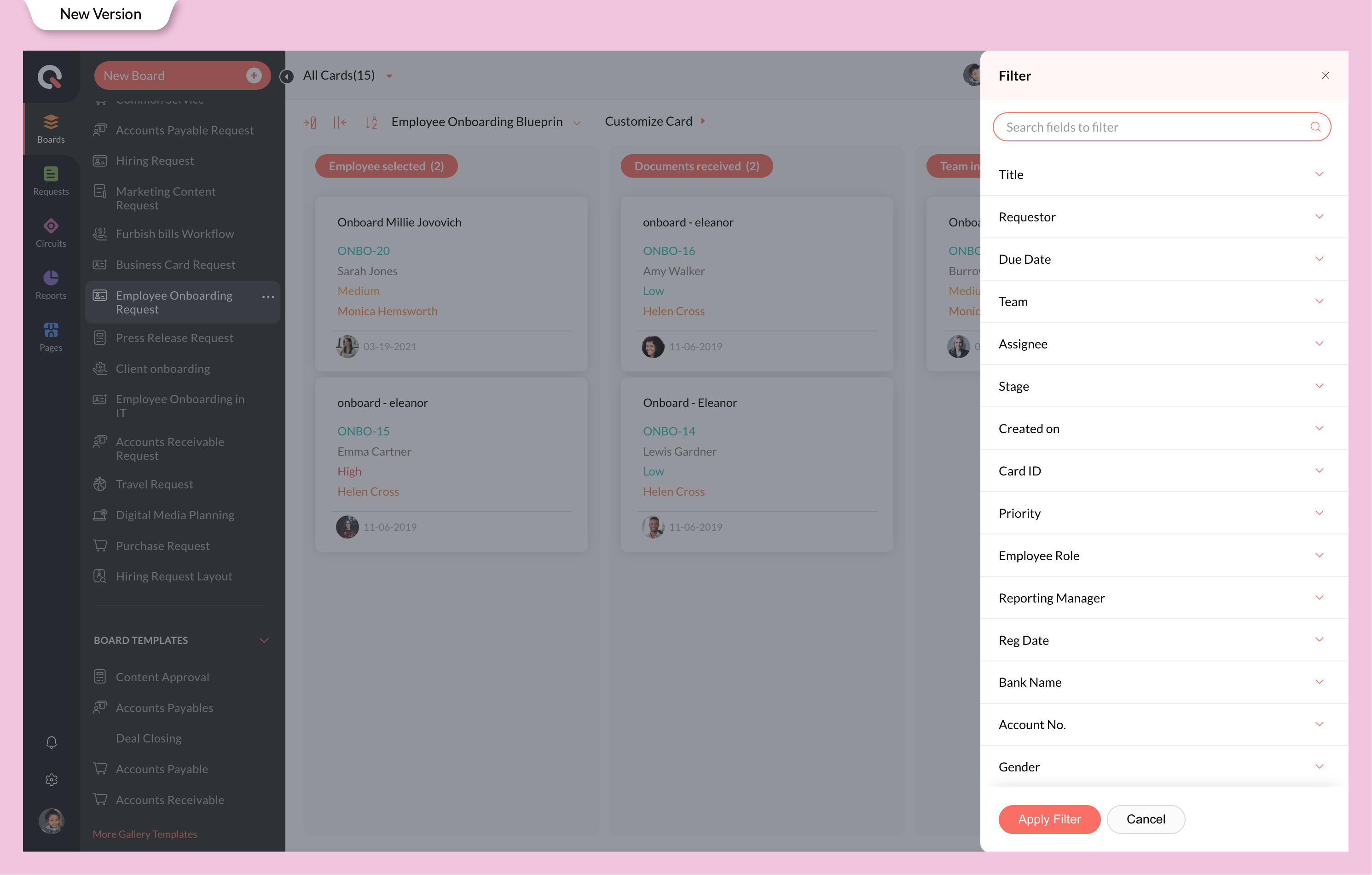 All navigation options have now been moved to the left-panel. We've deprecated the Cards tab from the top-panel and moved board short-cut tabs to the left panel. You can now access boards, templates, requests, reports, and settings from the left navigation options. Each board is also equipped with quick access options where you can edit, manage, and add automation options.