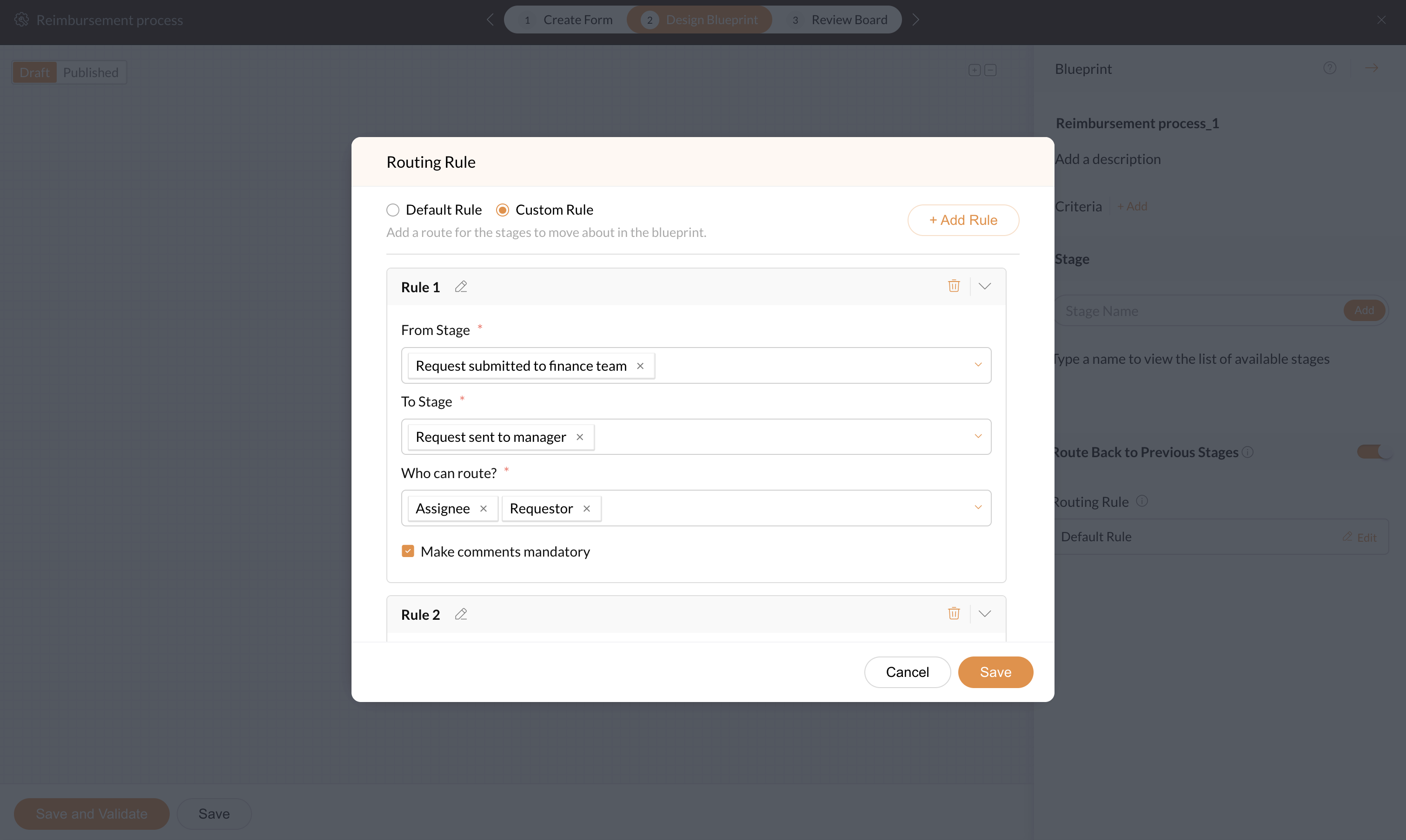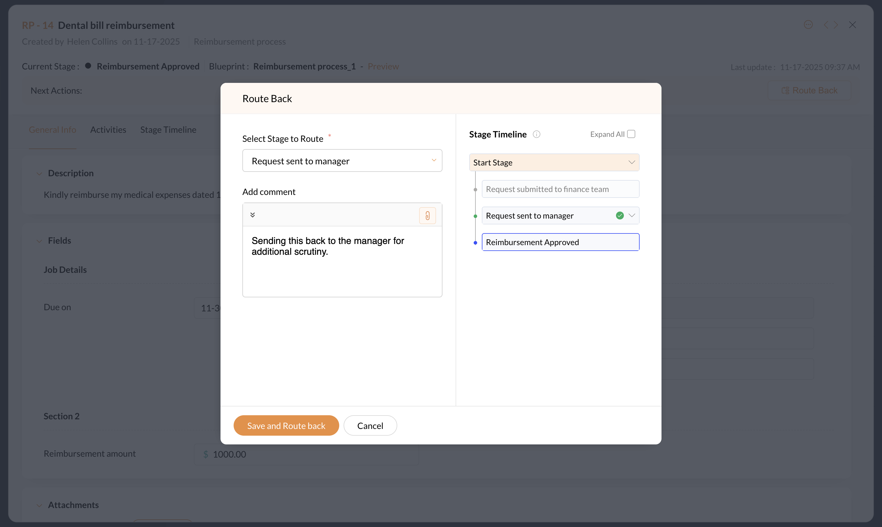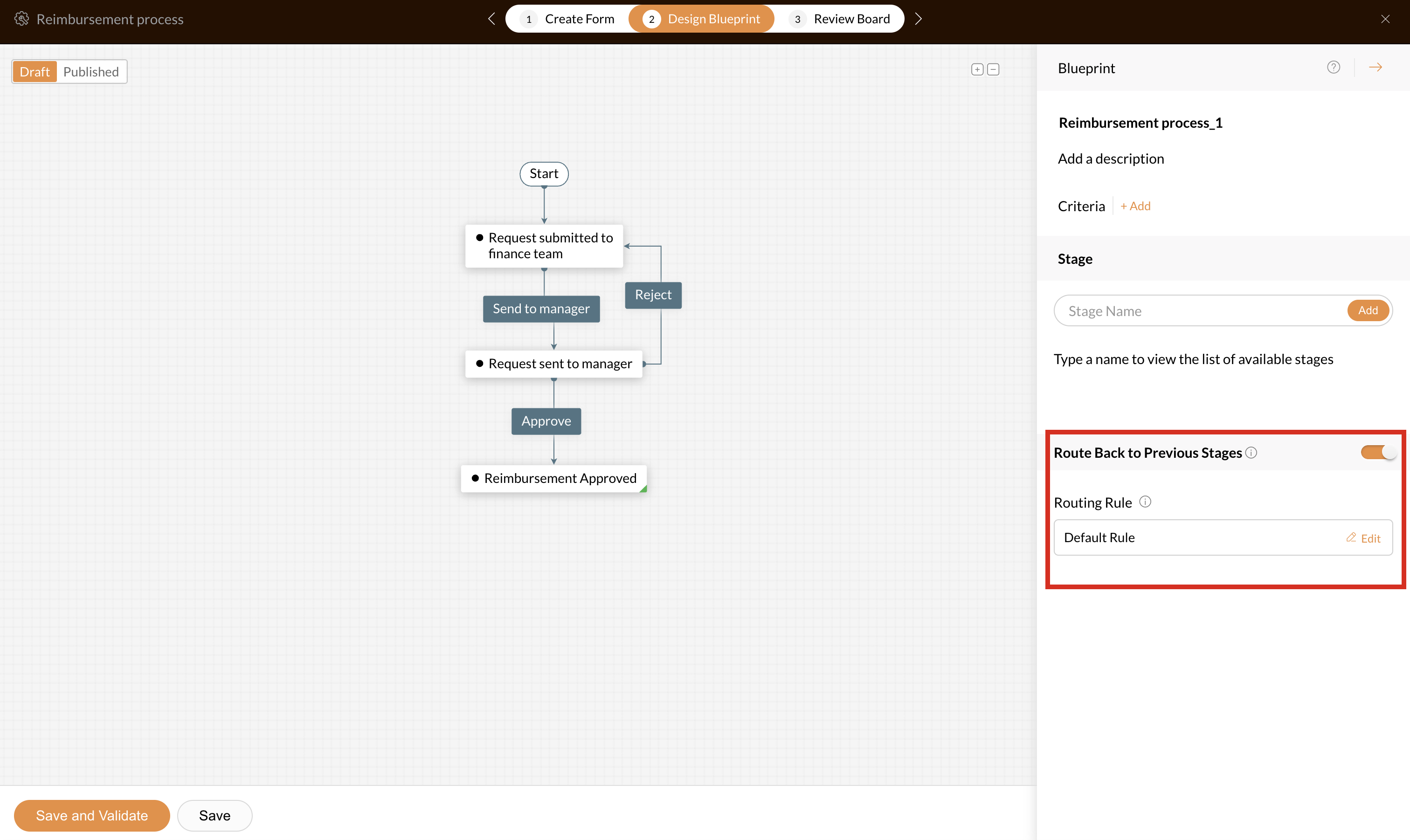 Route Back allows users to backtrack a card to one of its previous stages and restart the blueprint execution. Route Back offers a default configuration rule that allows routing between all stages. Custom rules can also be created to override the default rules, where you can choose the stages between which the cards can route.