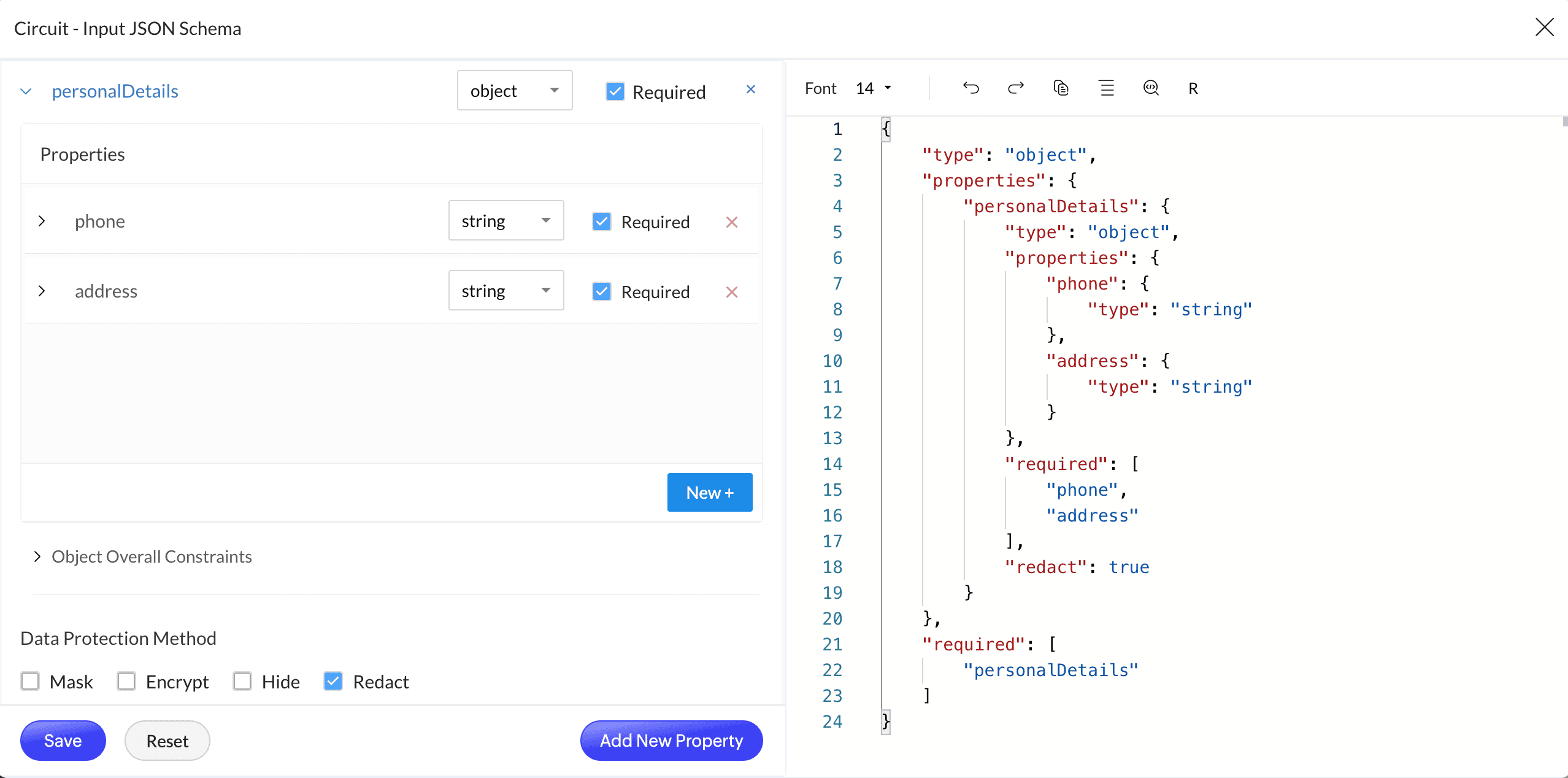 {"type": "object","properties": {"fullName": { "type": "string", "title": "Full Name" },"email": { "type": "string", "title": "Work Email", "encrypt": true },"personalDetails": {"type": "object","title": "Personal Details","properties": {"phone": { "type": "string", "title": "Phone Number", "hide": true },"address": { "type": "string", "title": "Home Address", "redact": true }}}}}
