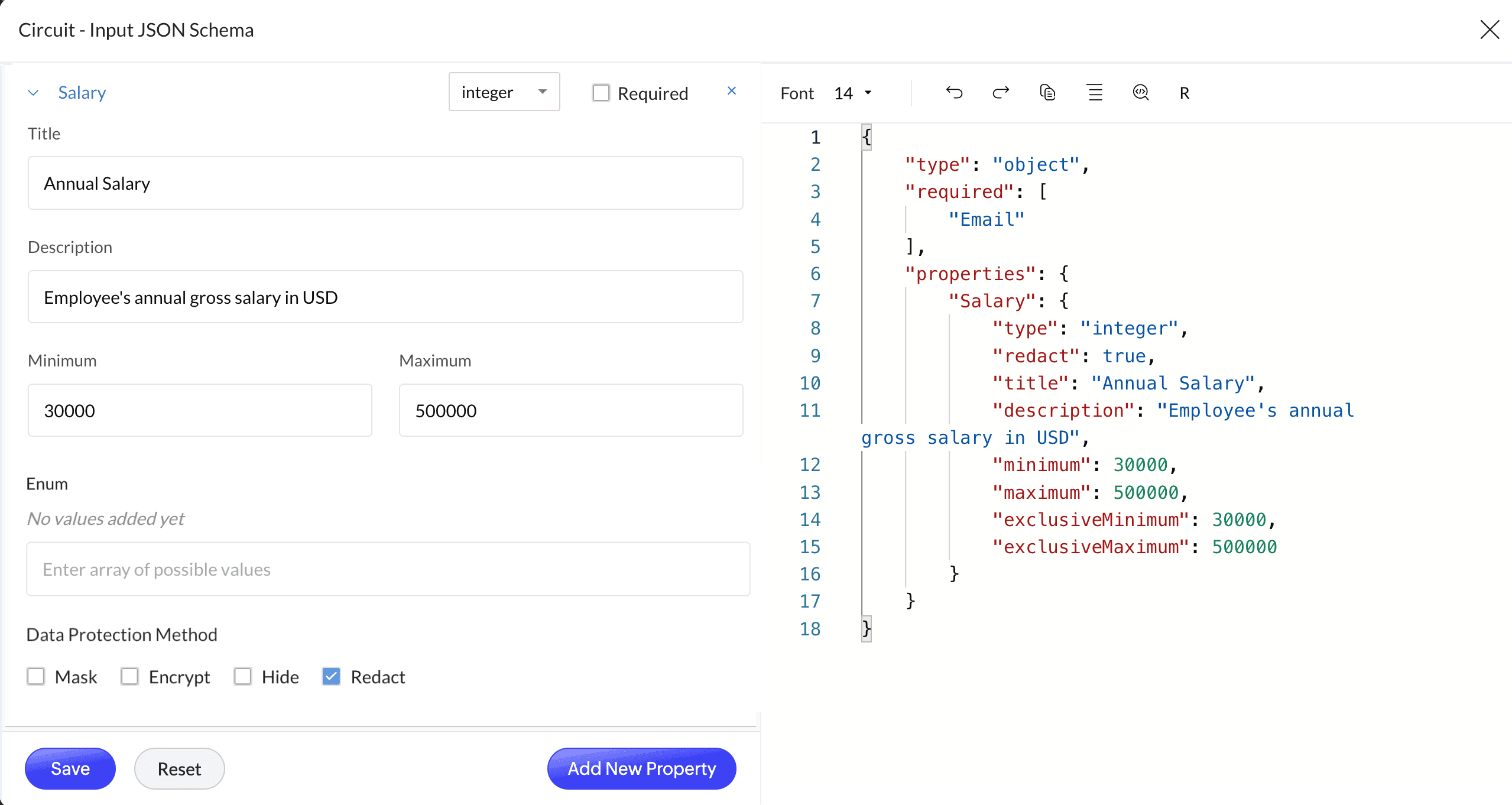 { "type": "object", "required": ["employeeId", "fullName", "email", "department"], "properties": { "employeeId": { "type": "integer", "title": "Employee ID", "mask": true }, "fullName": { "type": "string", "title": "Full Name" }, "email": { "type": "string", "title": "Work Email", "encrypt": true }, "department": { "type": "string", "title": "Department", "redact": true }, "salary": { "type": "number", "title": "Annual Salary", "redact": true } }}{"employeeId": “100423”,"fullName": "Sarah Mitchell","department": "Engineering","salary": “95000”}