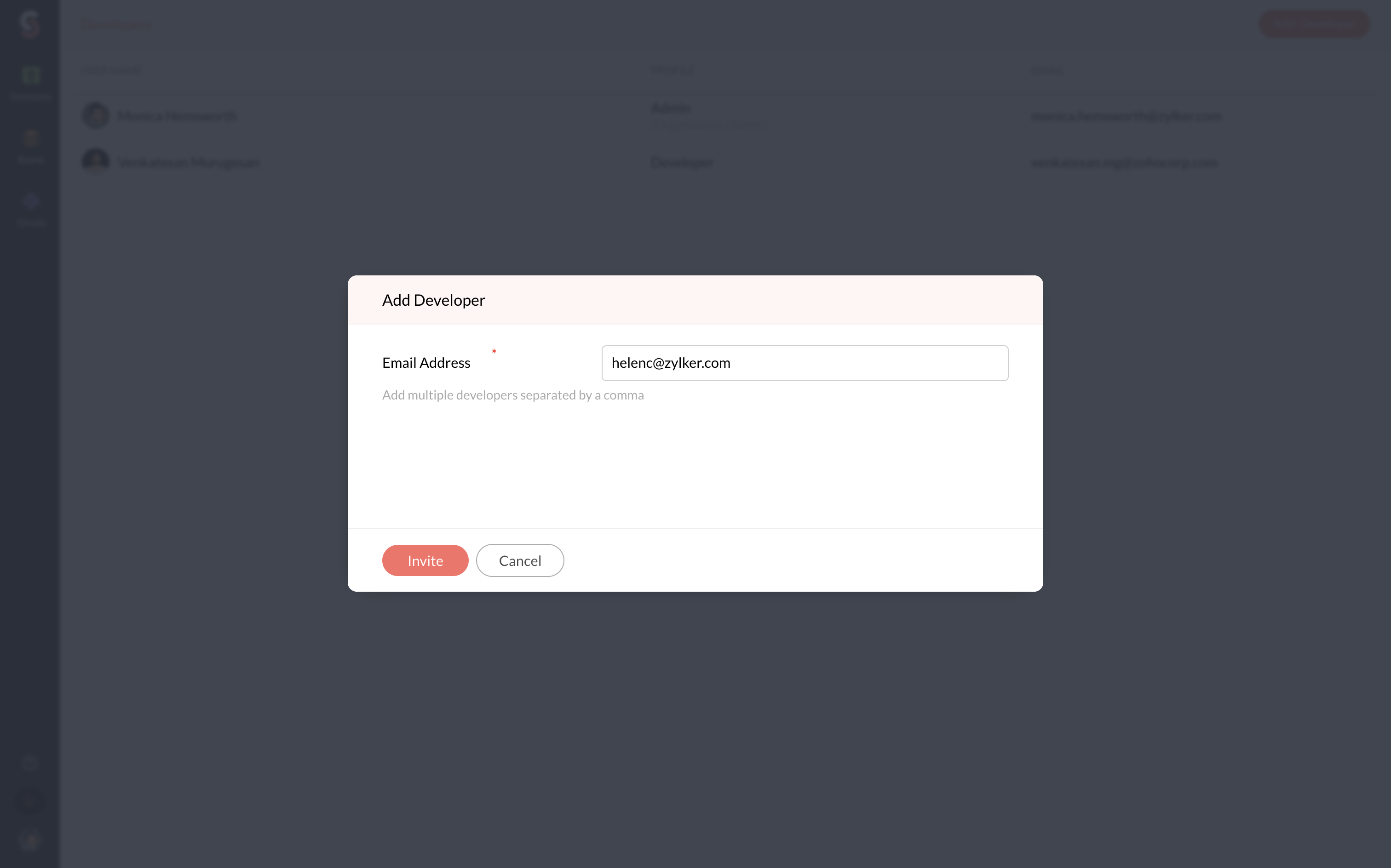 - Enter the developer’s name, email address, and role with respect to the workspace.