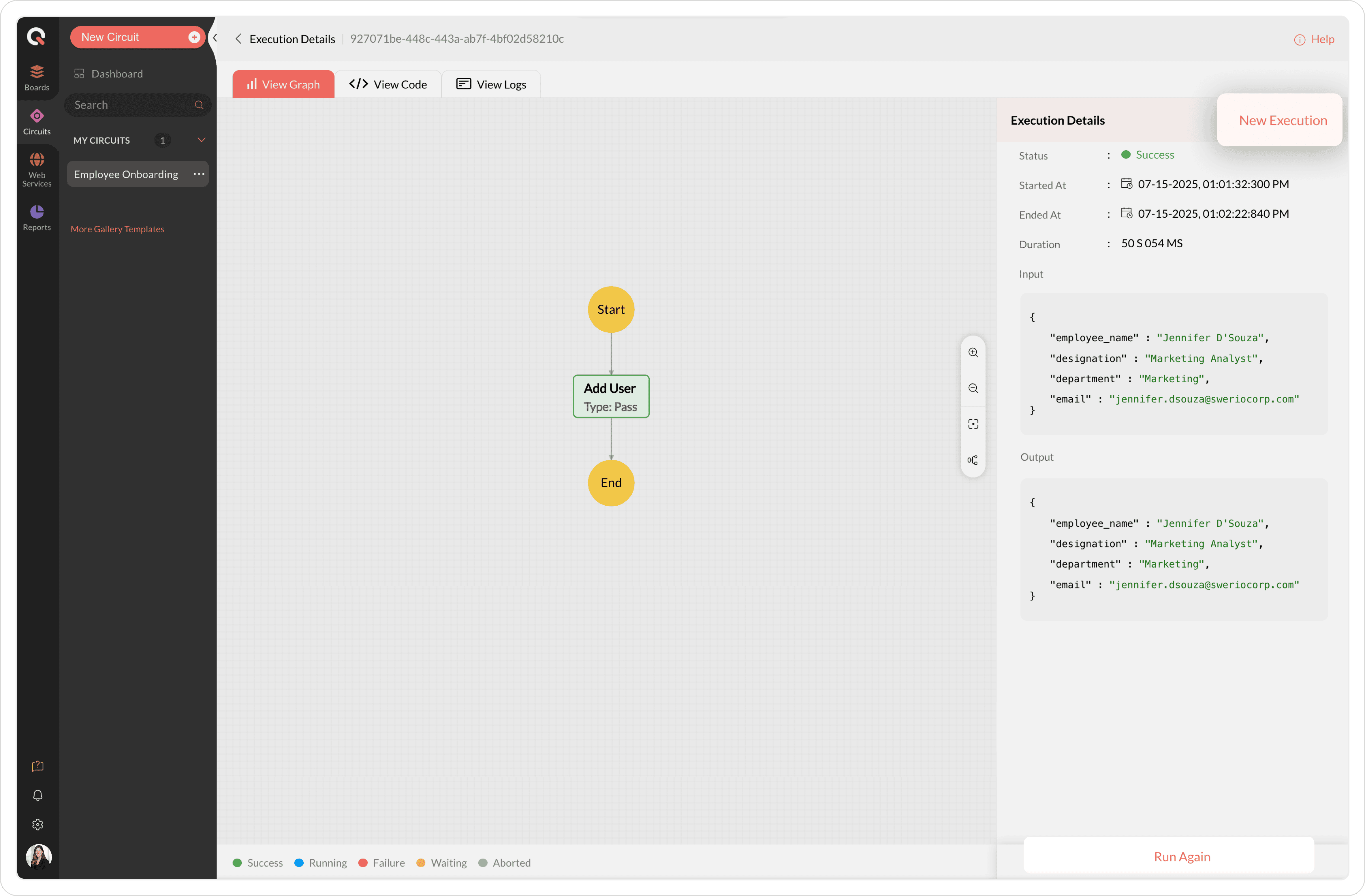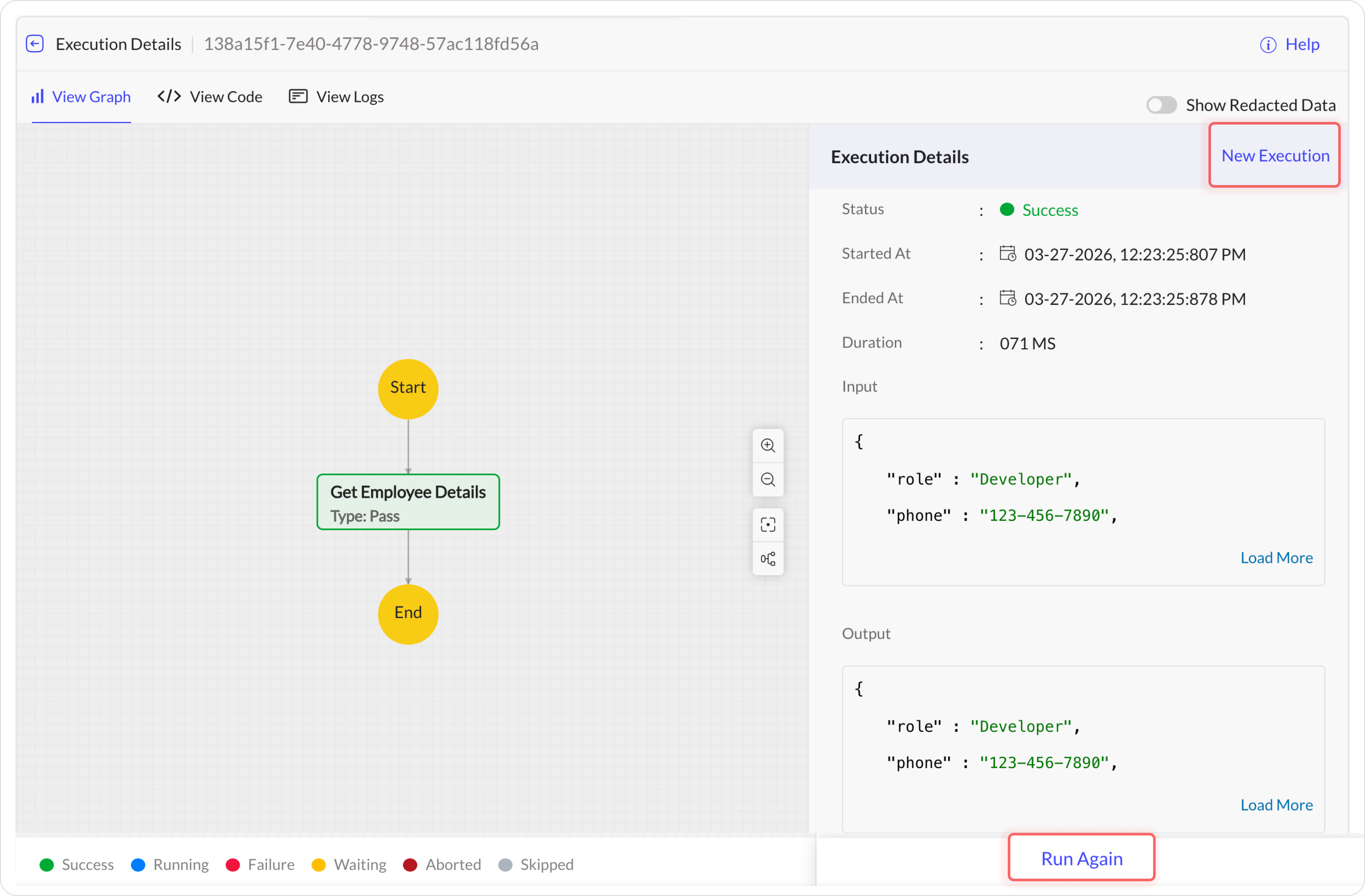 New Execution: To initiate a new execution, click the New Execution button at the top-right corner of the execution details page.