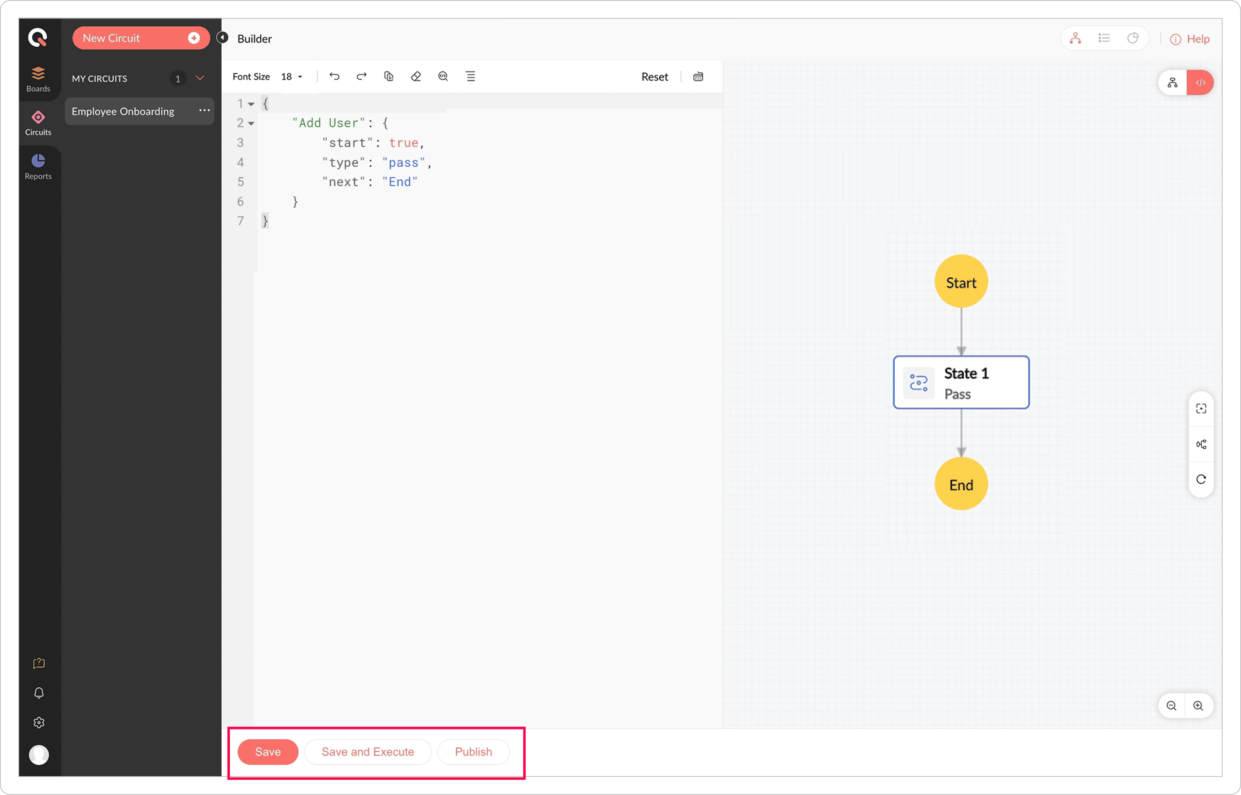 Save and Execute: Saves and immediately runs the circuit without publishing. This is typically used for testing purposes.