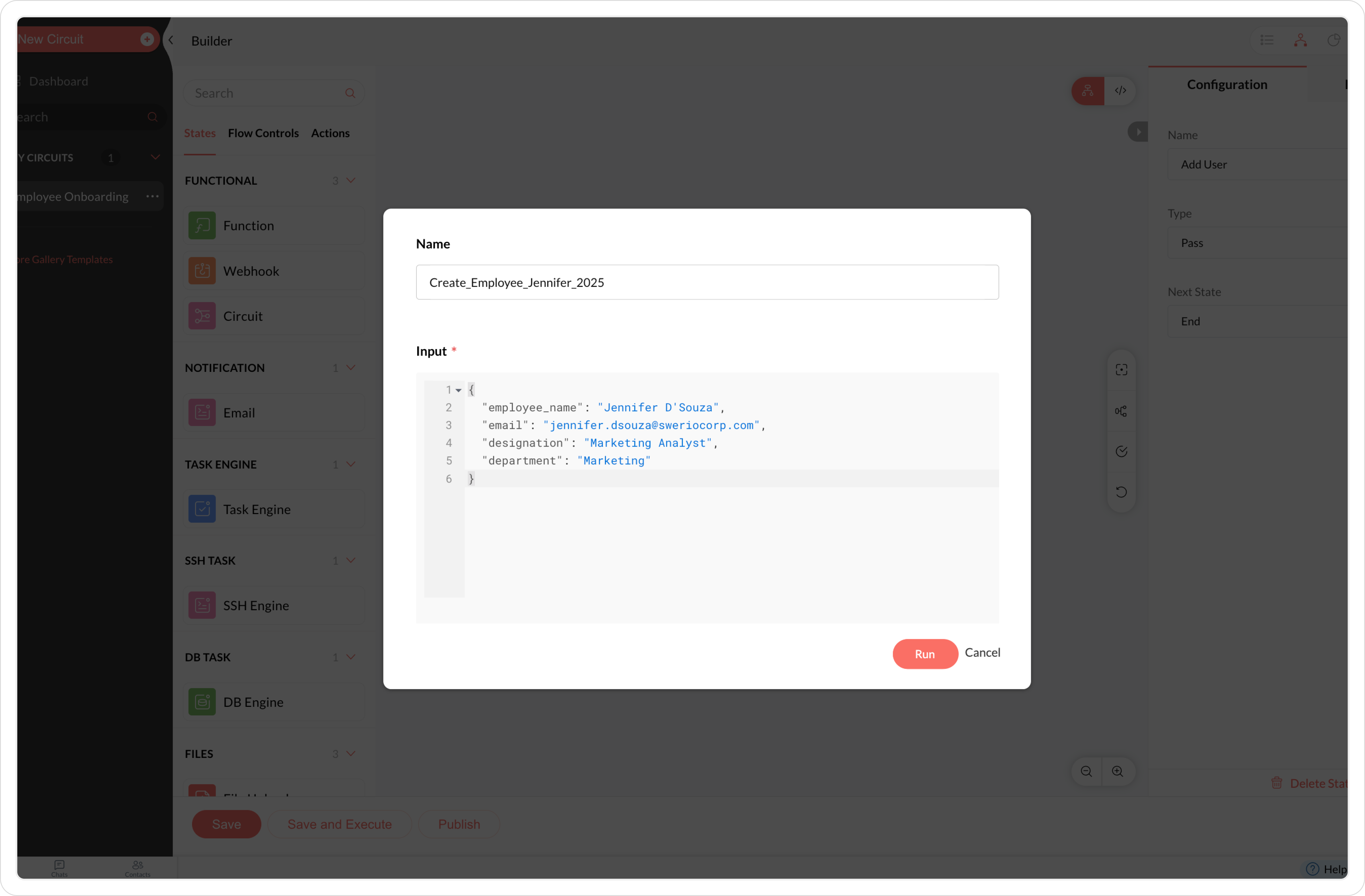 Clicking Save and Execute opens a pop-up window with a predefined JSON input.