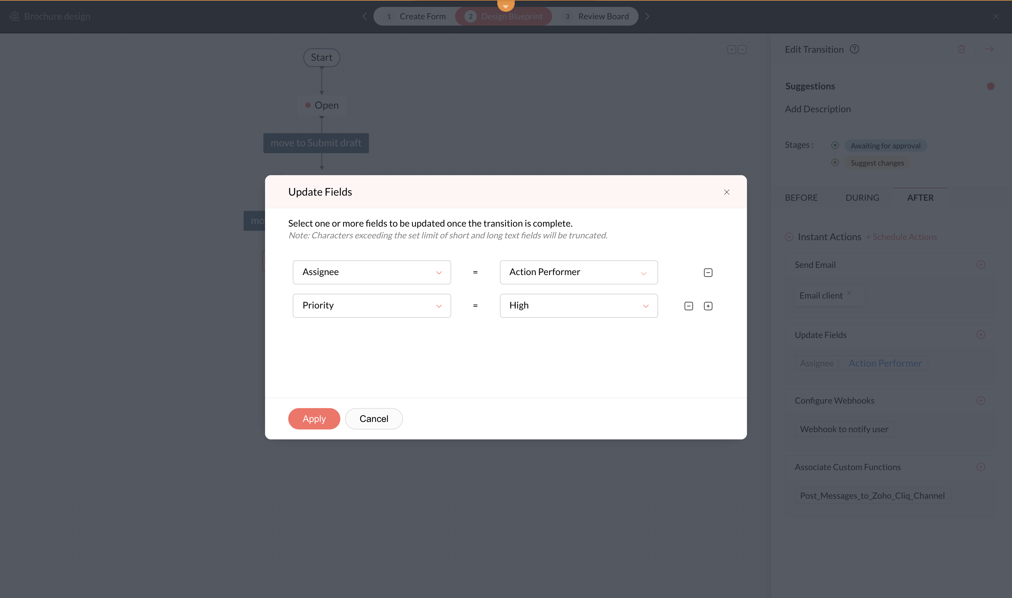 You may need to modify field values in your card at various stages. For example, the predicted completion date for the card may vary depending on the progress of the card. Use the Update Fields option to update field values (such as the due date) when a particular action is completed. Update Fields is available in Blueprints and Business rules.