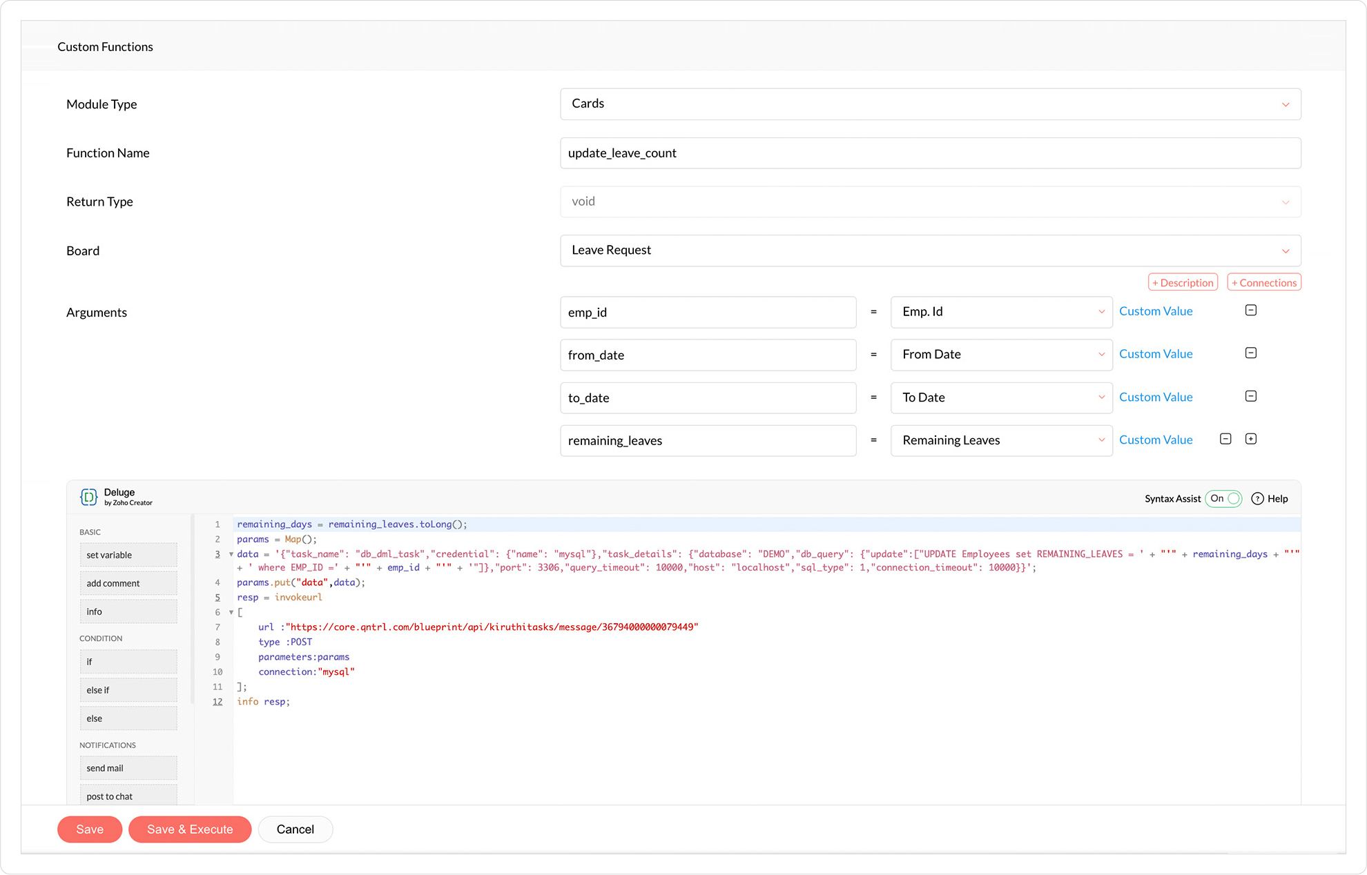 remaining_days = remaining_leaves.toLong();params = Map();data = '{"task_name": "db_dml_task","credential": {"name": "mysql"},"task_details": {"database": "DEMO","db_query": {"update":["UPDATE Employees set REMAINING_LEAVES = ' + "'" + remaining_days + "'" + ' where EMP_ID =' + "'" + emp_id + "'" + '"]},"port": 3306,"query_timeout": 10000,"host": "localhost","sql_type": 1,"connection_timeout": 10000}}';params.put("data",data);resp = invokeurl[url :"https://core.qntrl.in/blueprint/api/manikin001/message/6124000000050557"type :POSTparameters:paramsconnection:"<CONNECTION NAME>"];info resp;