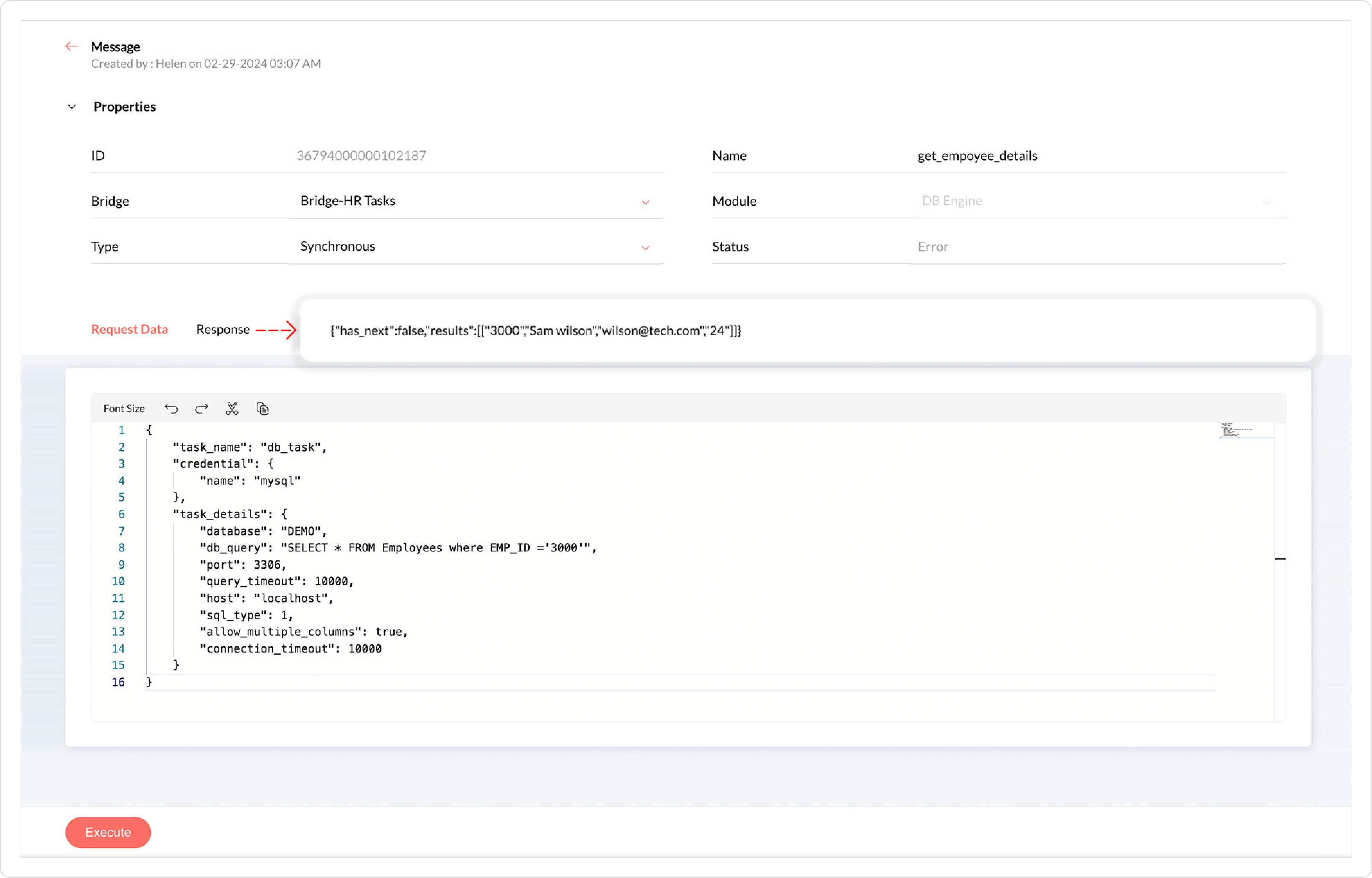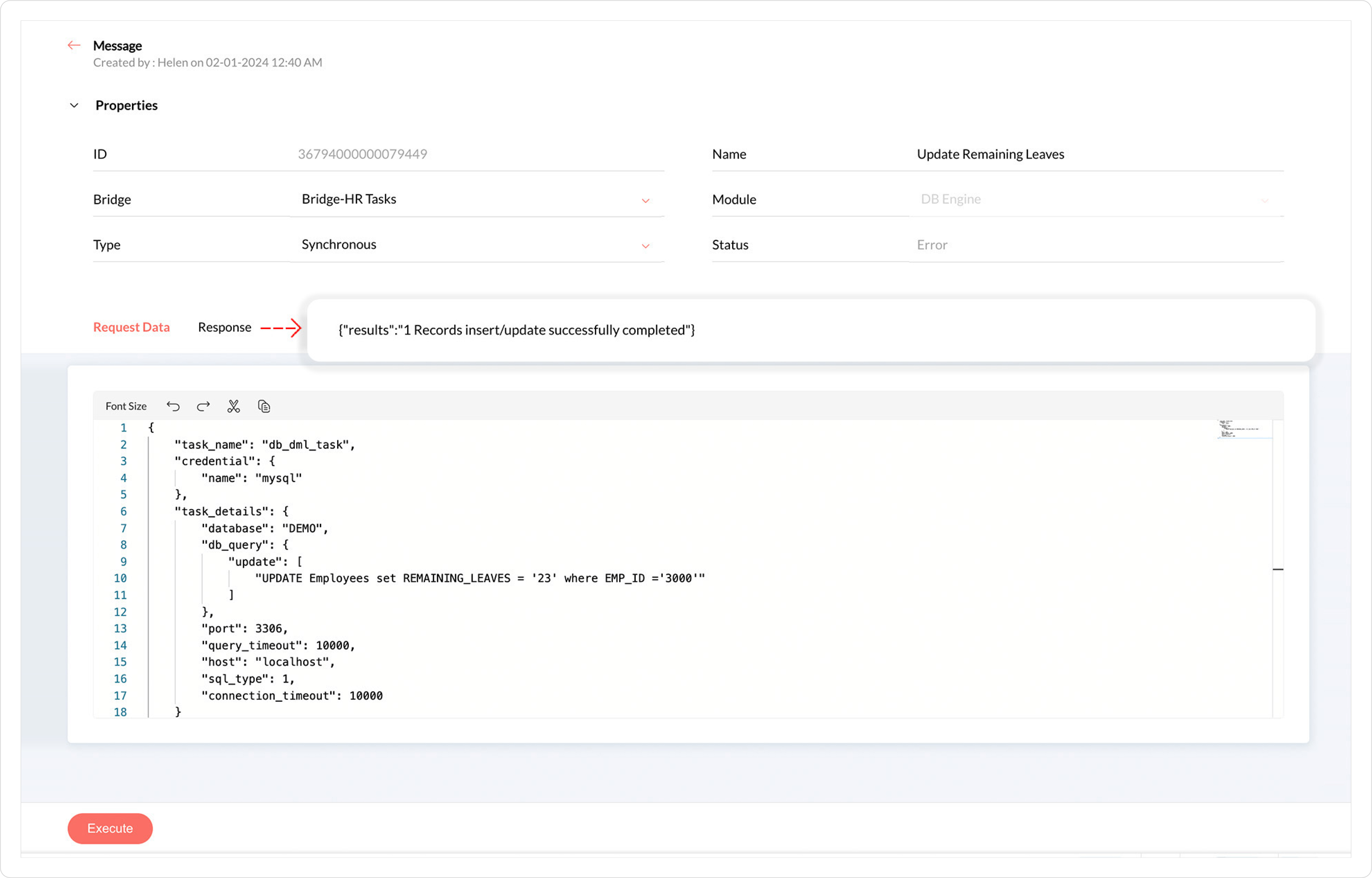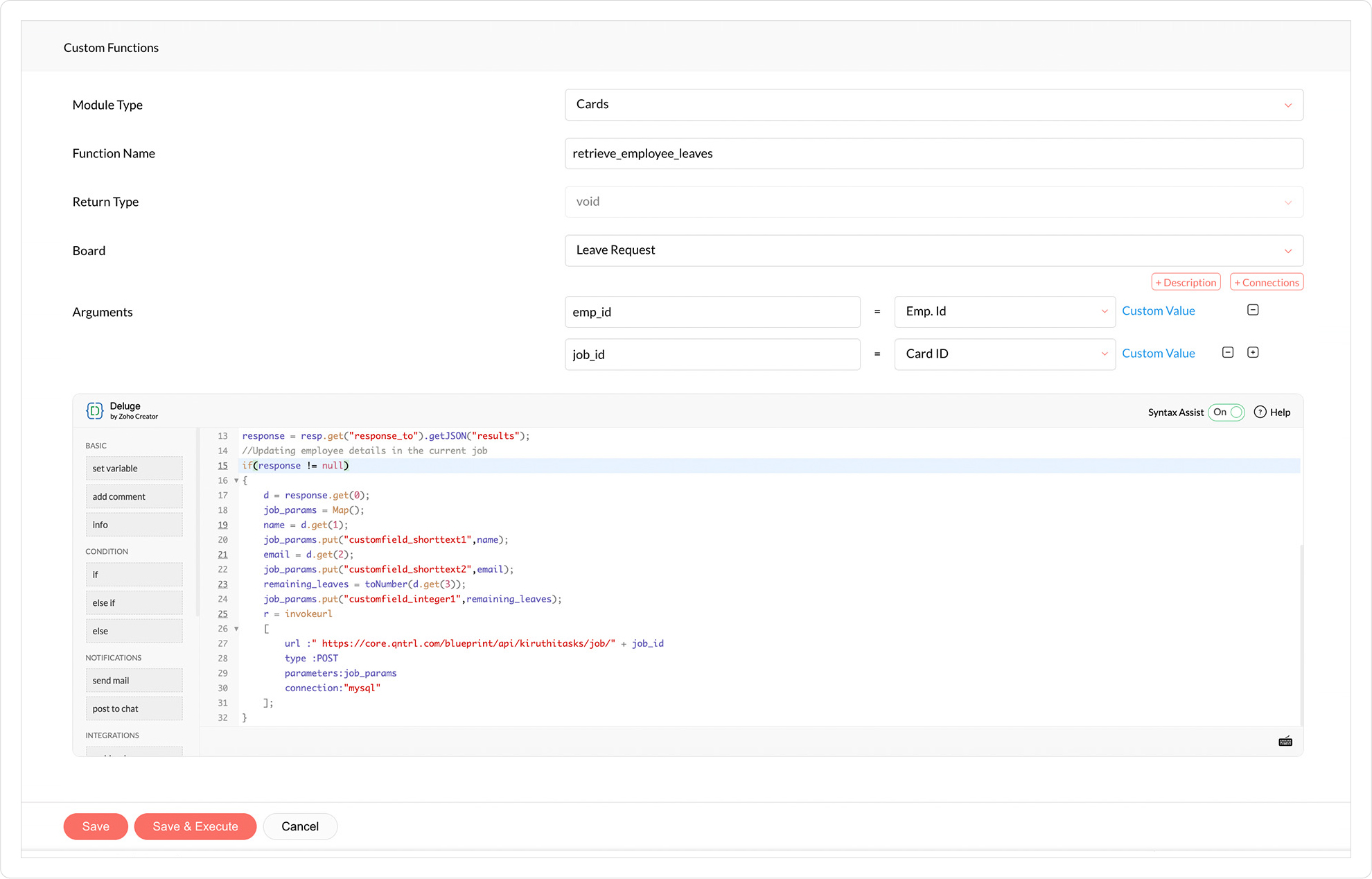 params = Map();data = '{"task_name": "db_task","credential": {"name": "mysql"},"task_details": {"database": "DEMO","db_query": "SELECT * FROM Employees where EMP_ID =' + "'" + emp_id + "'" + '","port": 3306,"query_timeout": 10000,"host": "localhost","sql_type": 1,"connection_timeout": 10000,"allow_multiple_columns": true}}';params.put("data",data);resp = invokeurl[url :"https://core.qntrl.in/blueprint/api/manikin001/message/6124000000050437"type :POSTparameters:paramsconnection:"<CONNECTION NAME>"];info resp;response = resp.get("response_to").getJSON("results");//Updating employee details in the current jobif(response != null){d = response.get(0);job_params = Map();name = d.get(1);job_params.put("customfield_shorttext1",name);email = d.get(2);job_params.put("customfield_shorttext2",email);remaining_leaves = toNumber(d.get(3));job_params.put("customfield_integer1",remaining_leaves);r = invokeurl[url :" https://core.qntrl.in/blueprint/api/manikin001/job/" + job_idtype :POSTparameters:job_paramsconnection:"<CONNECTION NAME>"];}