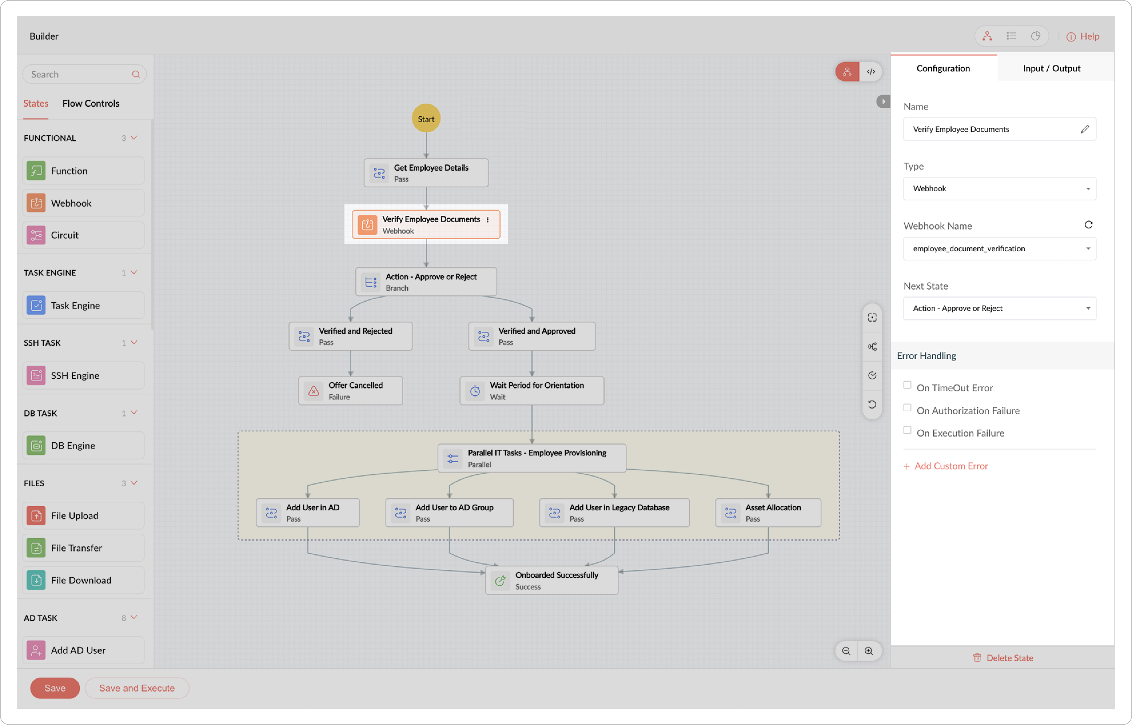 Example Use Case: When it comes to the employee onboarding process, the Webhook state can be employed for electronic document verification procedures. This is accomplished by establishing a connection between the verification service provider and configuring it to transmit verification results or updates to your webhook endpoint. By analyzing the response received, the subsequent course of action can be configured.